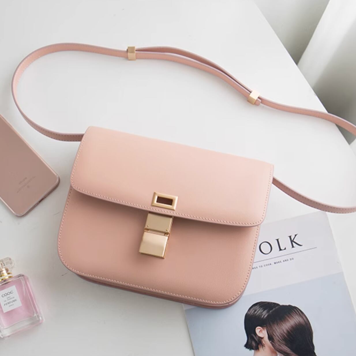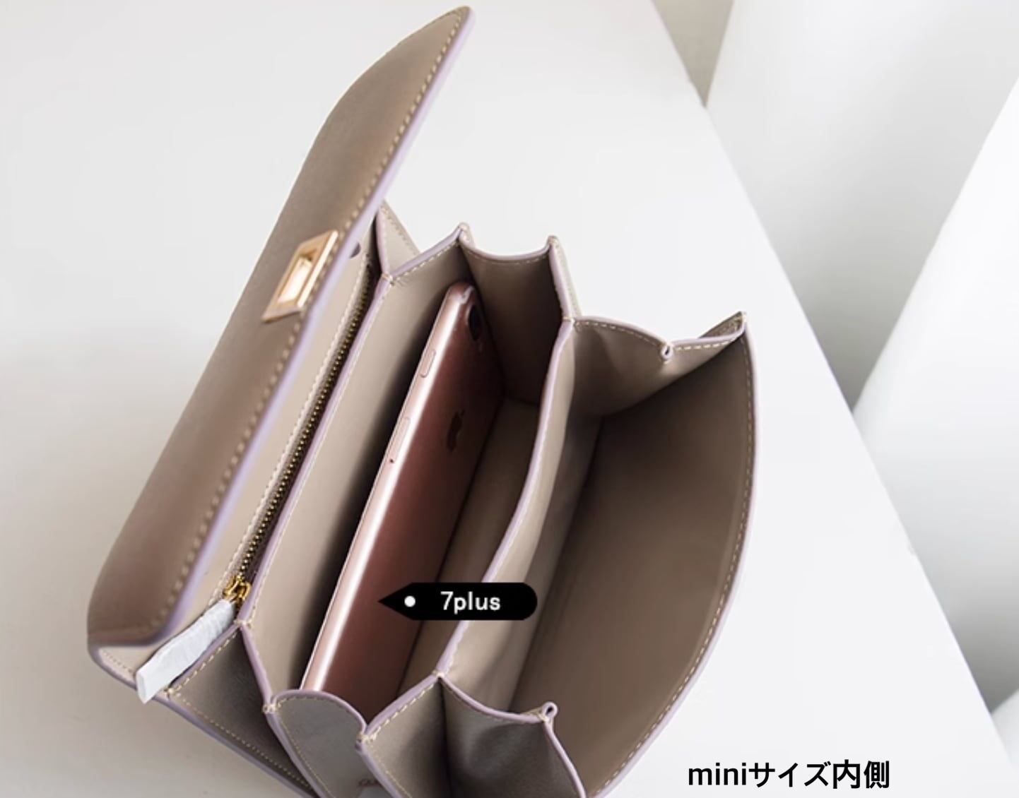 女性らしいややコンパクトなサイズ感ですが、二つ折りウォレットやスマートフォンなど身に付けたい必需品が収納可能です。