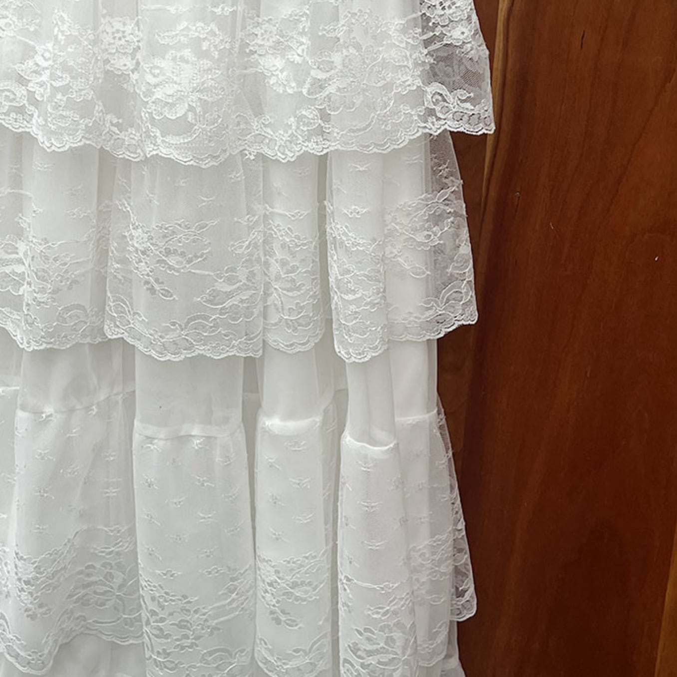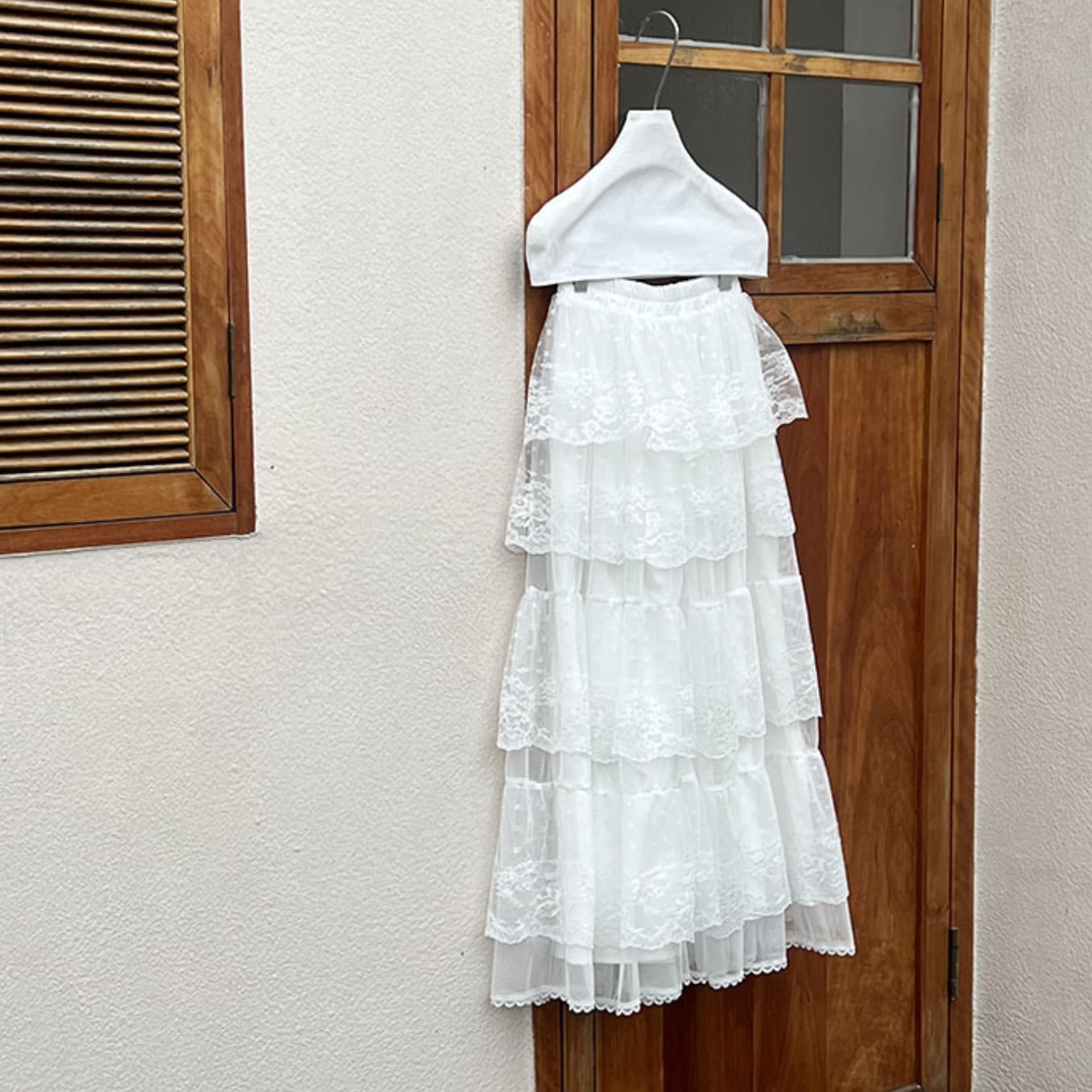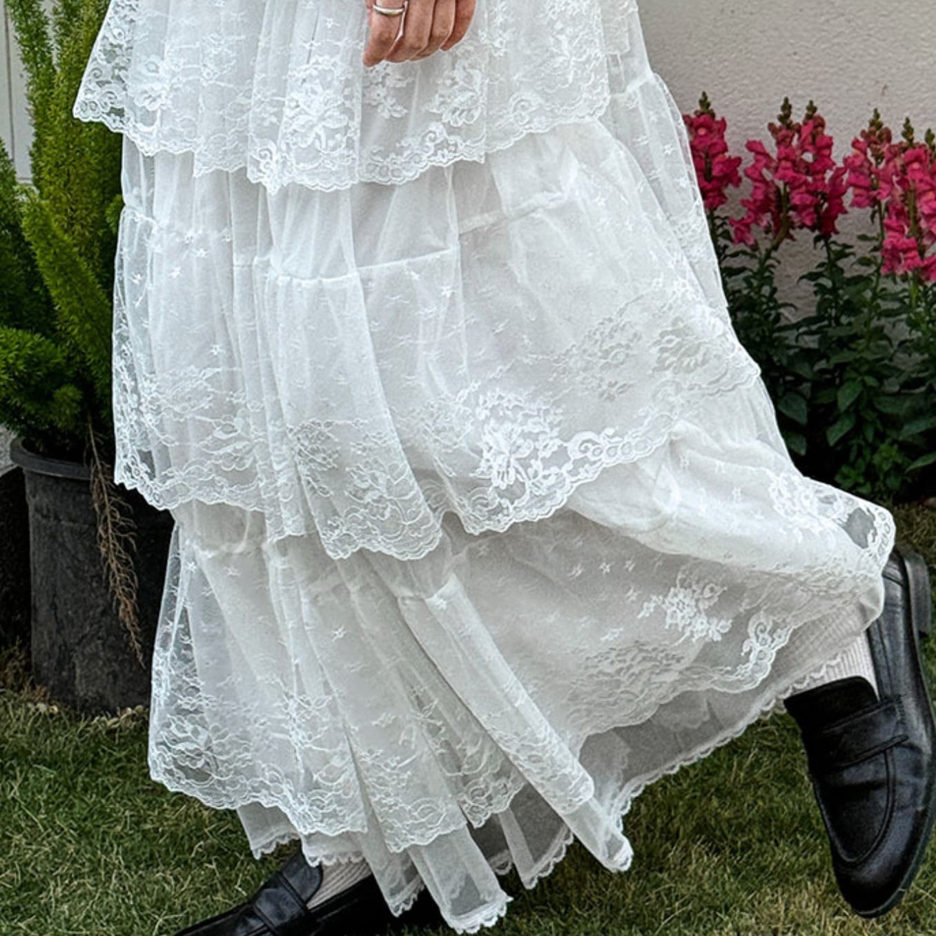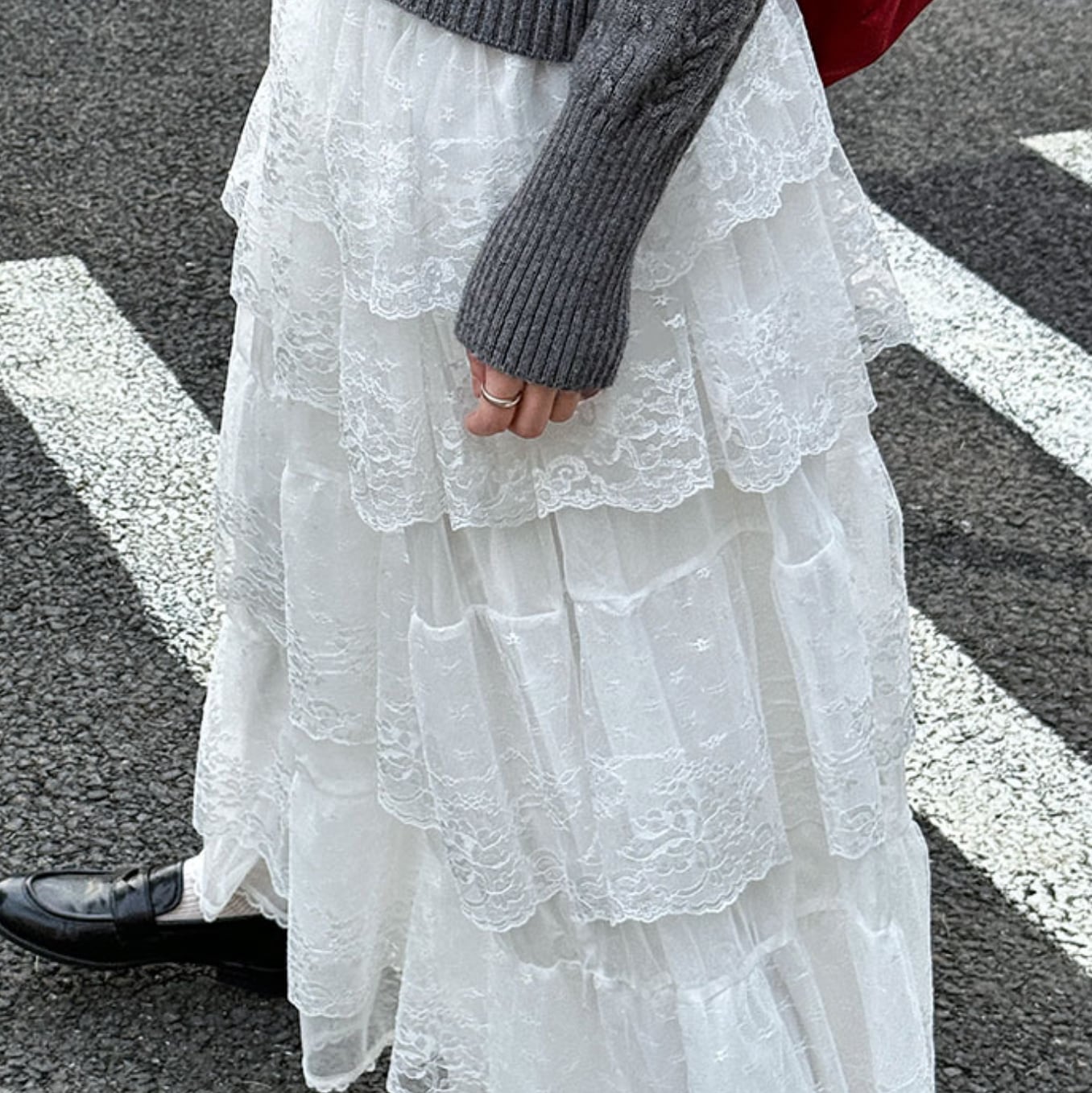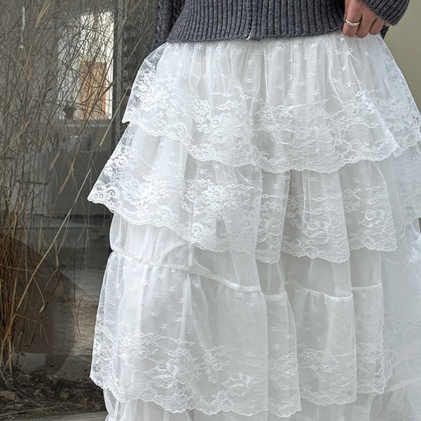 ボリューミーさが可愛いレースフレアロングスカート。