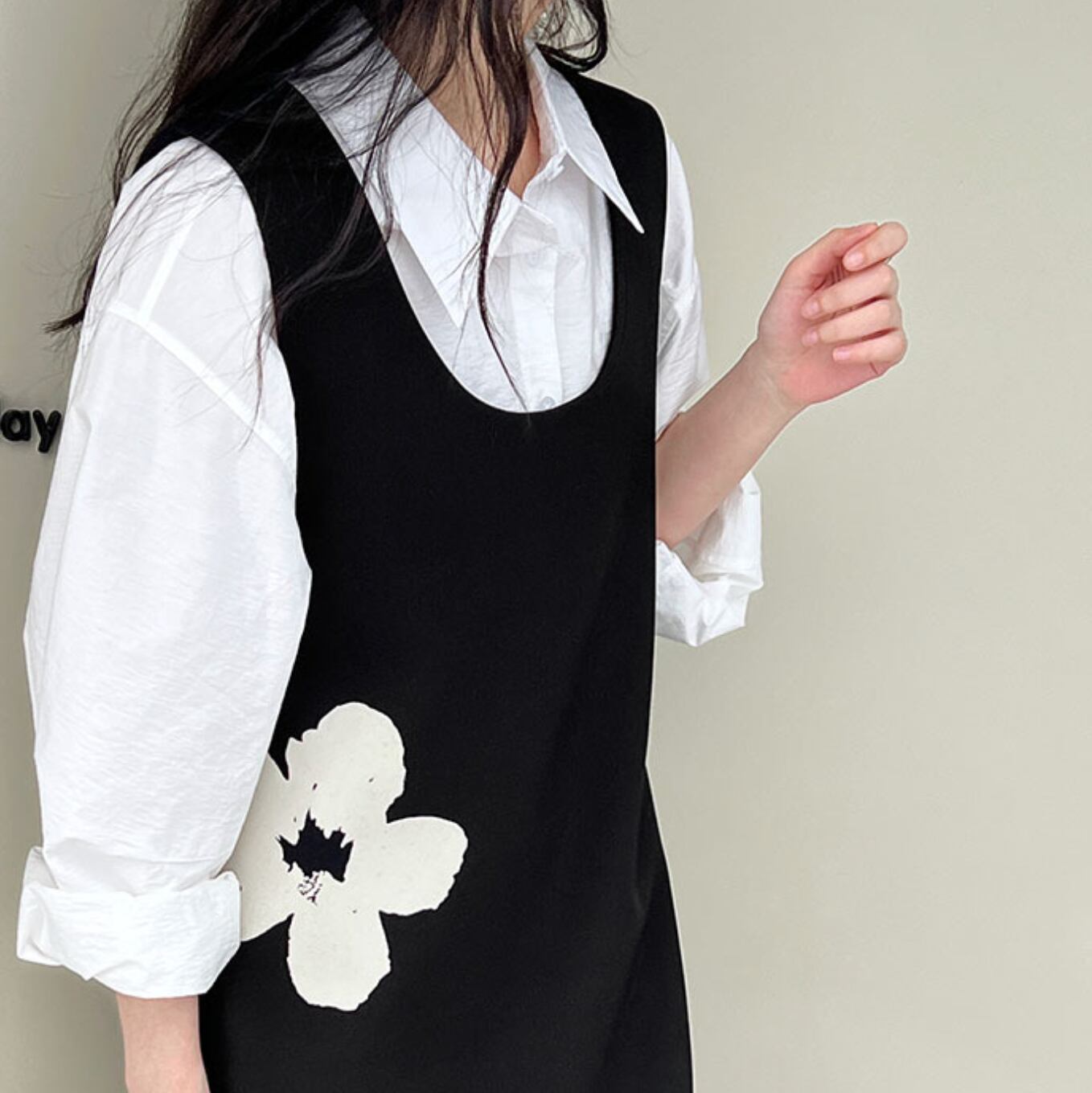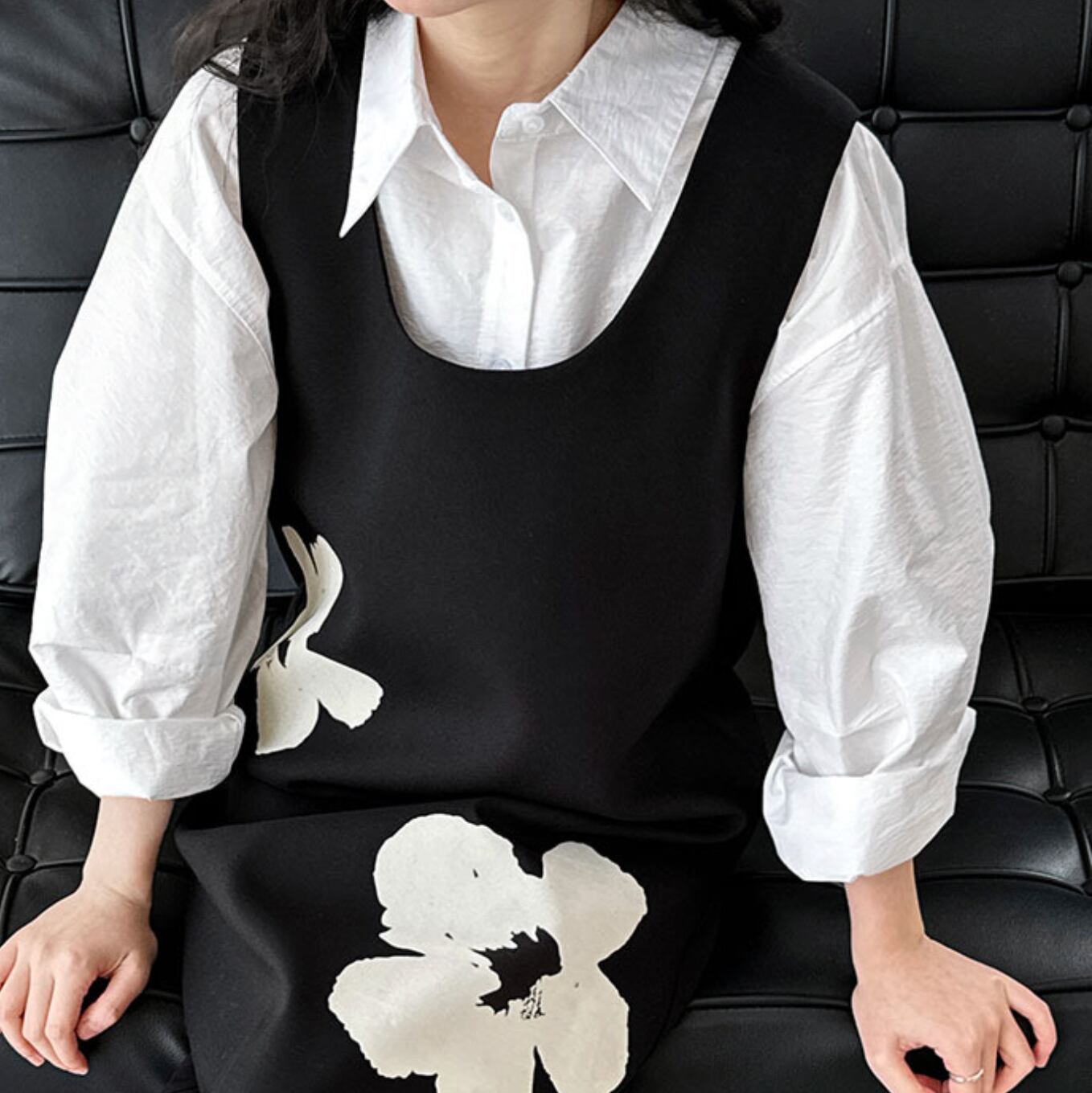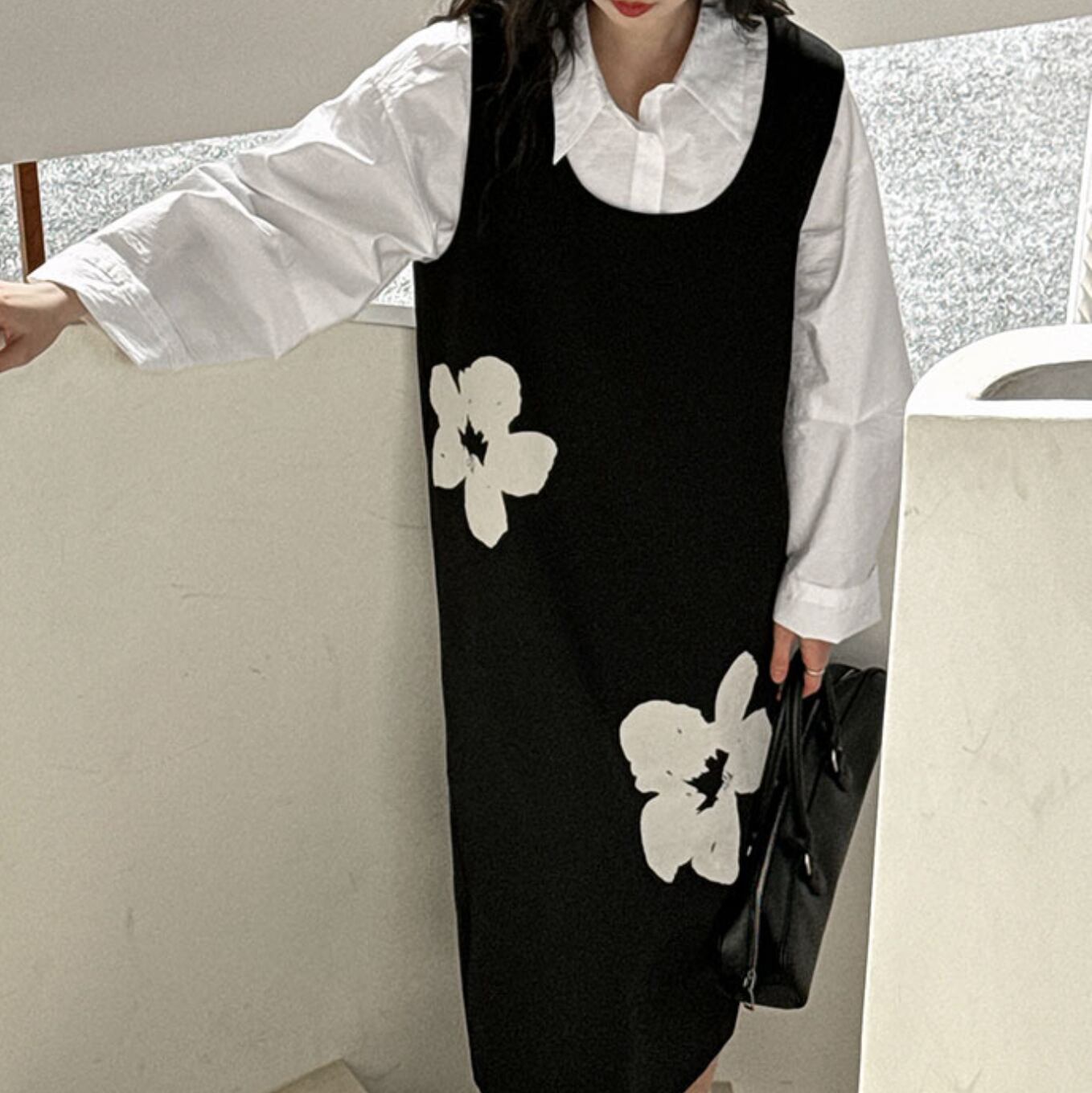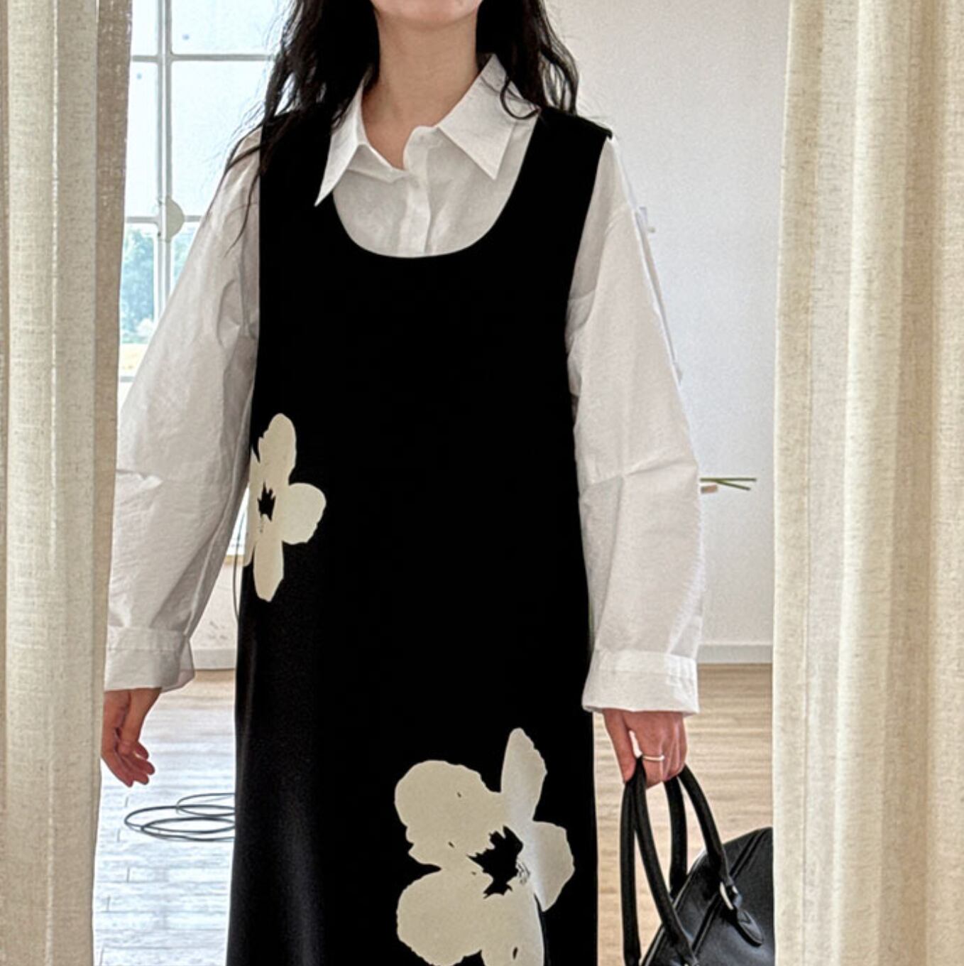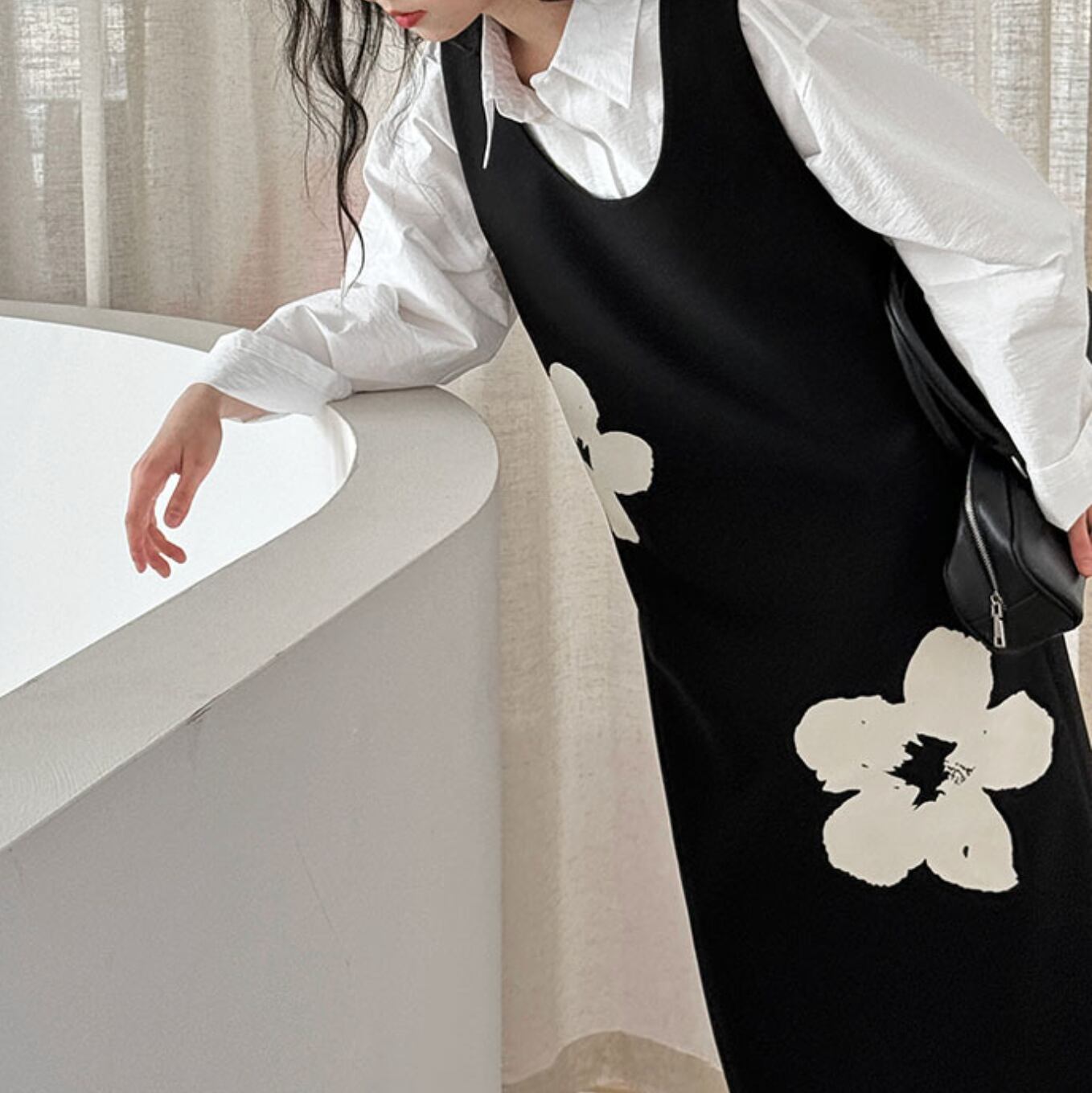 黒×白のシンプルなデザインに、大きめのフラワープリントがちょっぴり華やか。だけど派手すぎないから、大人っぽく着られるのがポイント。