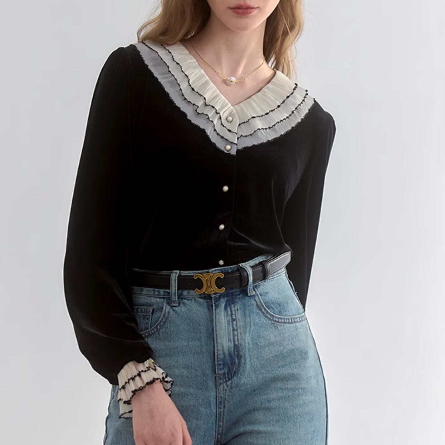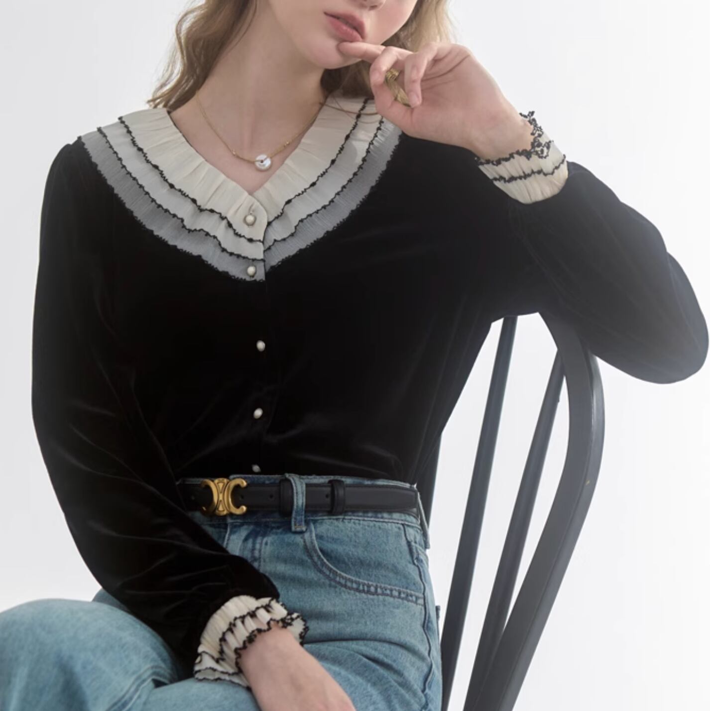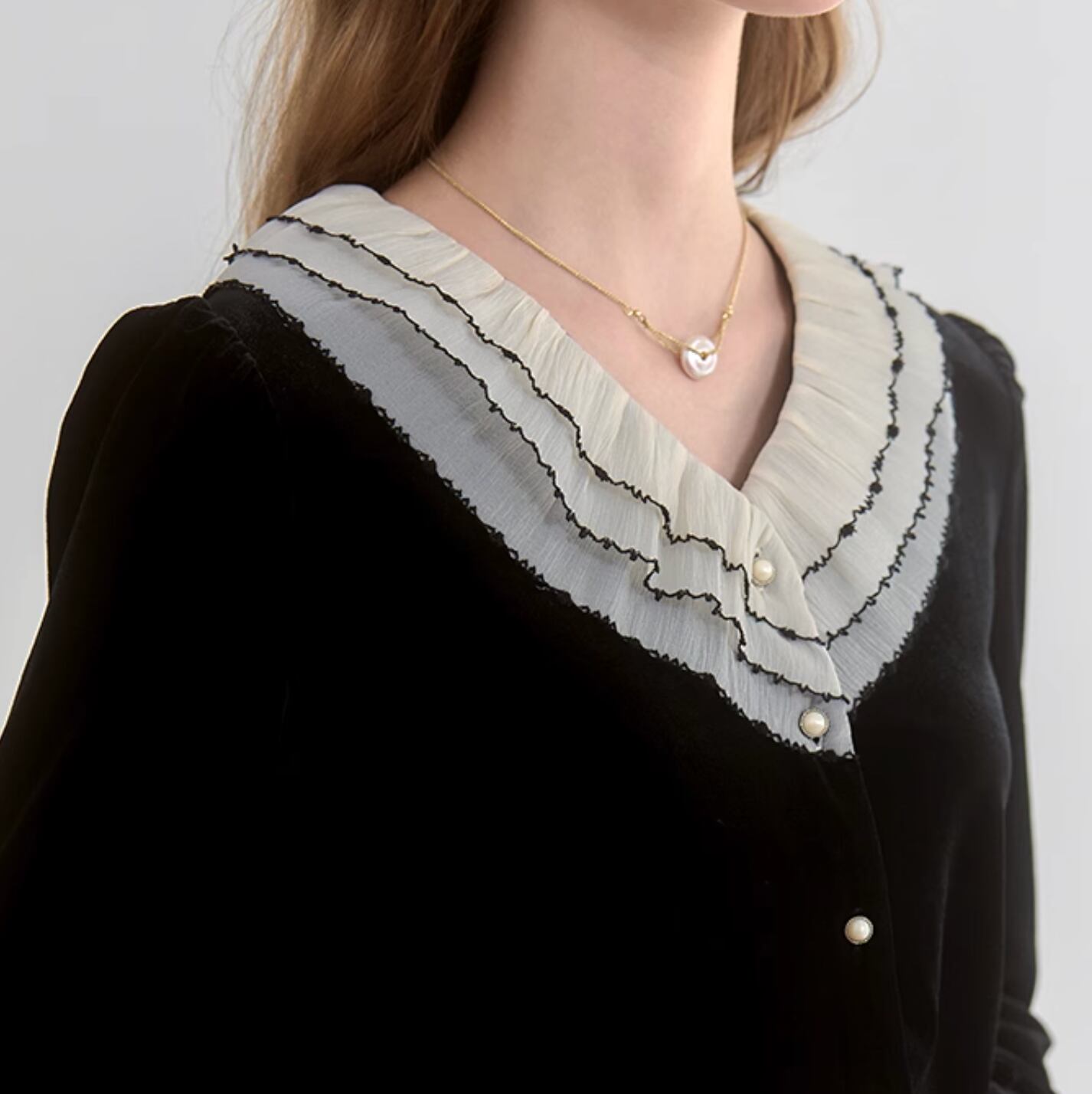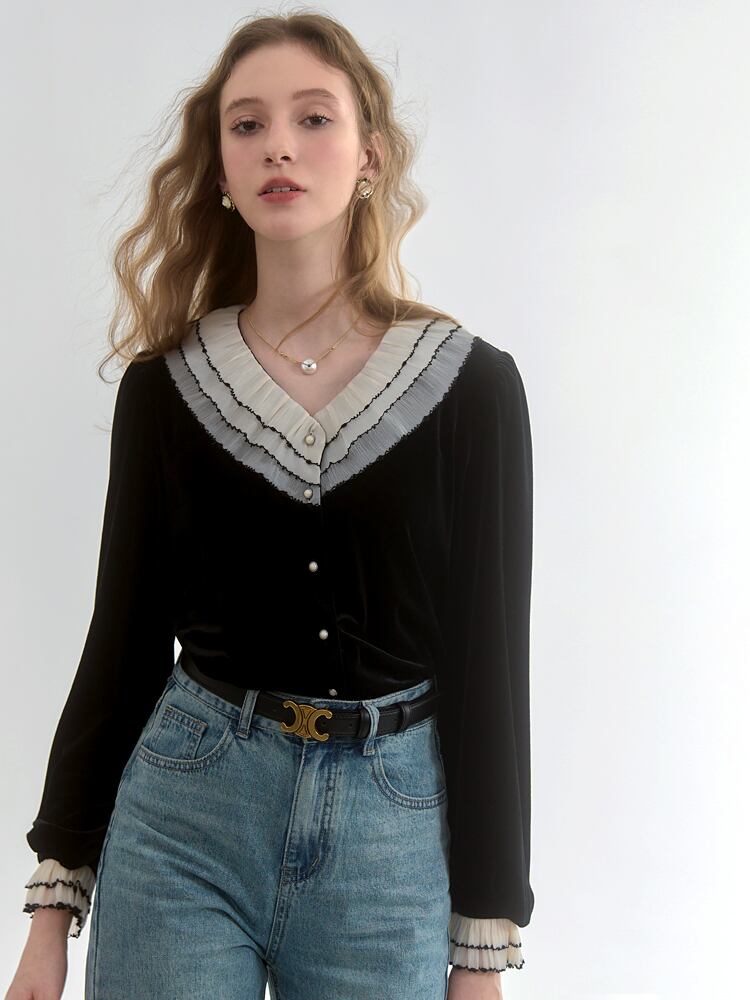 衿とカフス部分の上質な質感のフリルが軽やかで上品なアクセントをプラス。