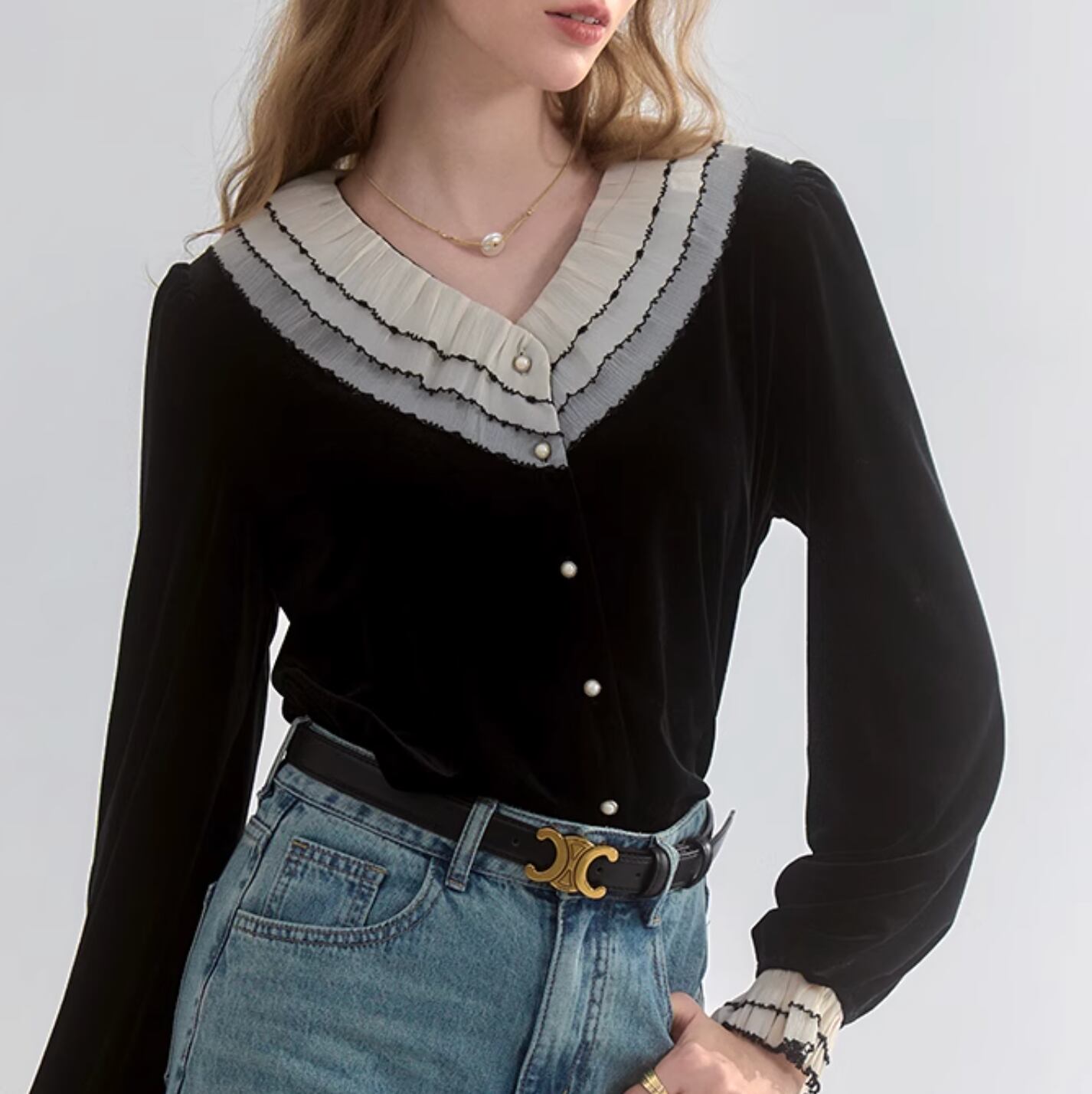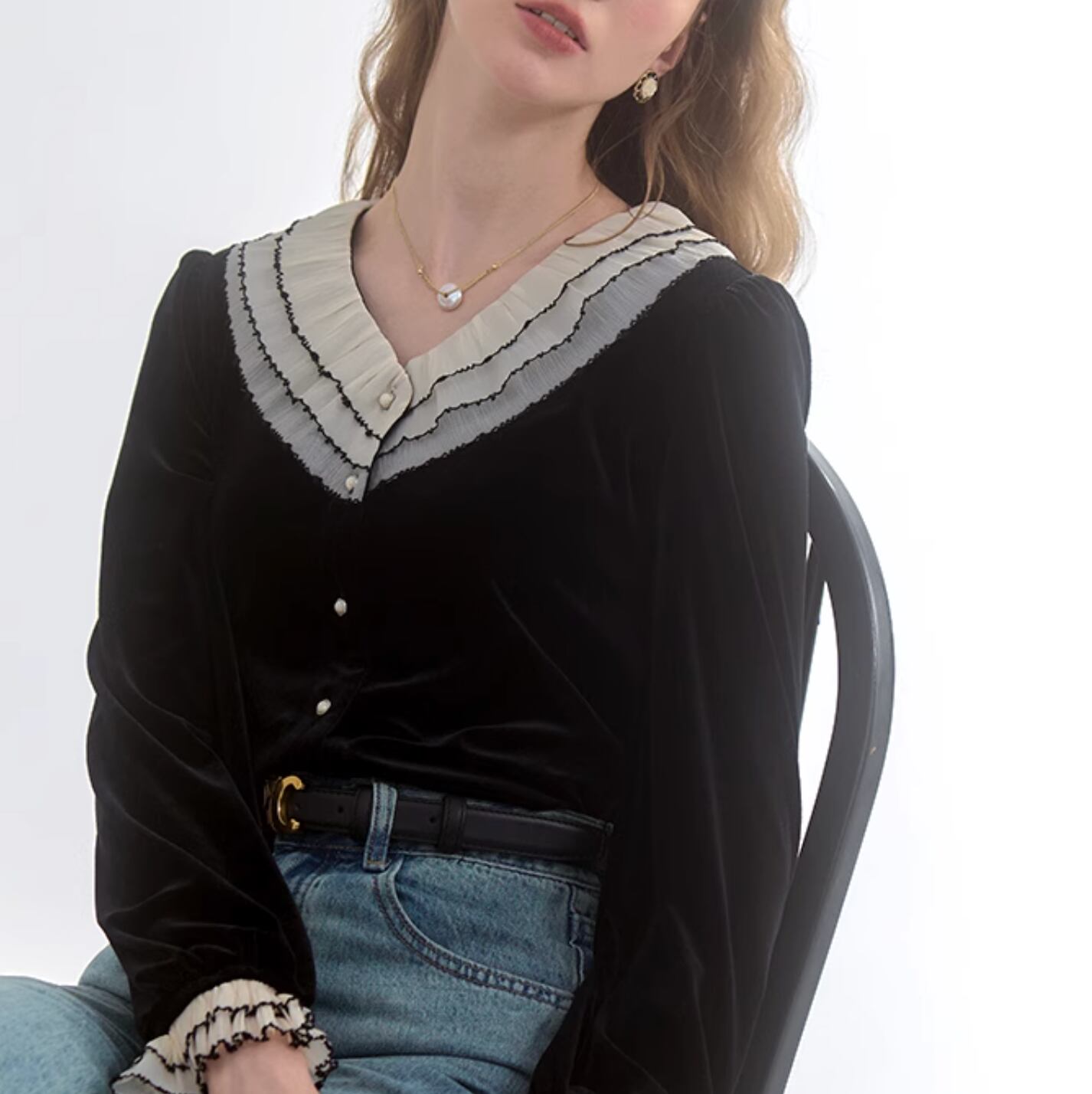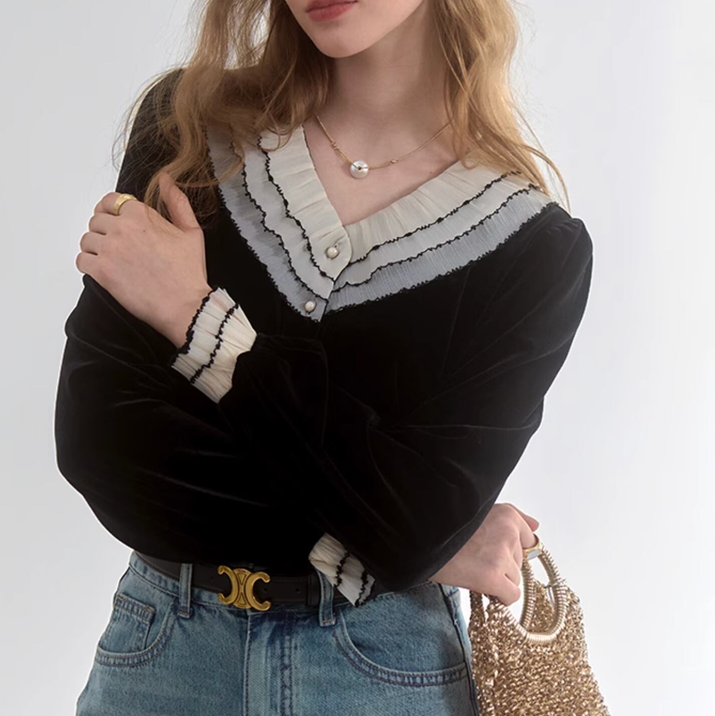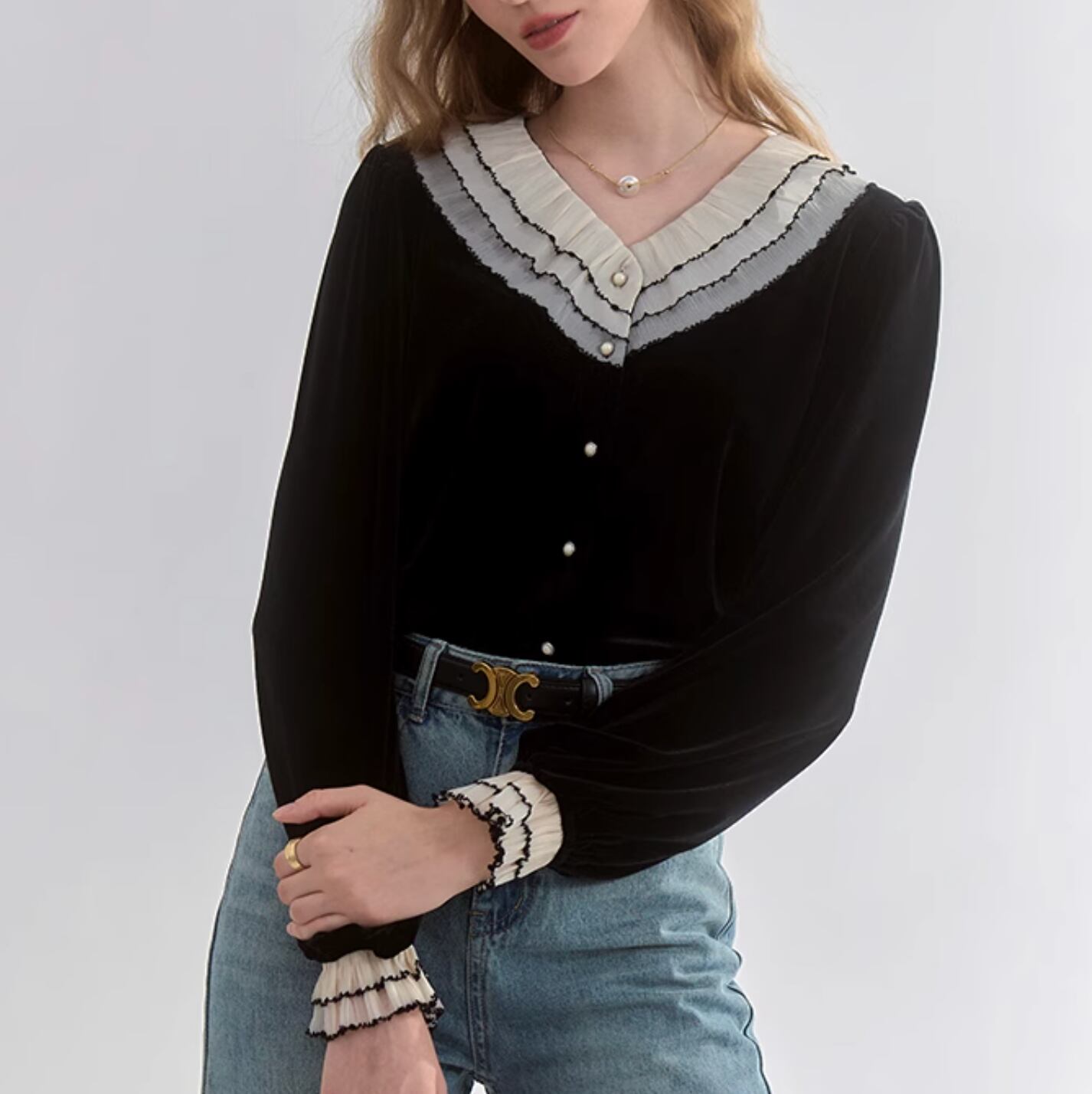 衿とカフス部分の上質な質感のフリルが軽やかで上品なアクセントをプラス。