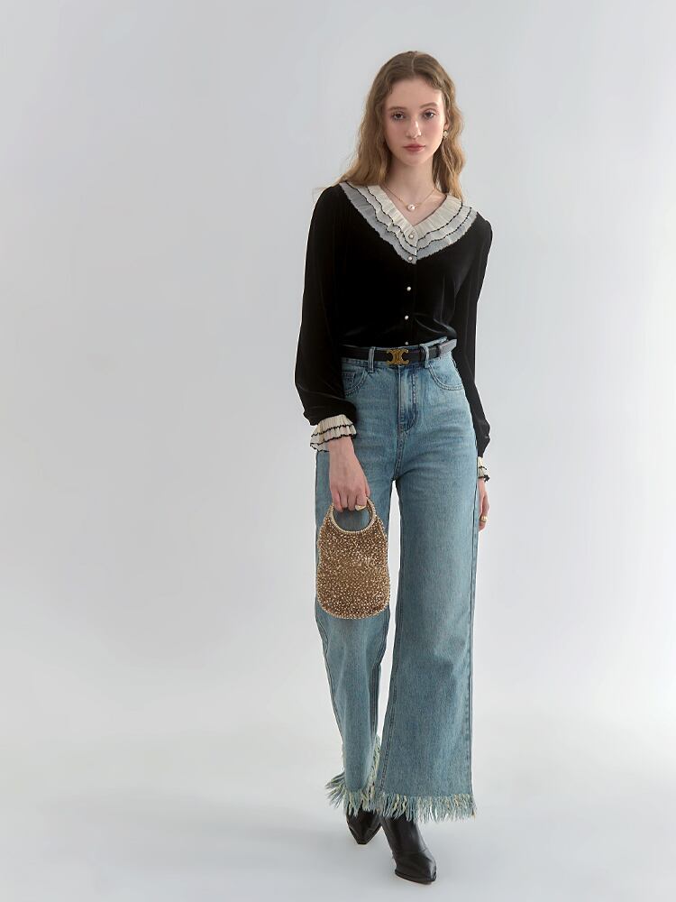 デニムやワイドパンツと組み合わせることで、カジュアルながらも品のあるスタイルを演出。