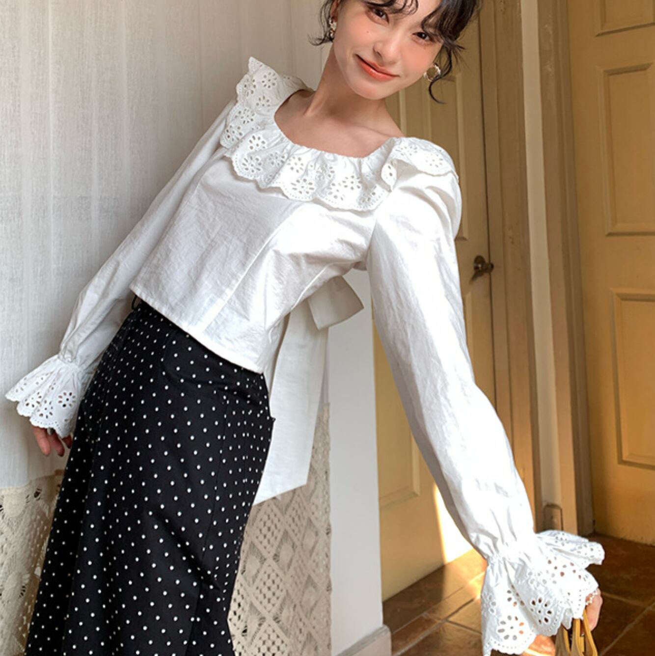 大きな刺繍入りフリルとバックリボンが特徴的で愛らしいブラウスです。
