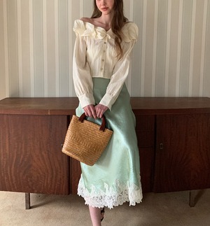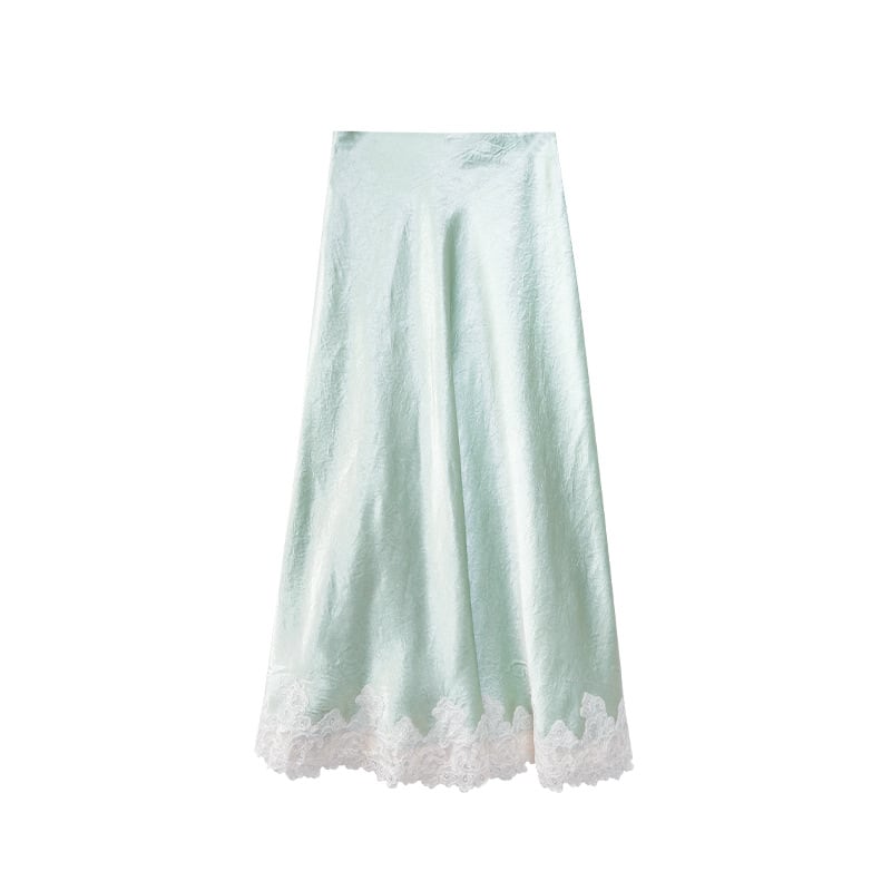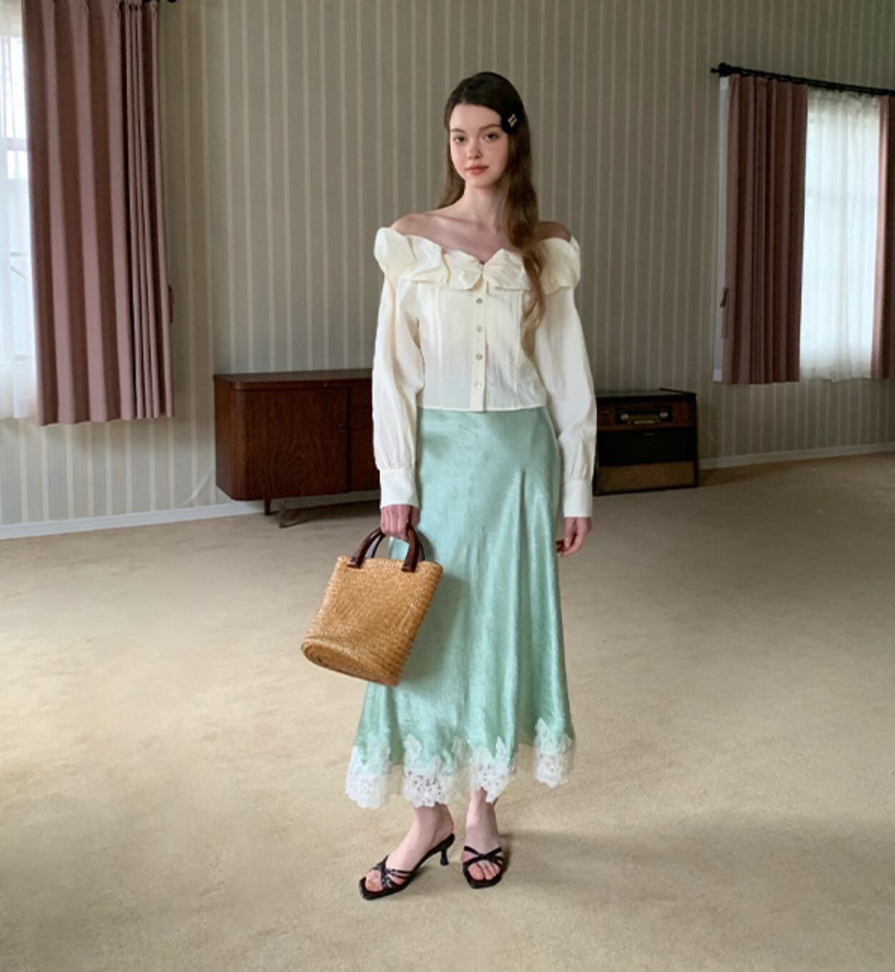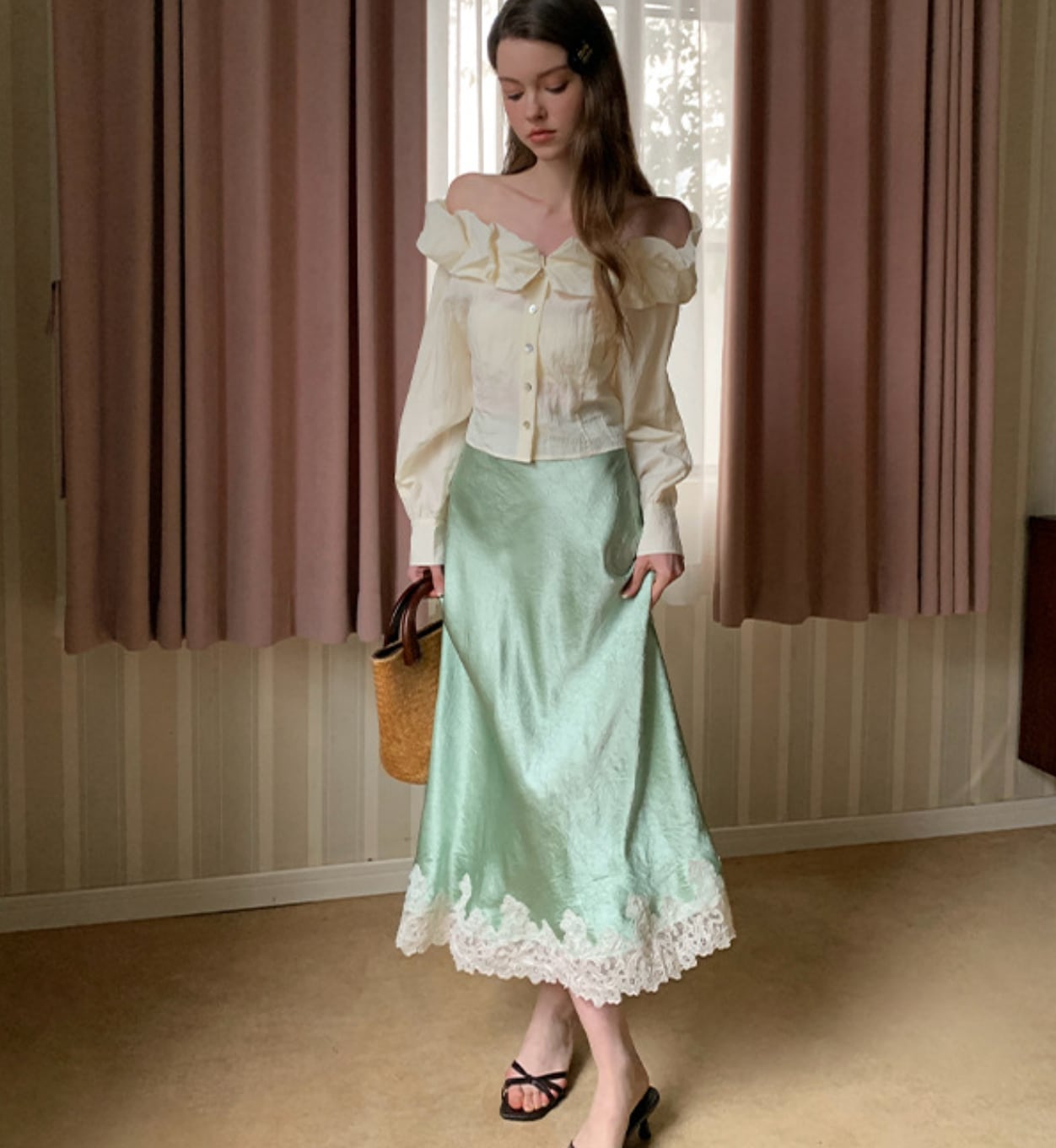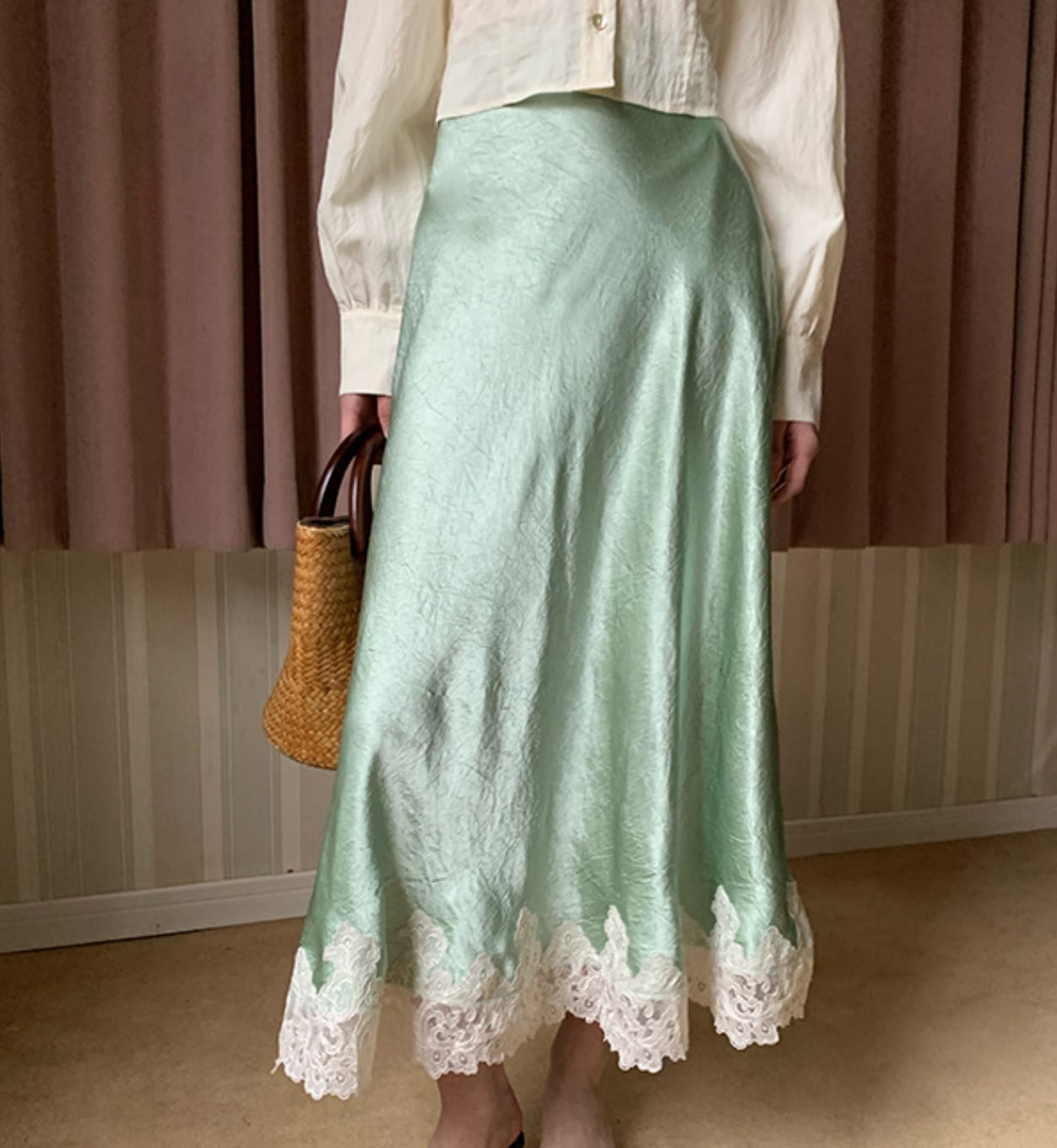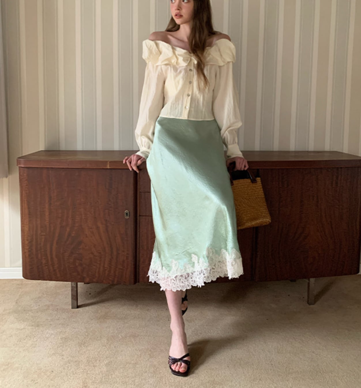 広がり過ぎず軽やかに揺れ動くシルエットが美しいデザイン。裾元のレースが華やかさを