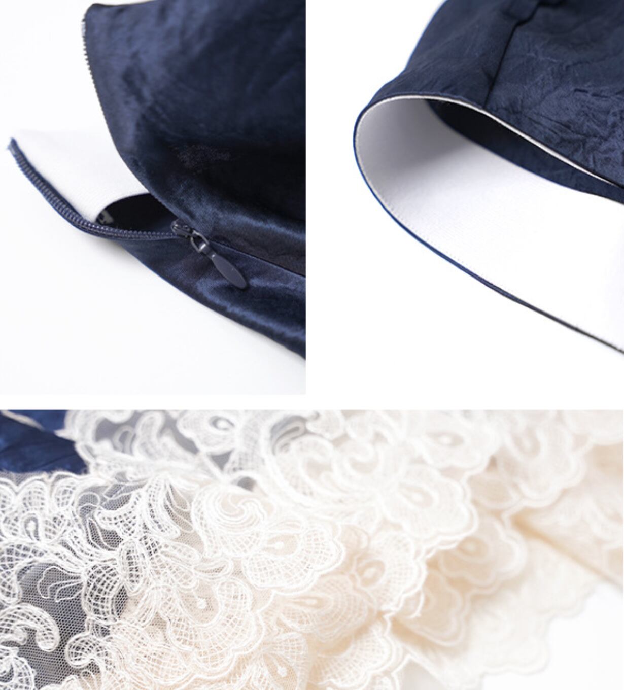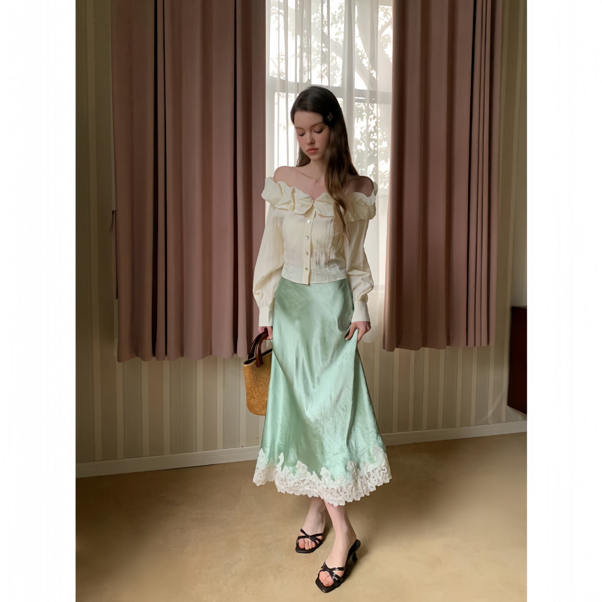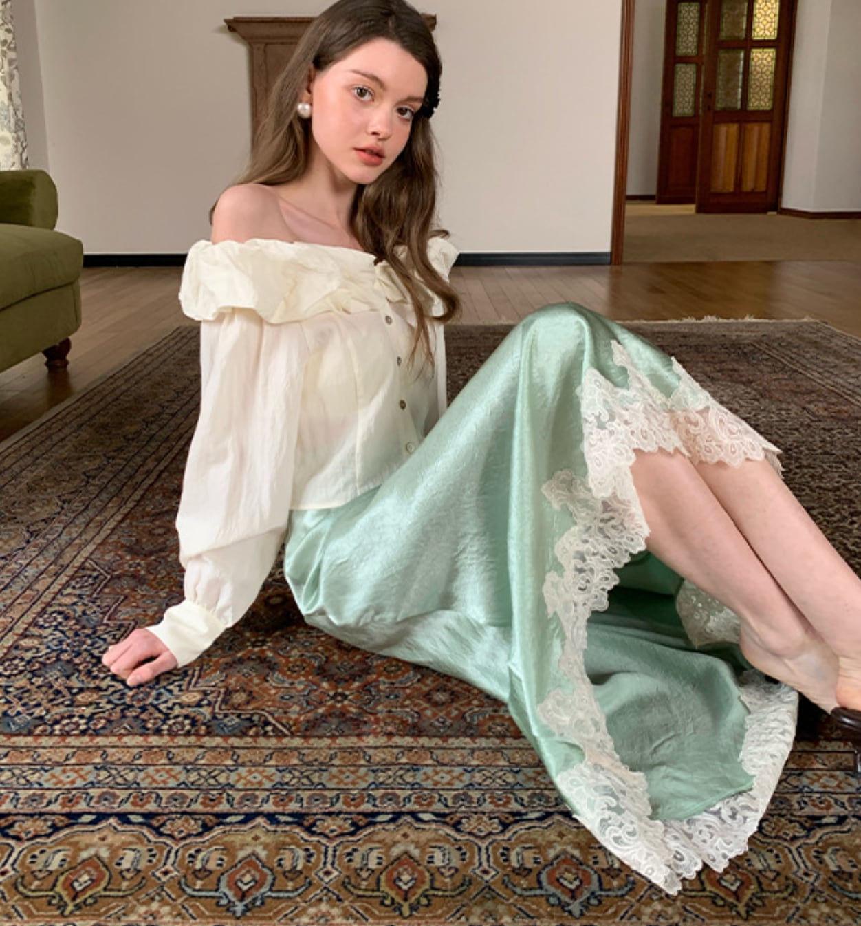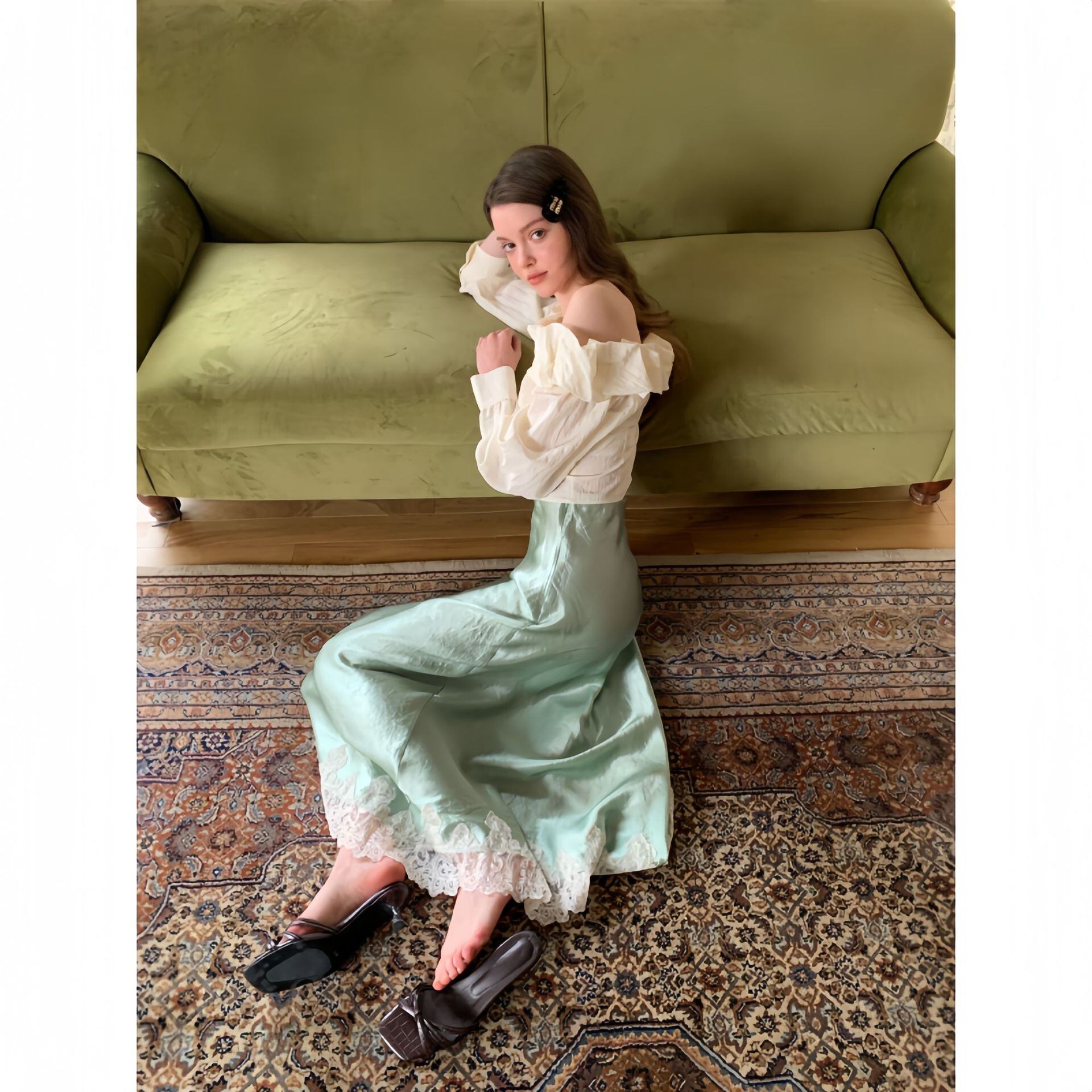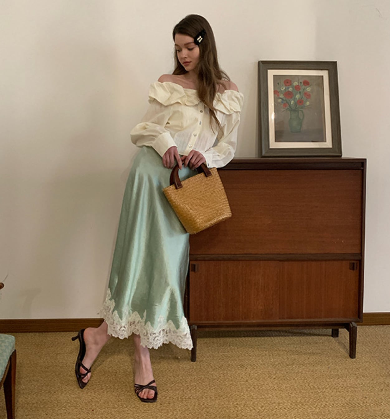 広がり過ぎず軽やかに揺れ動くシルエットが美しいデザイン。裾元のレースが華やかさを