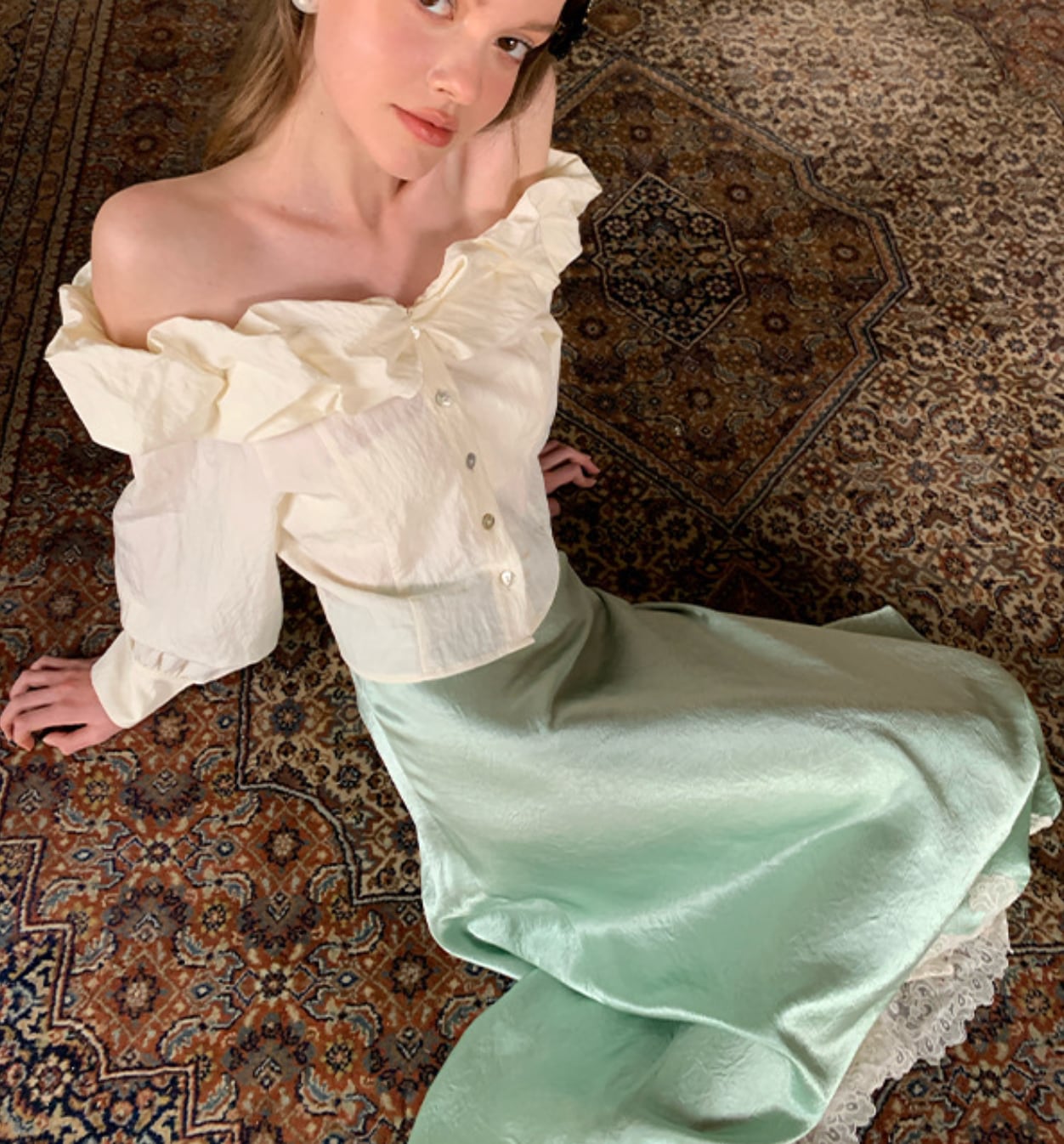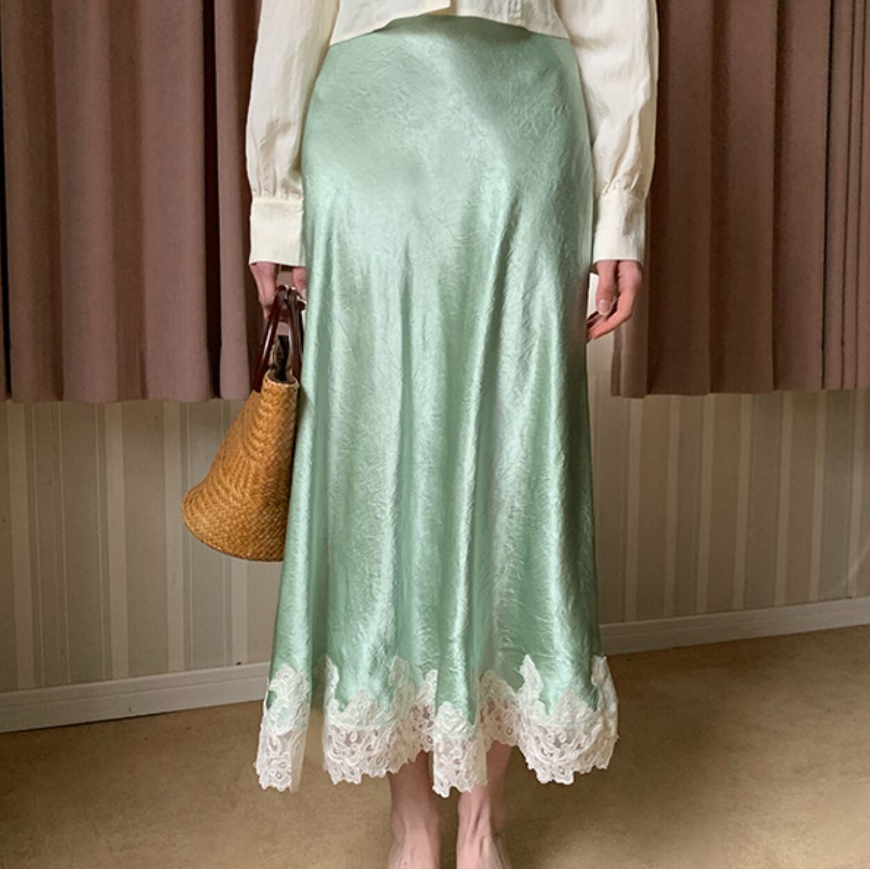 シャイニーな風合いが美しい表情を見せるロングサテンスカート。