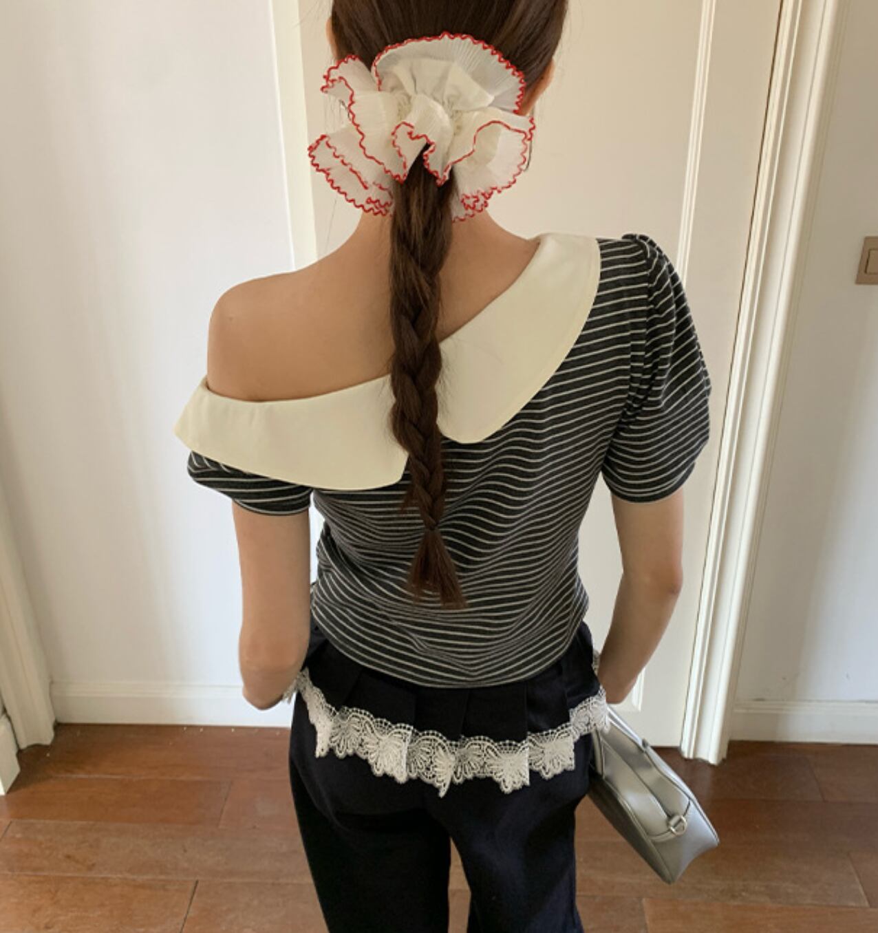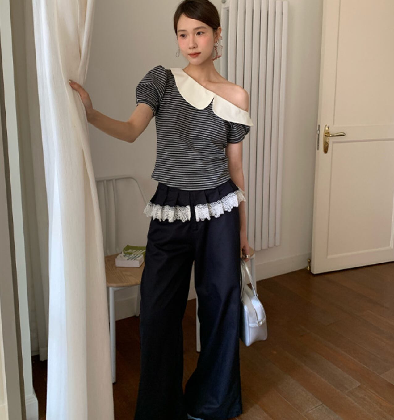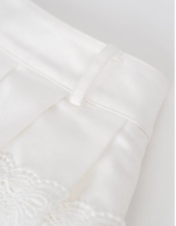 ショート丈トップスと合わせてウエストレースを見せるのも素敵です。