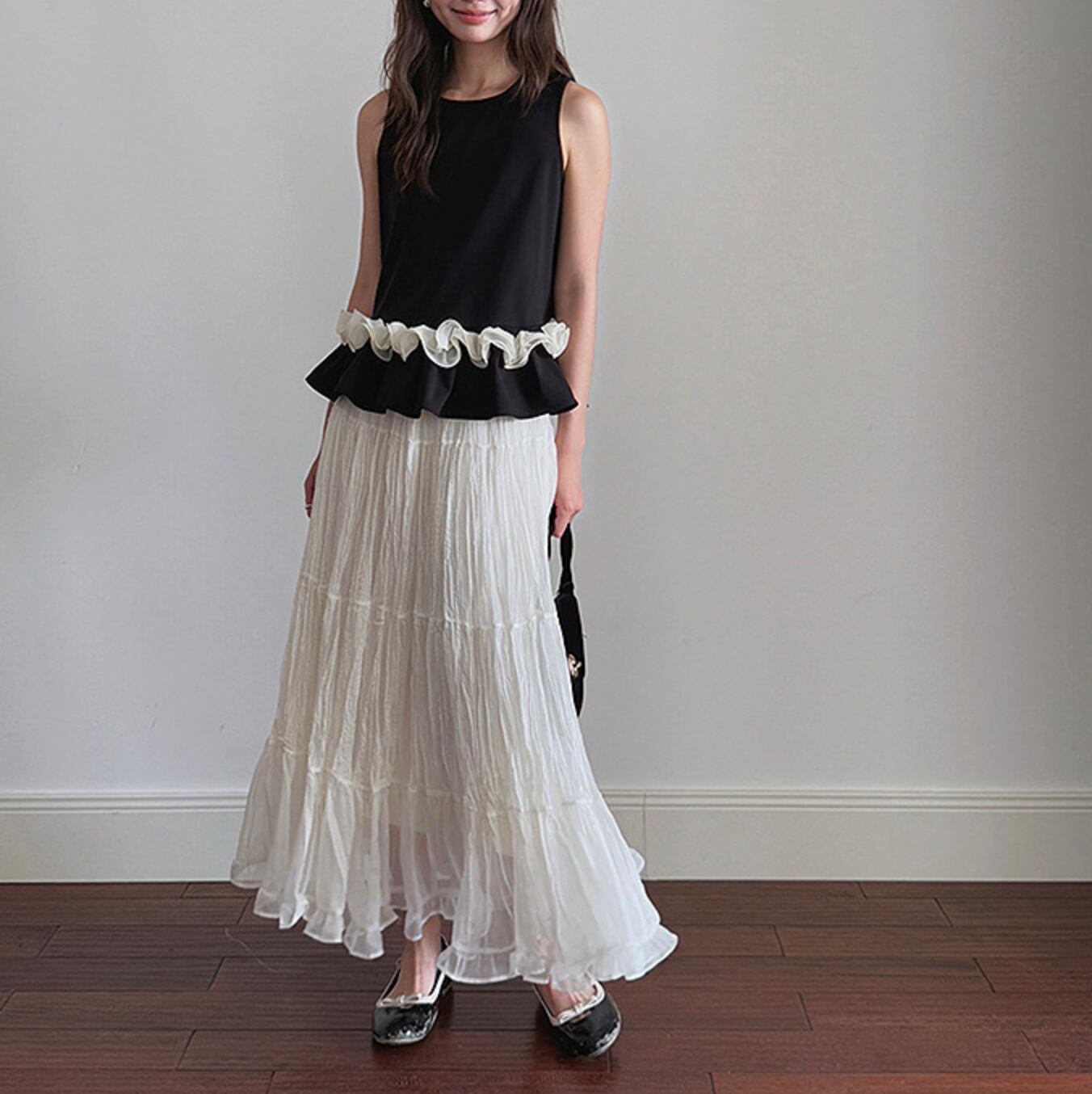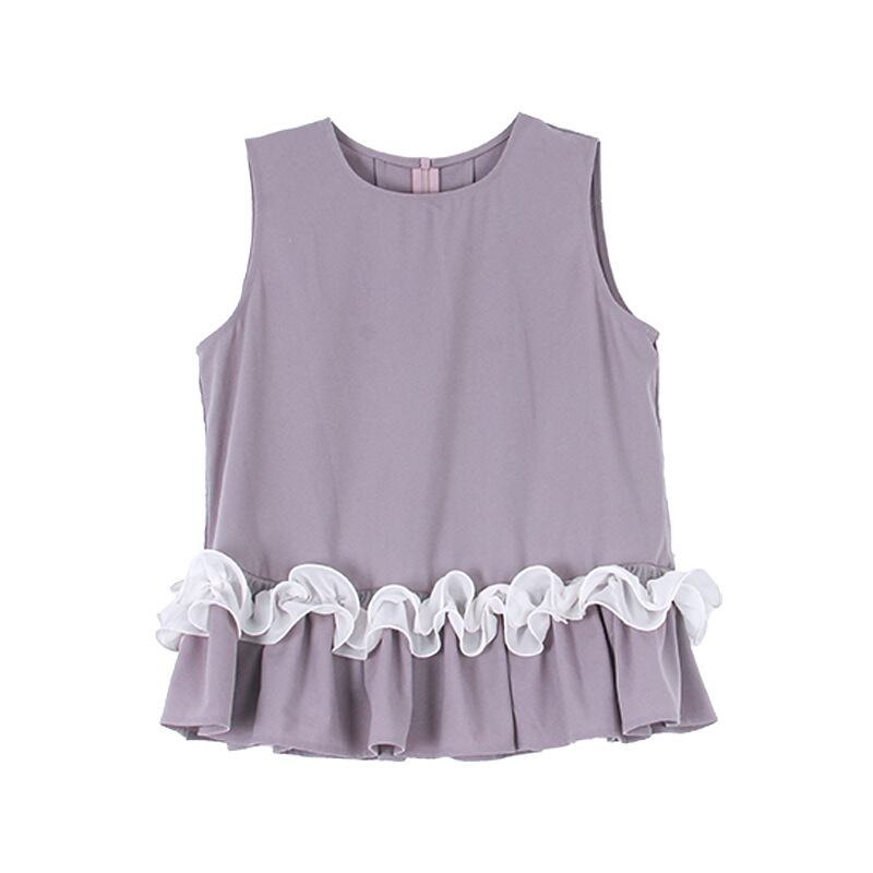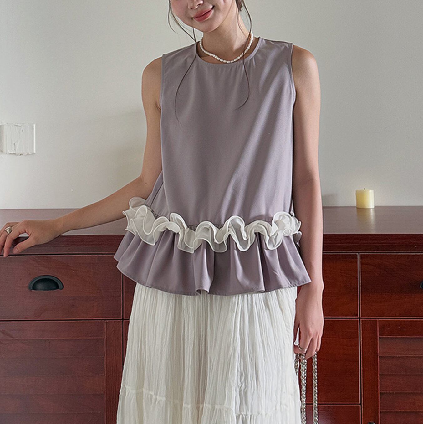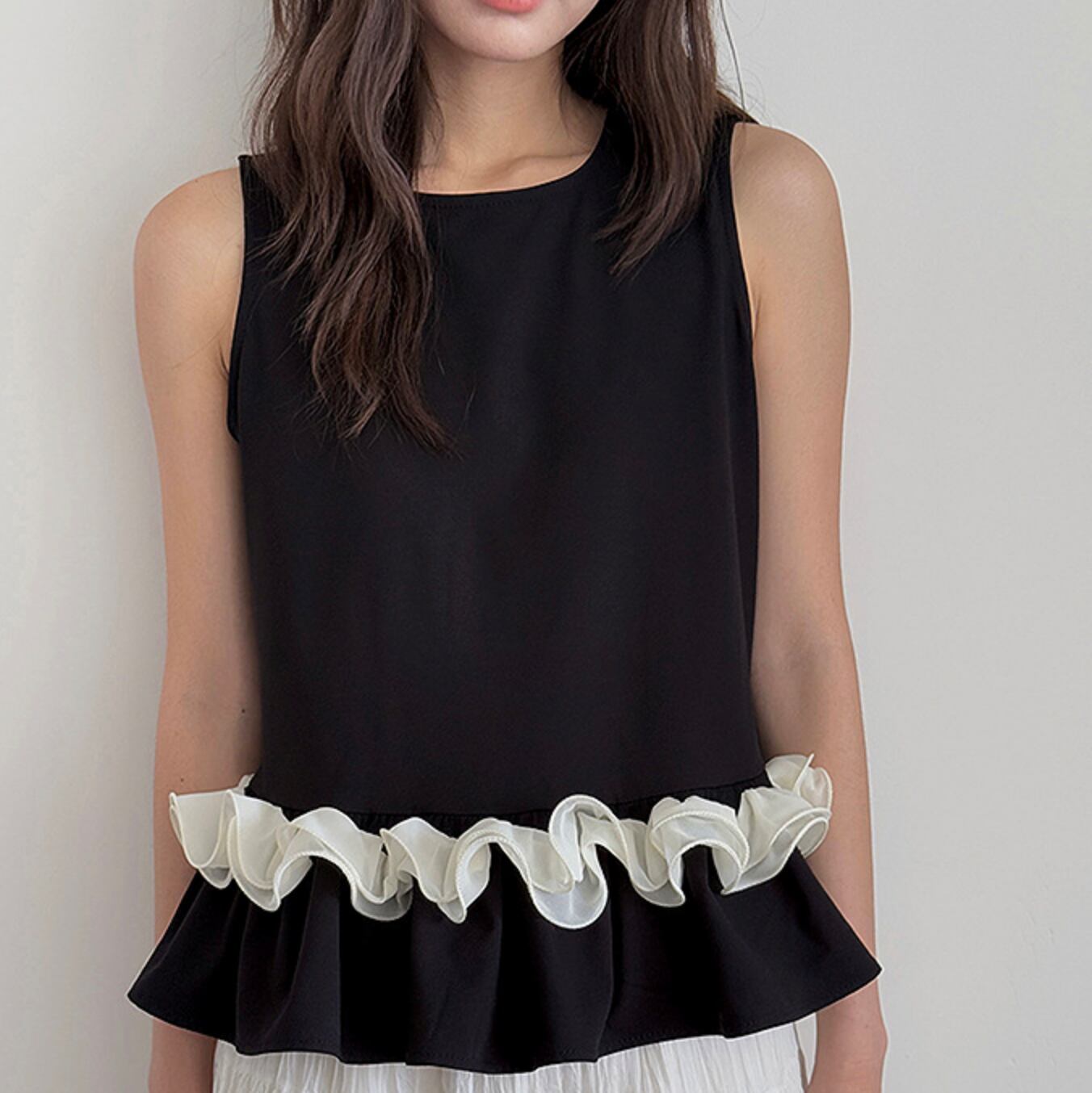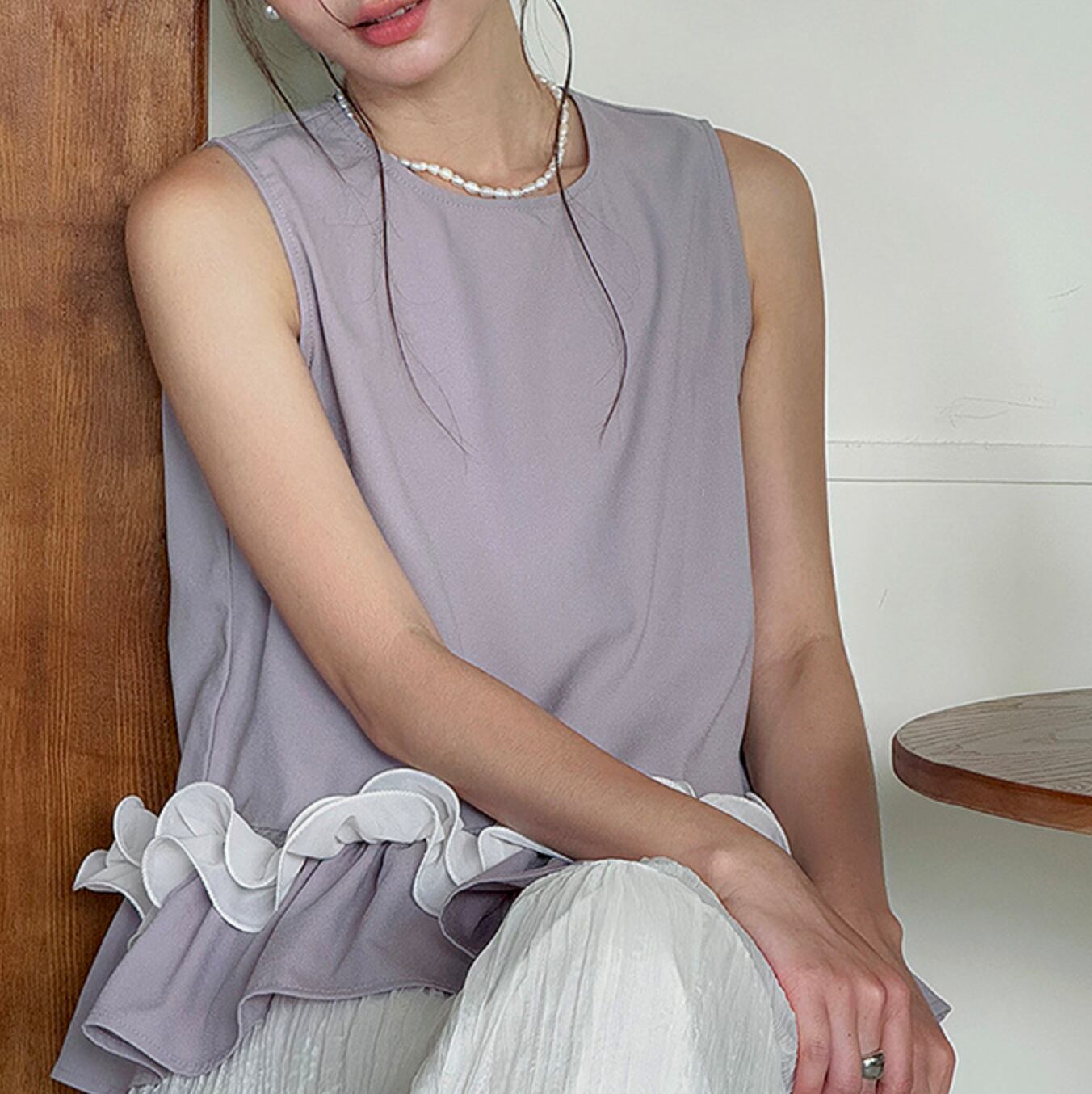 裾にフリルをあしらったノースリーブブラウス。
