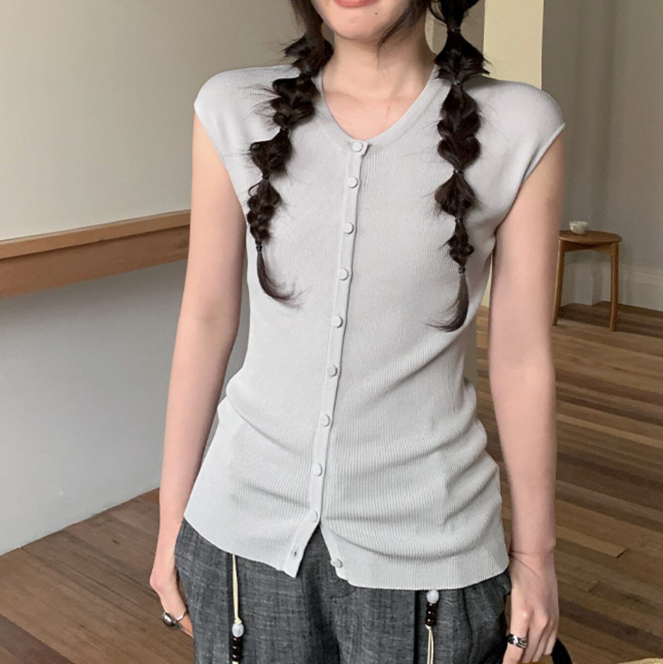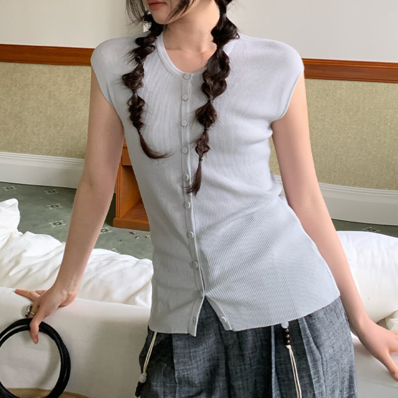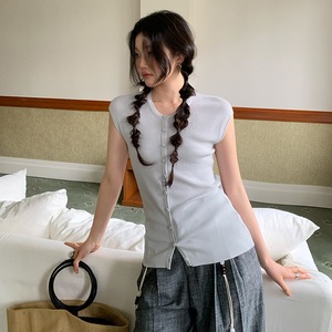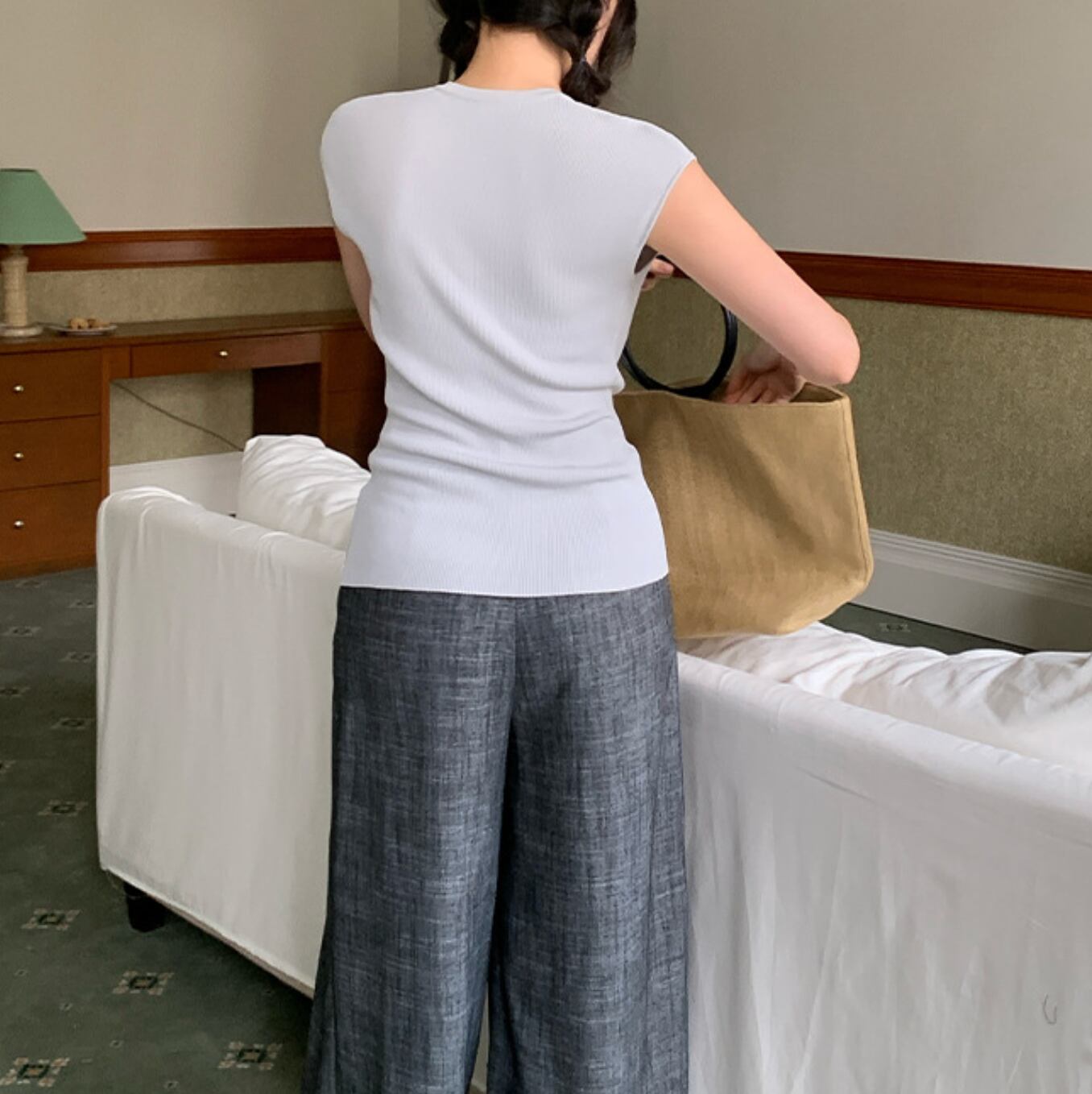 涼しげながらもメリハリのある形が特徴のラウンドネックニットトップス。