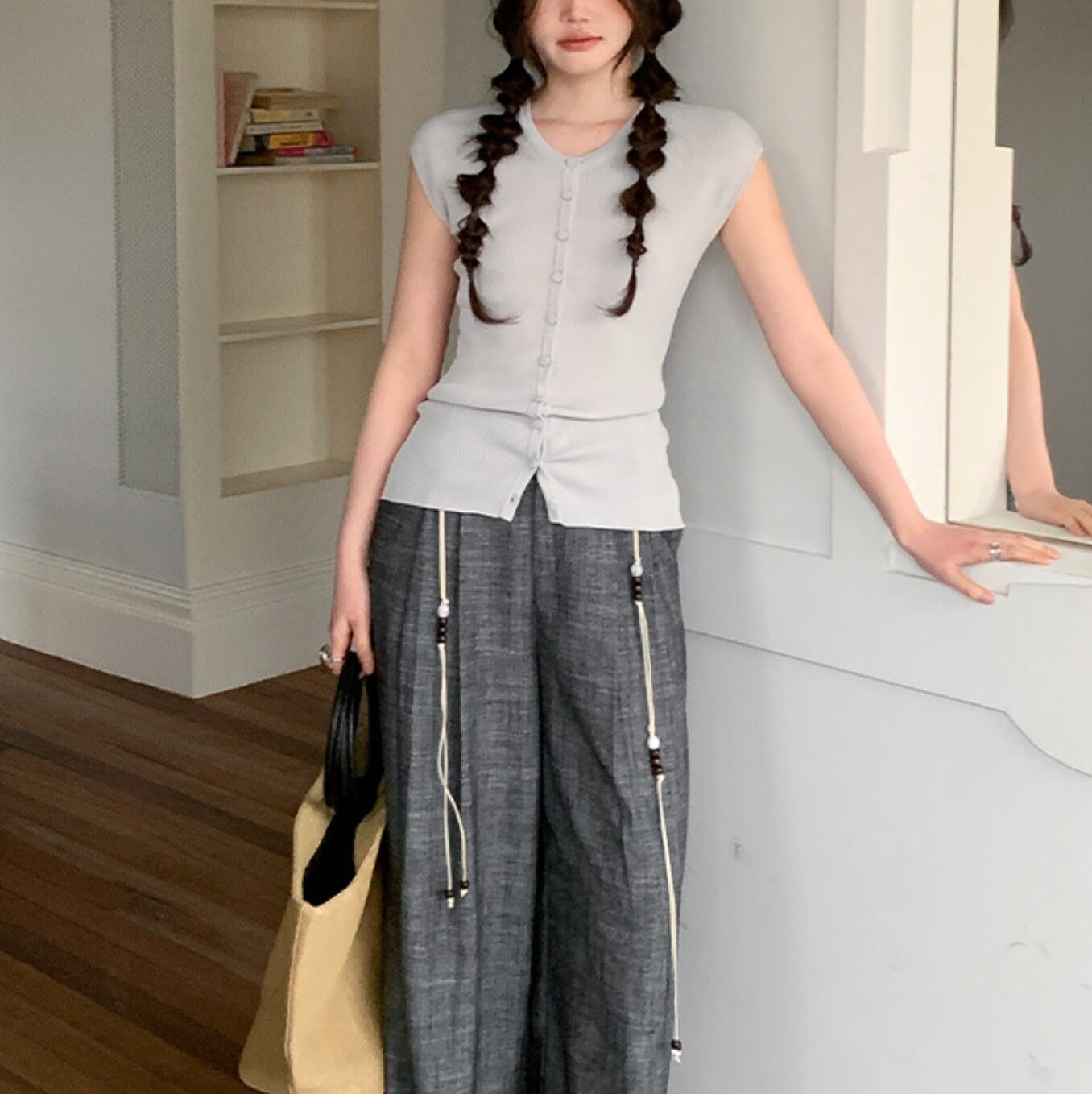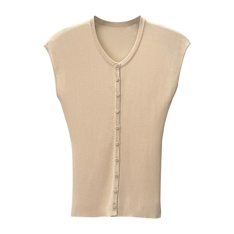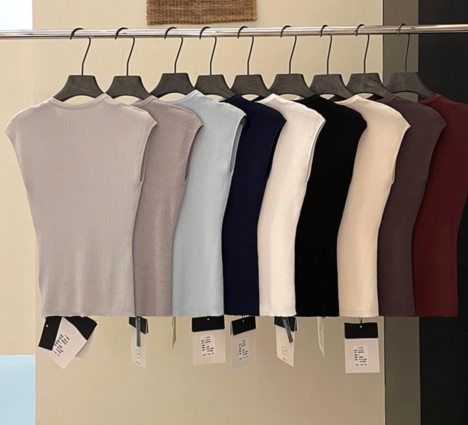 涼しげながらもメリハリのある形が特徴のラウンドネックニットトップス。