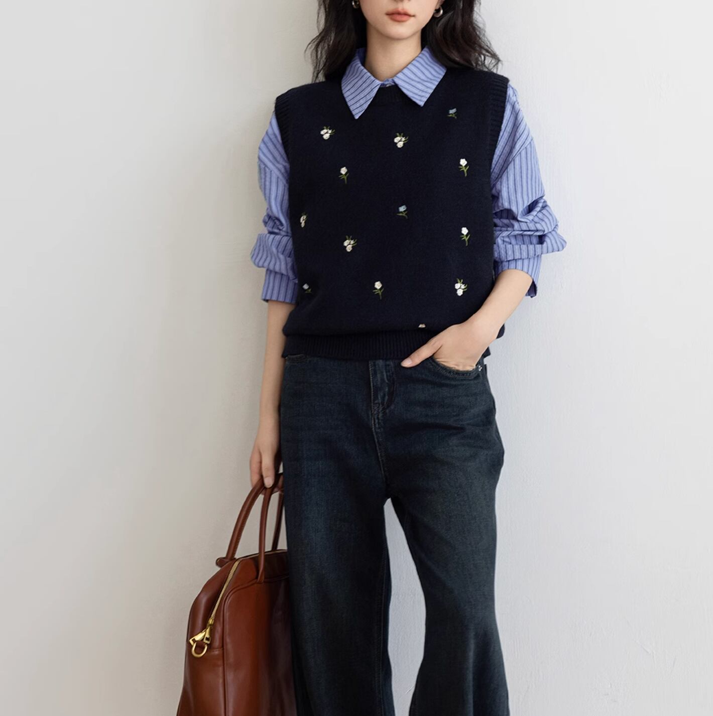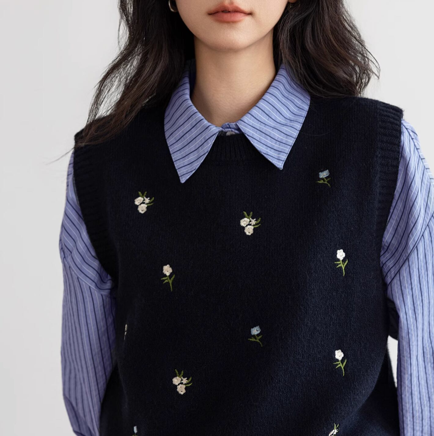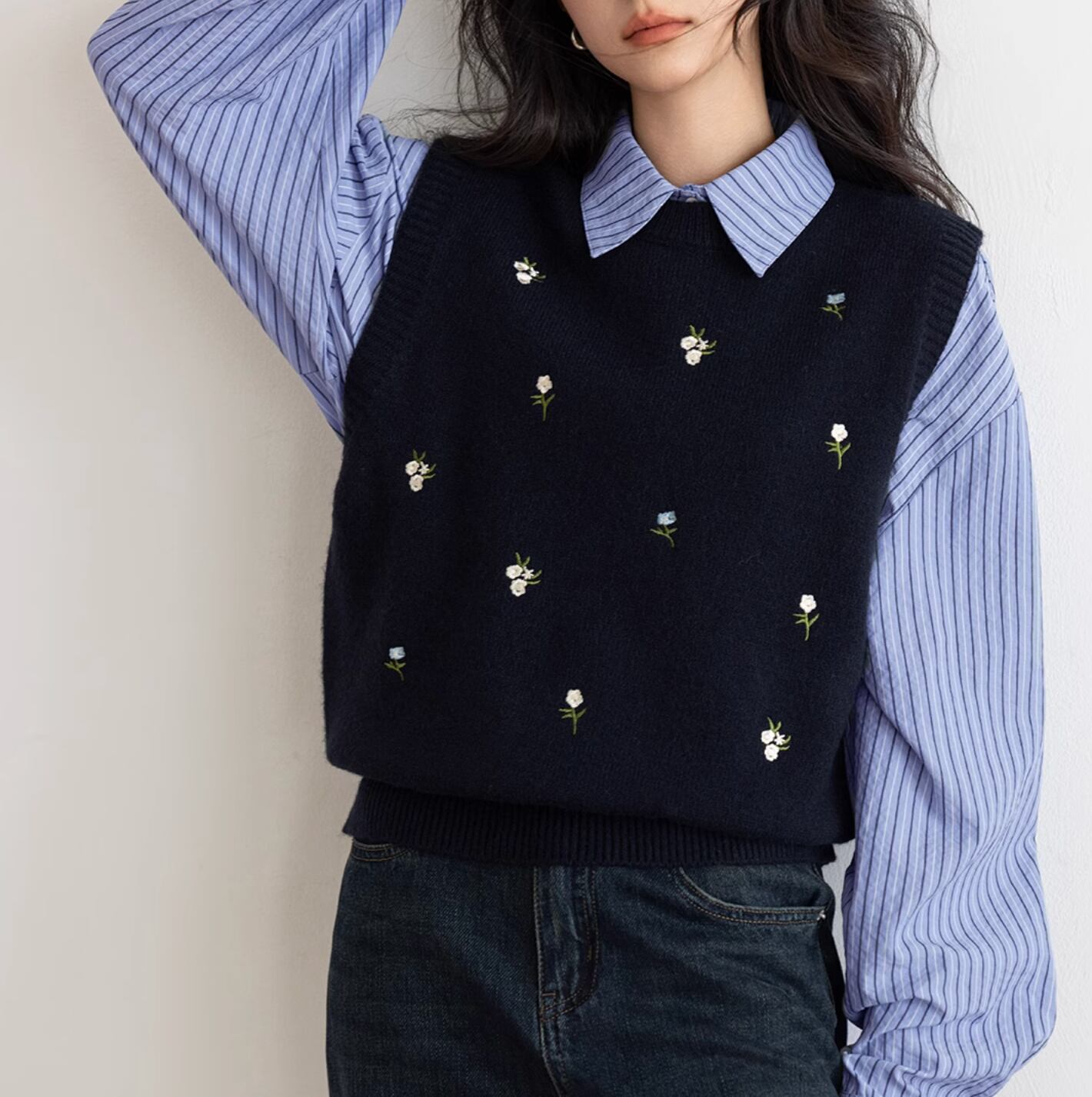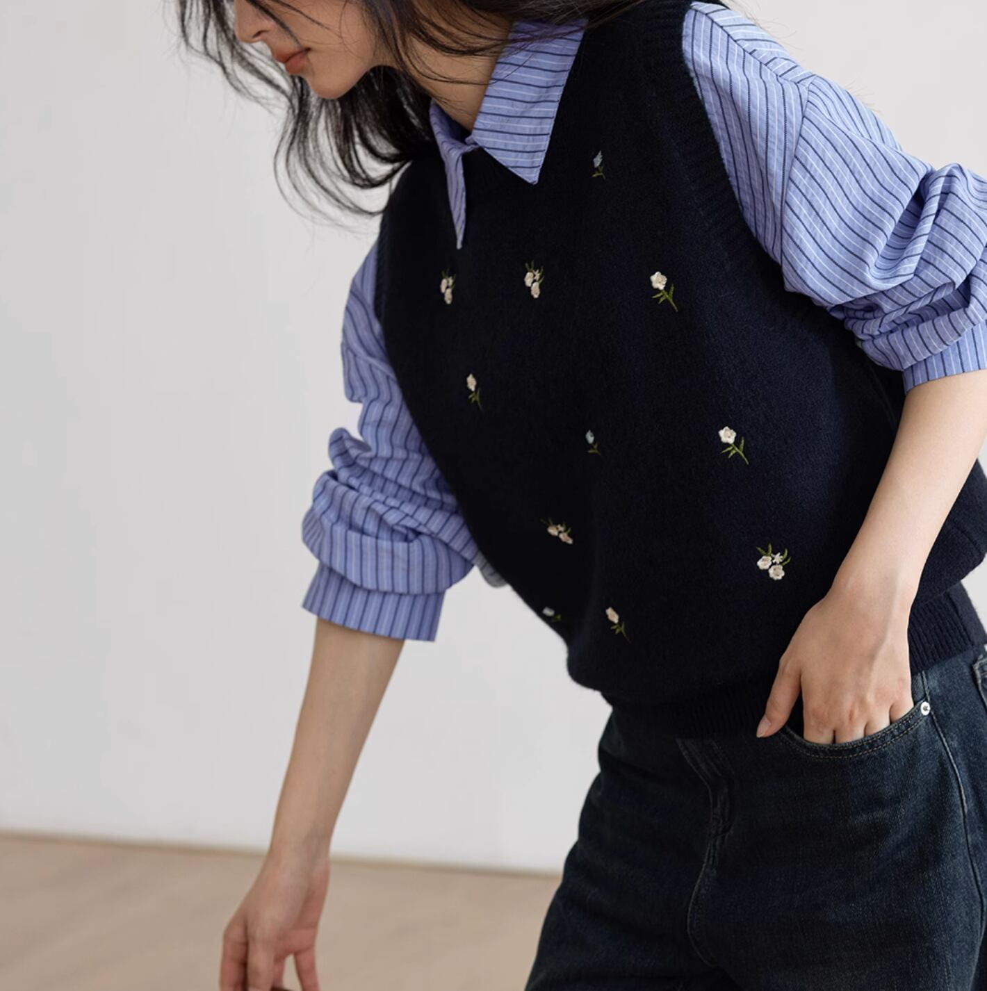 小花柄の刺繍と圧縮ウールのしっかりとした生地感がとてもかわいいベストです。