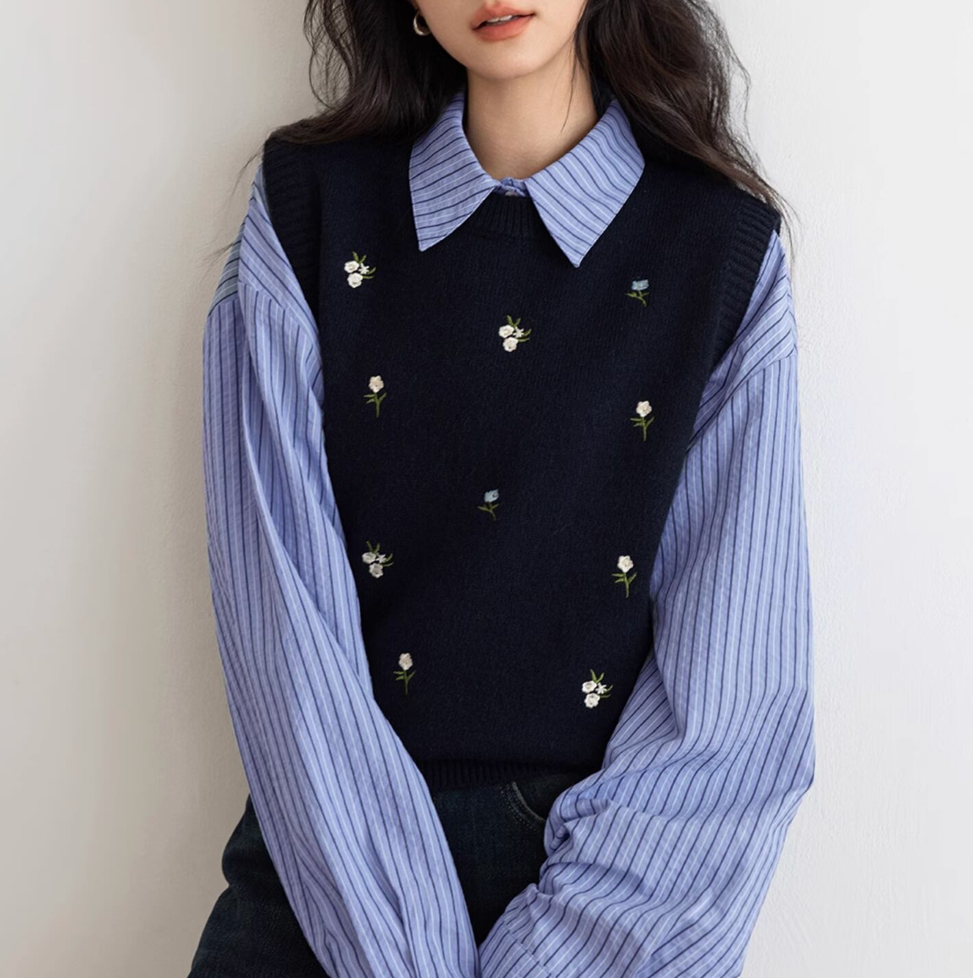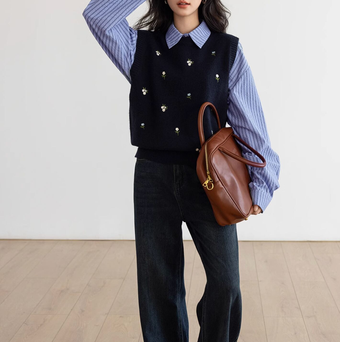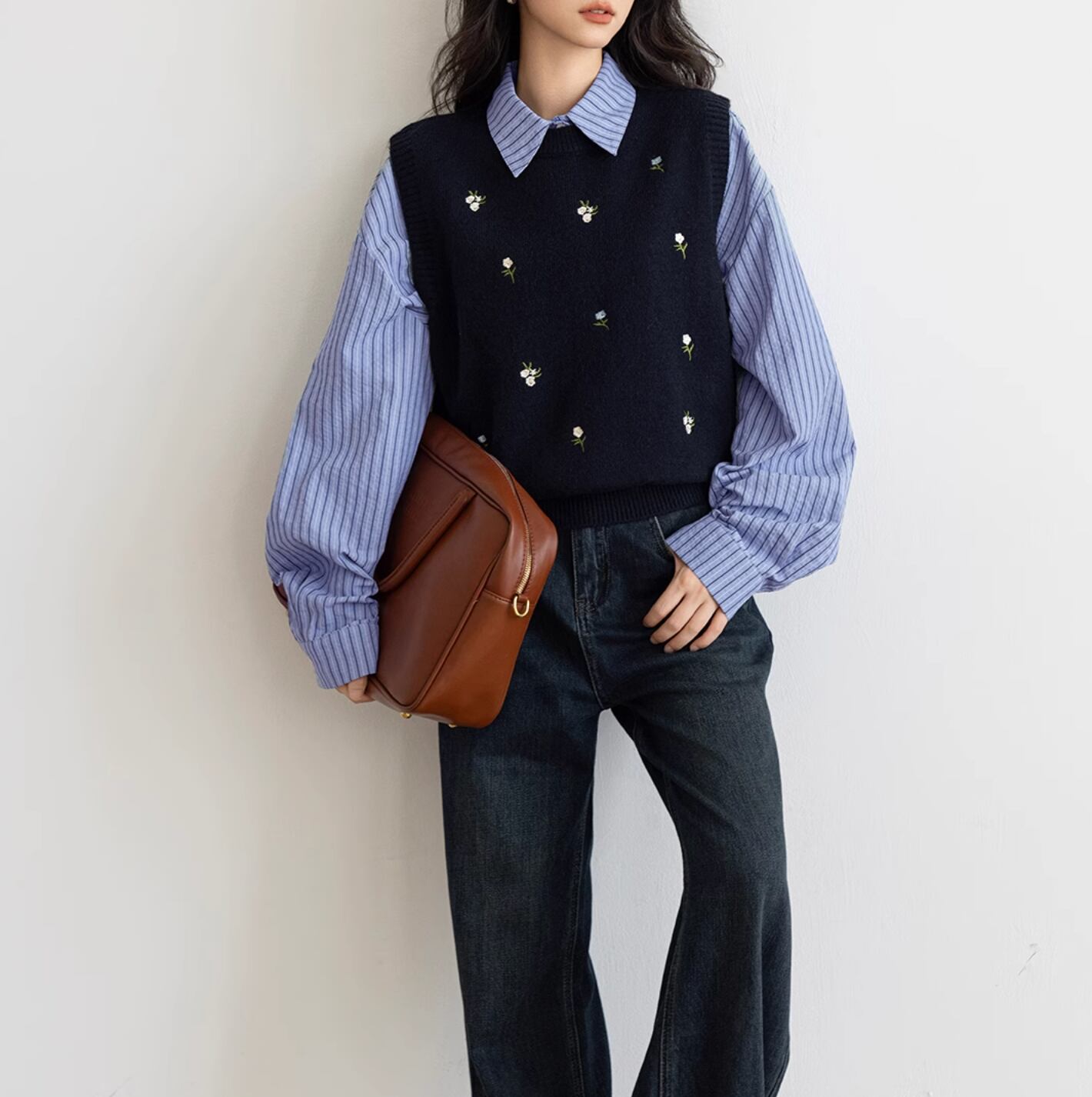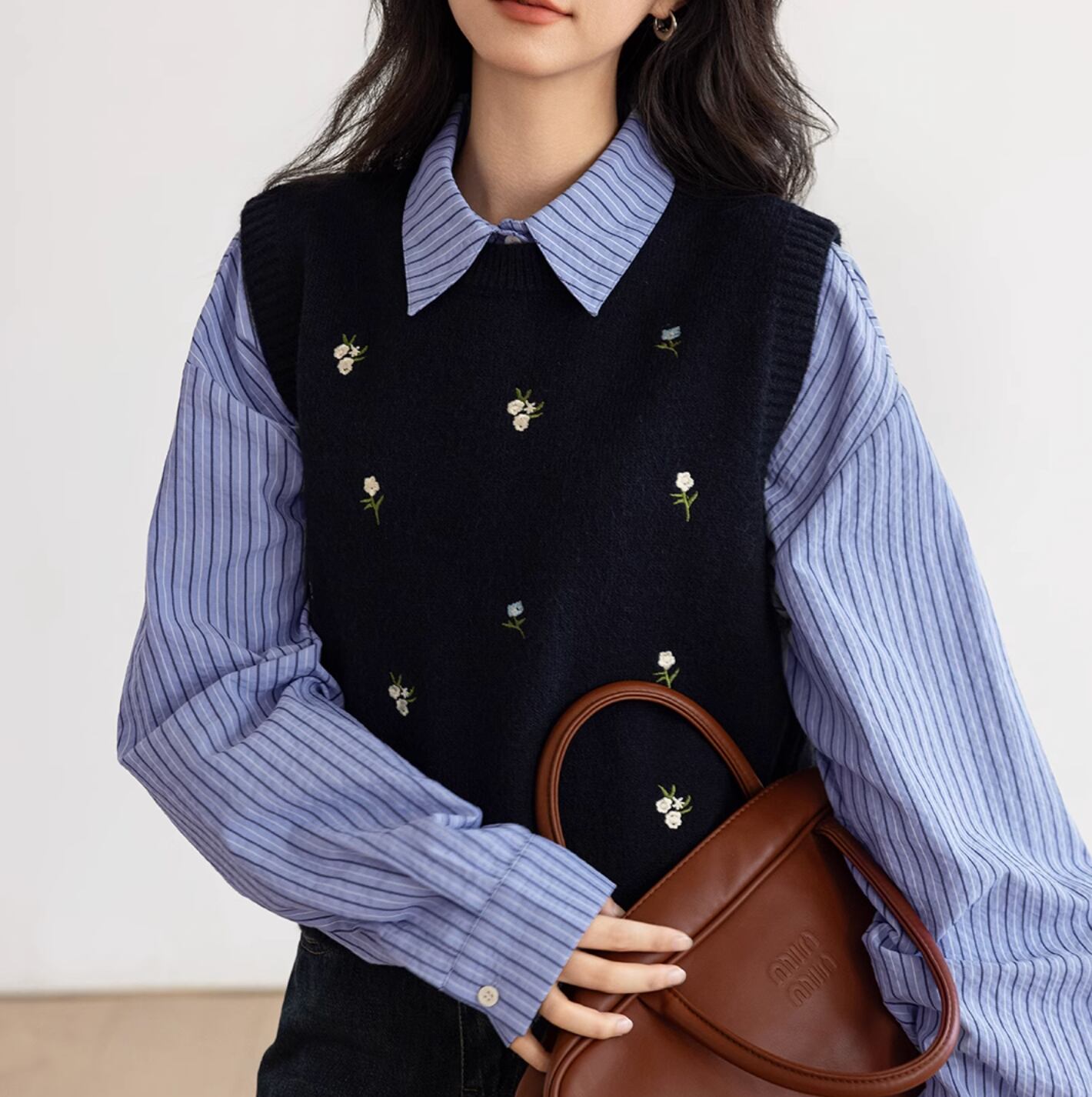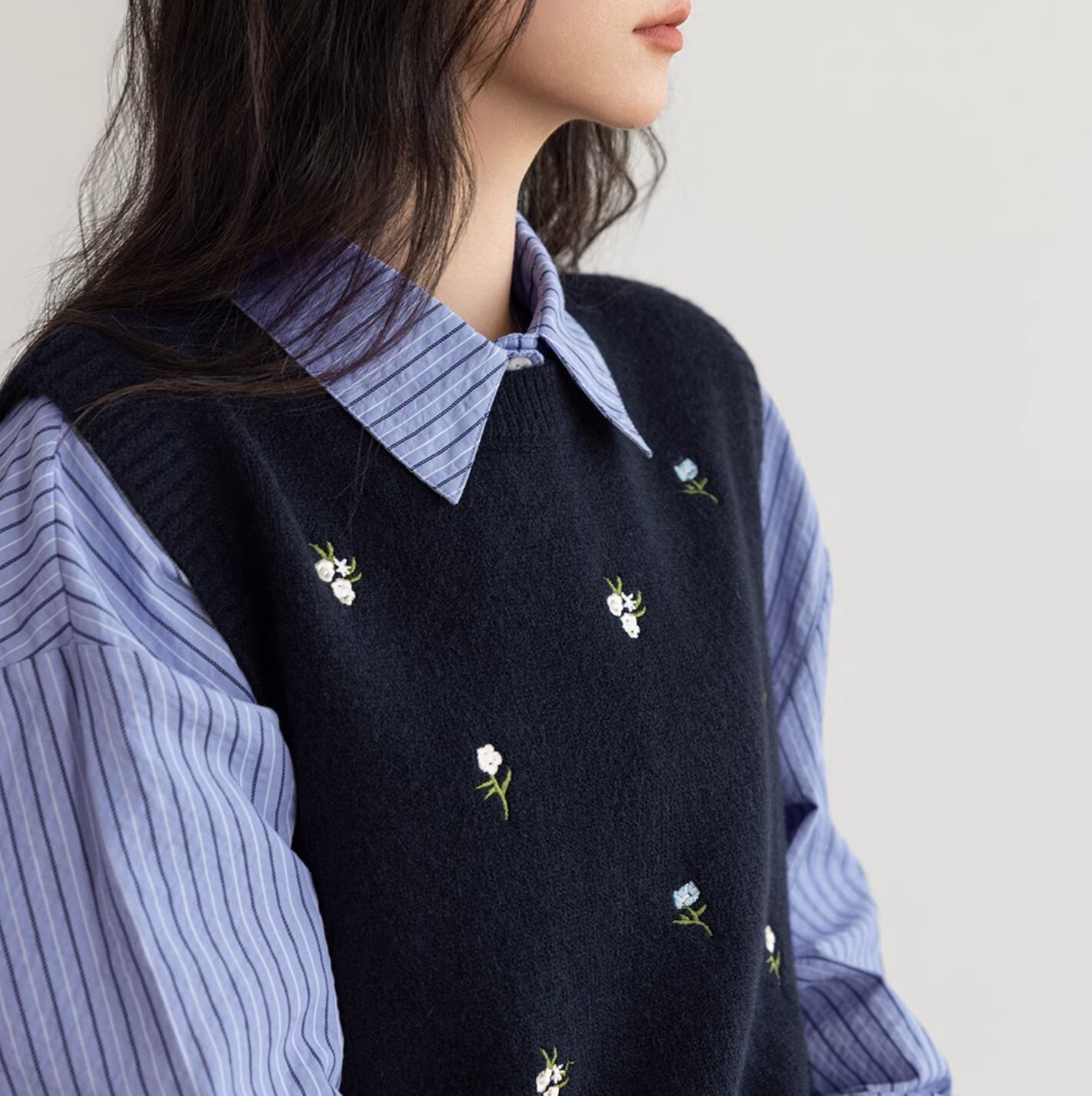 小花柄の刺繍と圧縮ウールのしっかりとした生地感がとてもかわいいベストです。