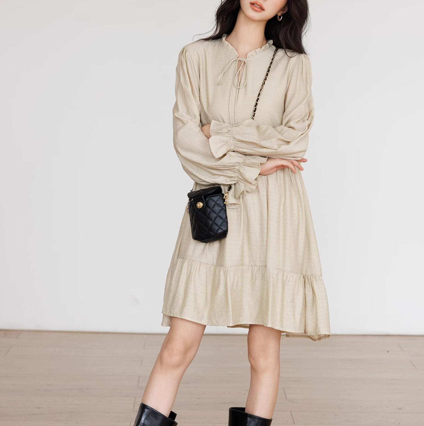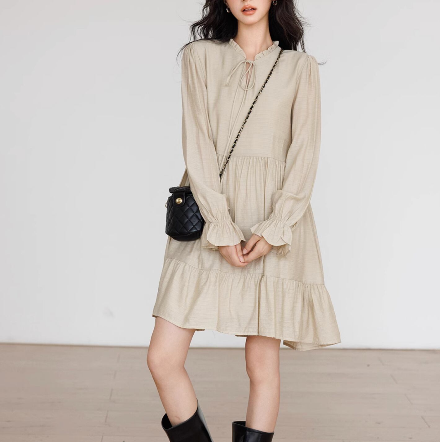 たっぷりとしたギャザーが目を惹くティアードミニワンピース。スッキリとしたノーカラーデザインでフェミニンな印象を纏える一着です。