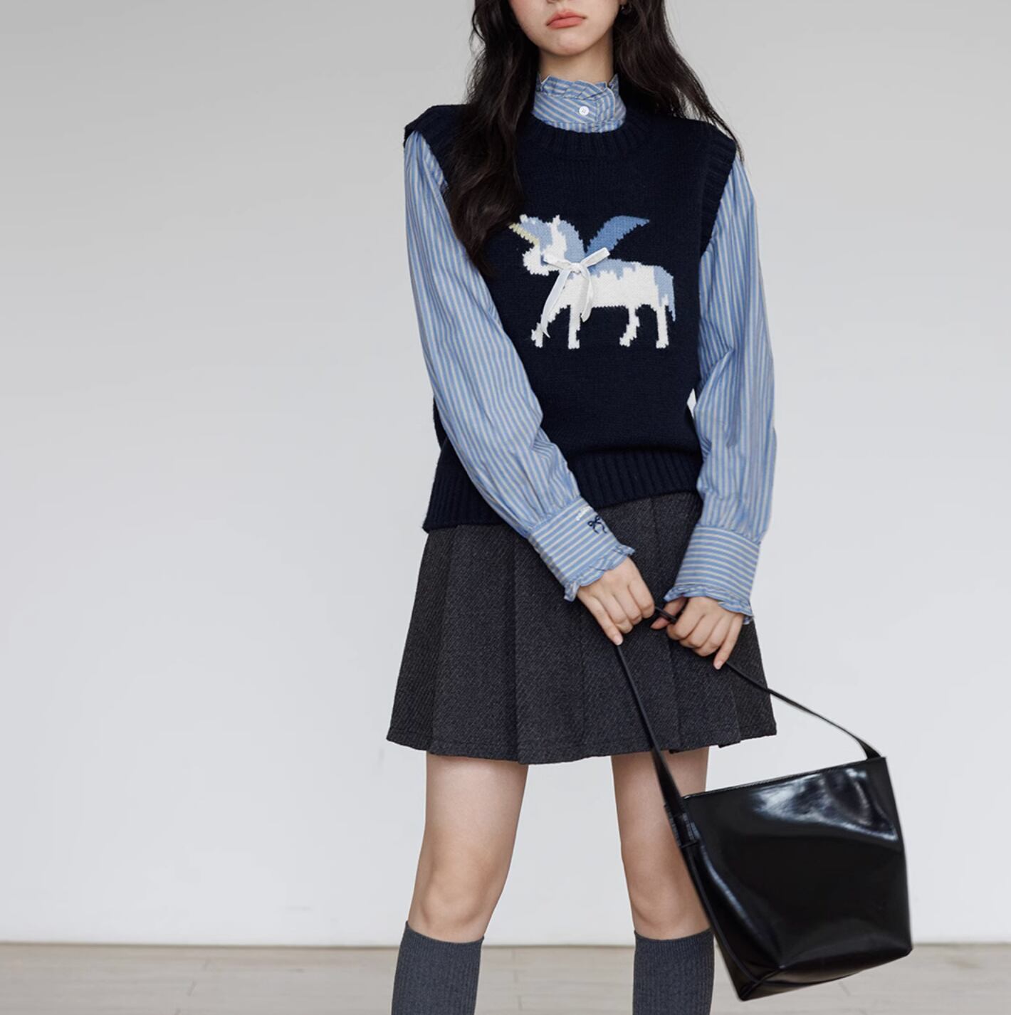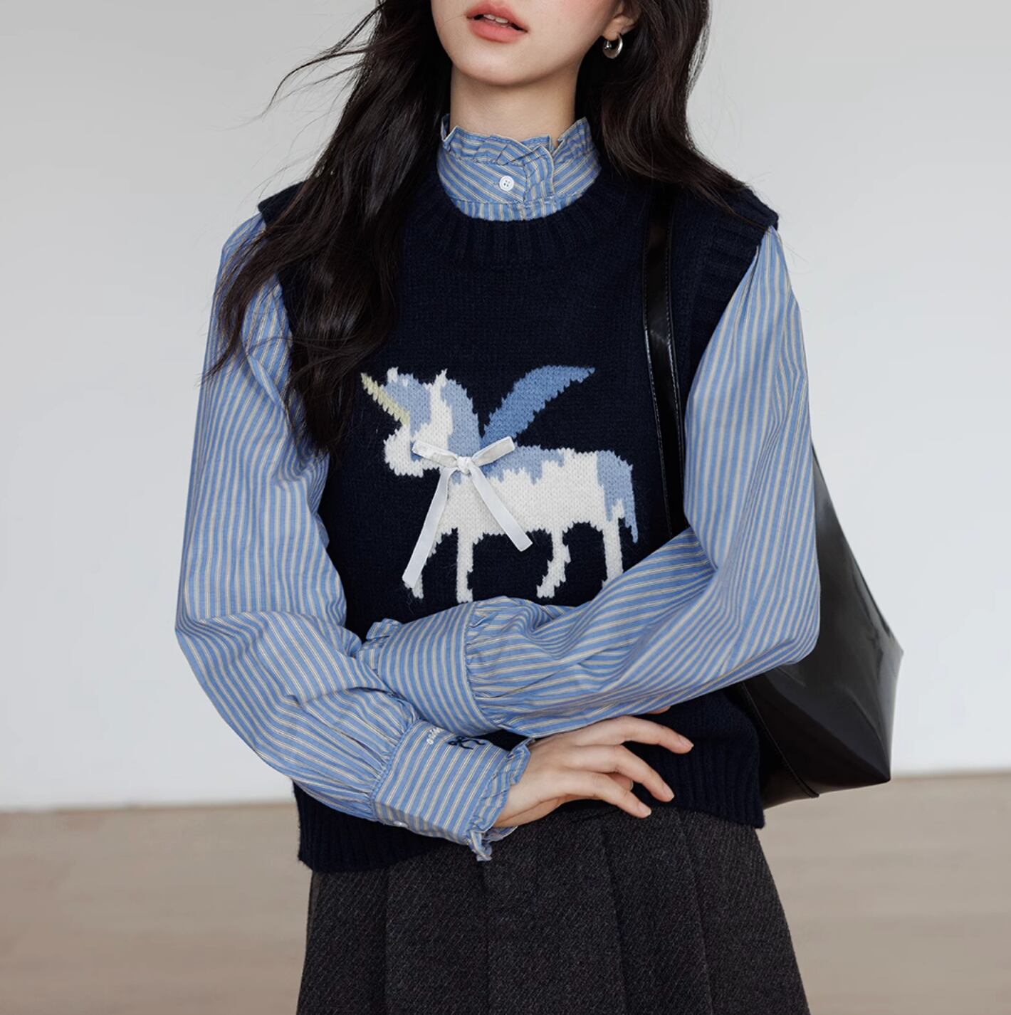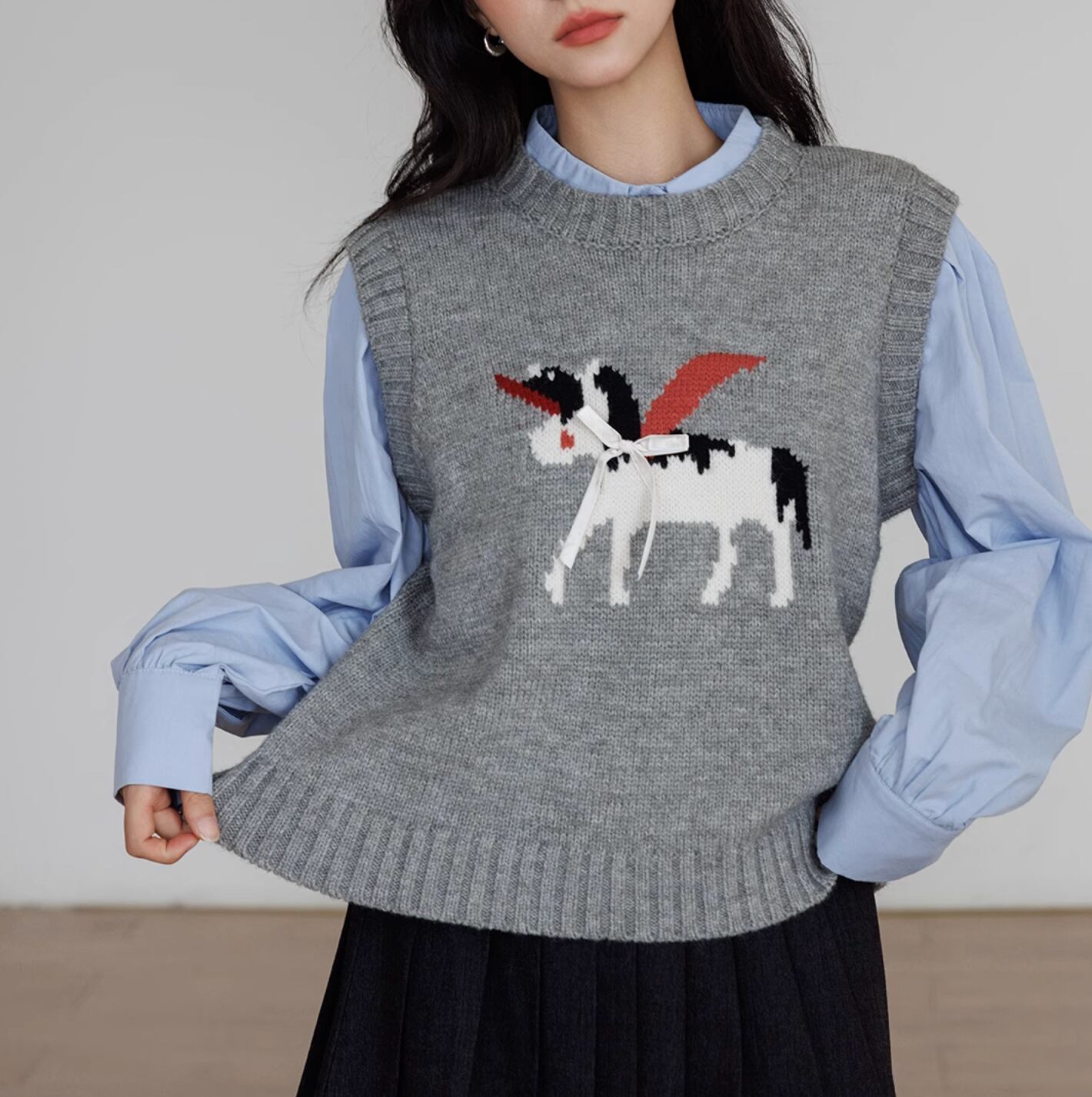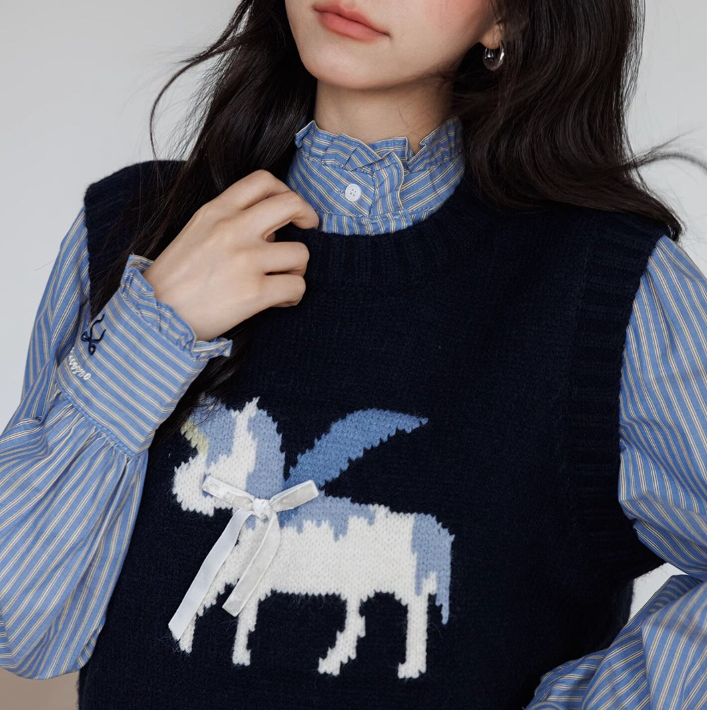 ペガサスのモチーフが施された、柔らかいニットベスト。シンプルなデザインにワンポイントモチーフが目を引きます。リボンのアクセントもとってもキュート。