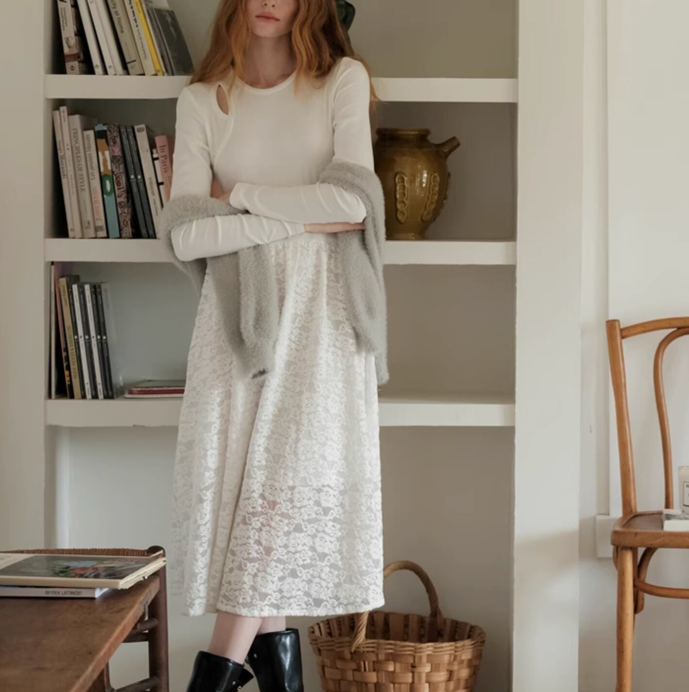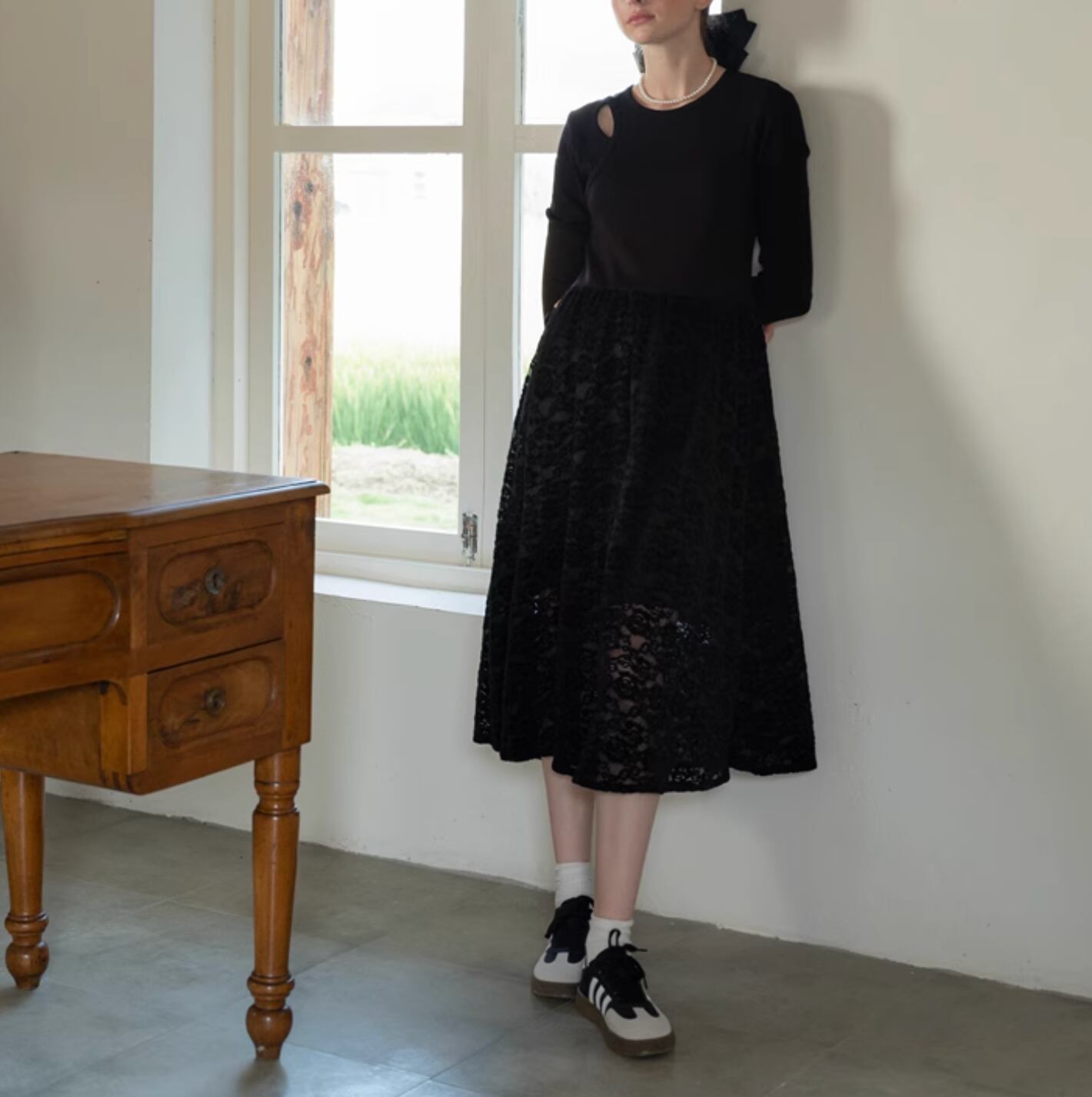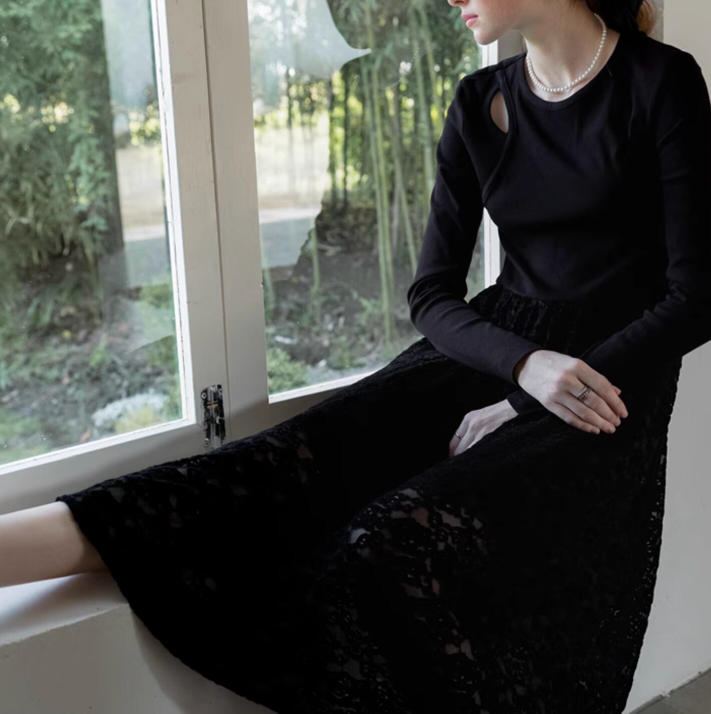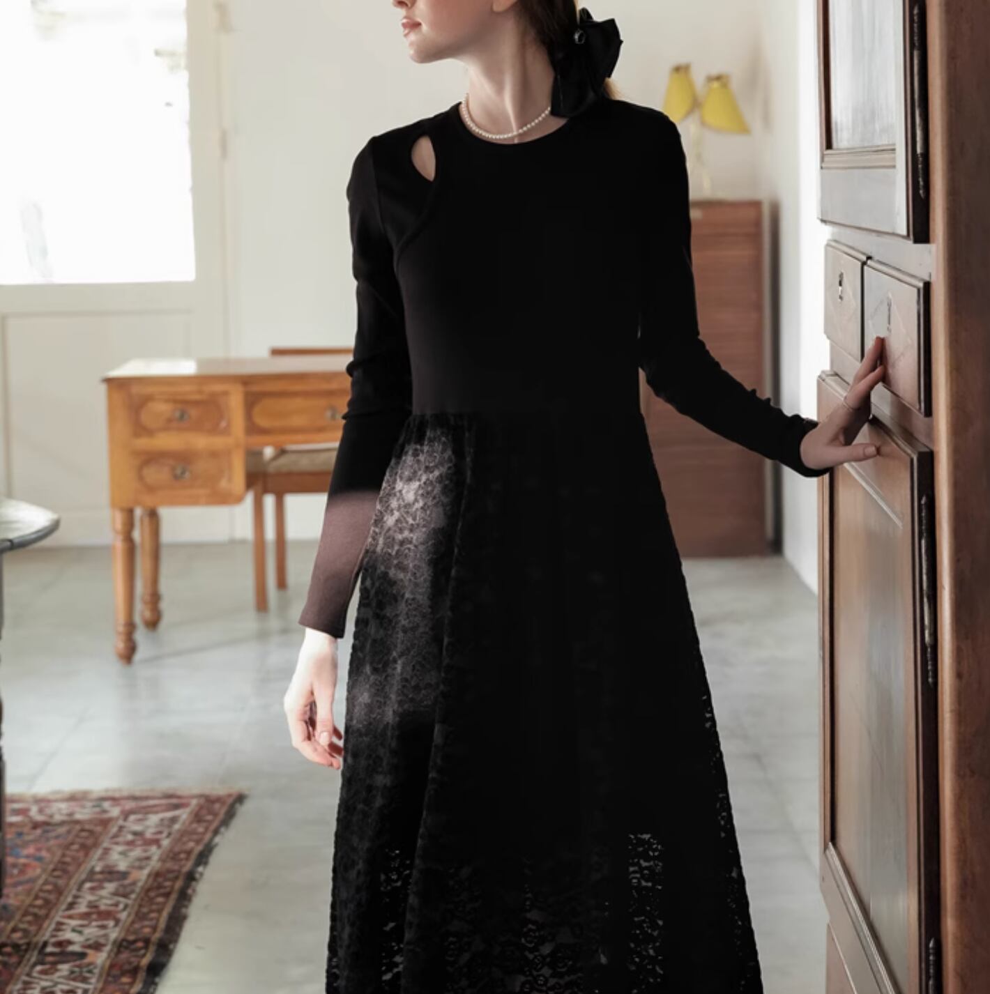 フラワーモチーフの配色レースを使用したフレアスカートがとても華やかな印象になります。程よくウエストにフィットし、着心地も抜群◎ コンパクトなニットを合わせて、オフィススタイリングにしてもよいですし、敢えてクロップド丈の透かし編みニットと合わせてゆるっとしたフェミニンカジュアルに着こなすのもおすすめです。