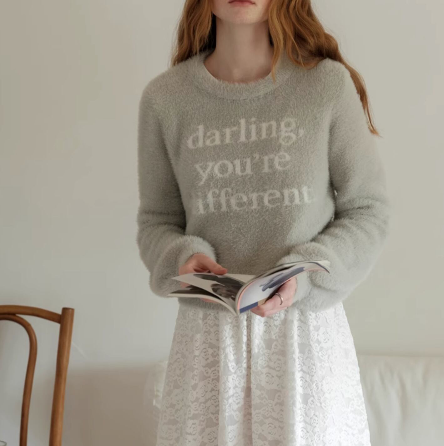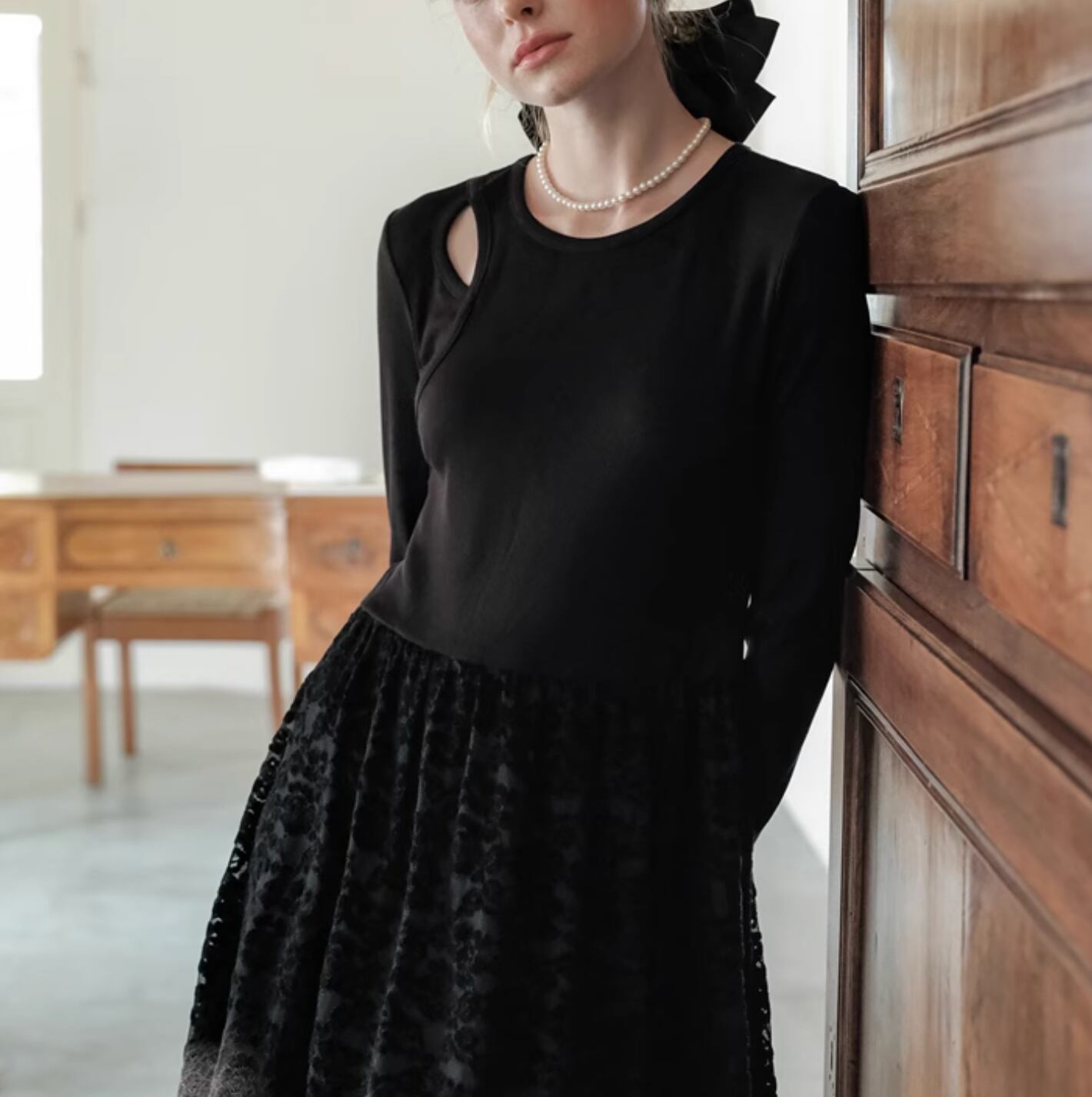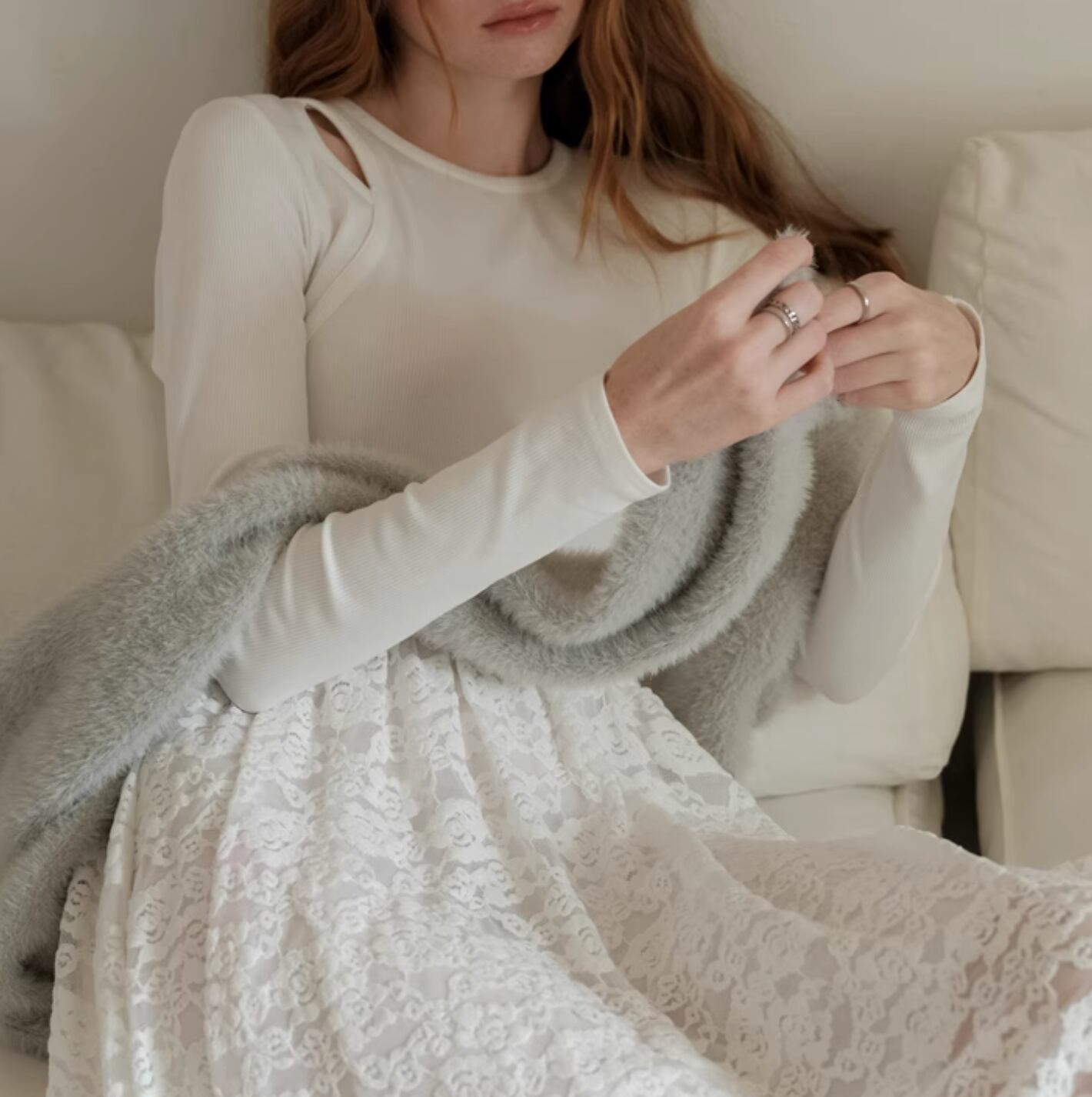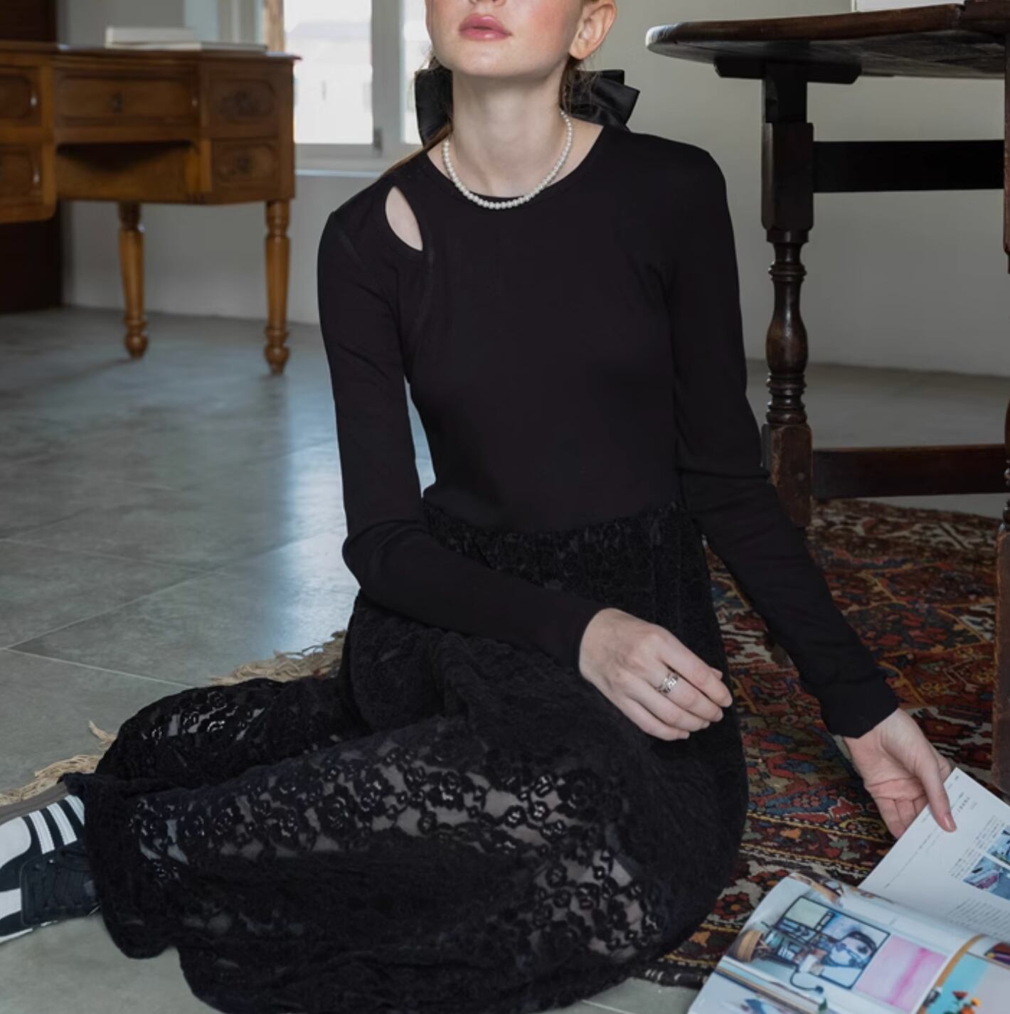 フラワーモチーフの配色レースを使用したフレアスカートがとても華やかな印象になります。程よくウエストにフィットし、着心地も抜群◎ コンパクトなニットを合わせて、オフィススタイリングにしてもよいですし、敢えてクロップド丈の透かし編みニットと合わせてゆるっとしたフェミニンカジュアルに着こなすのもおすすめです。