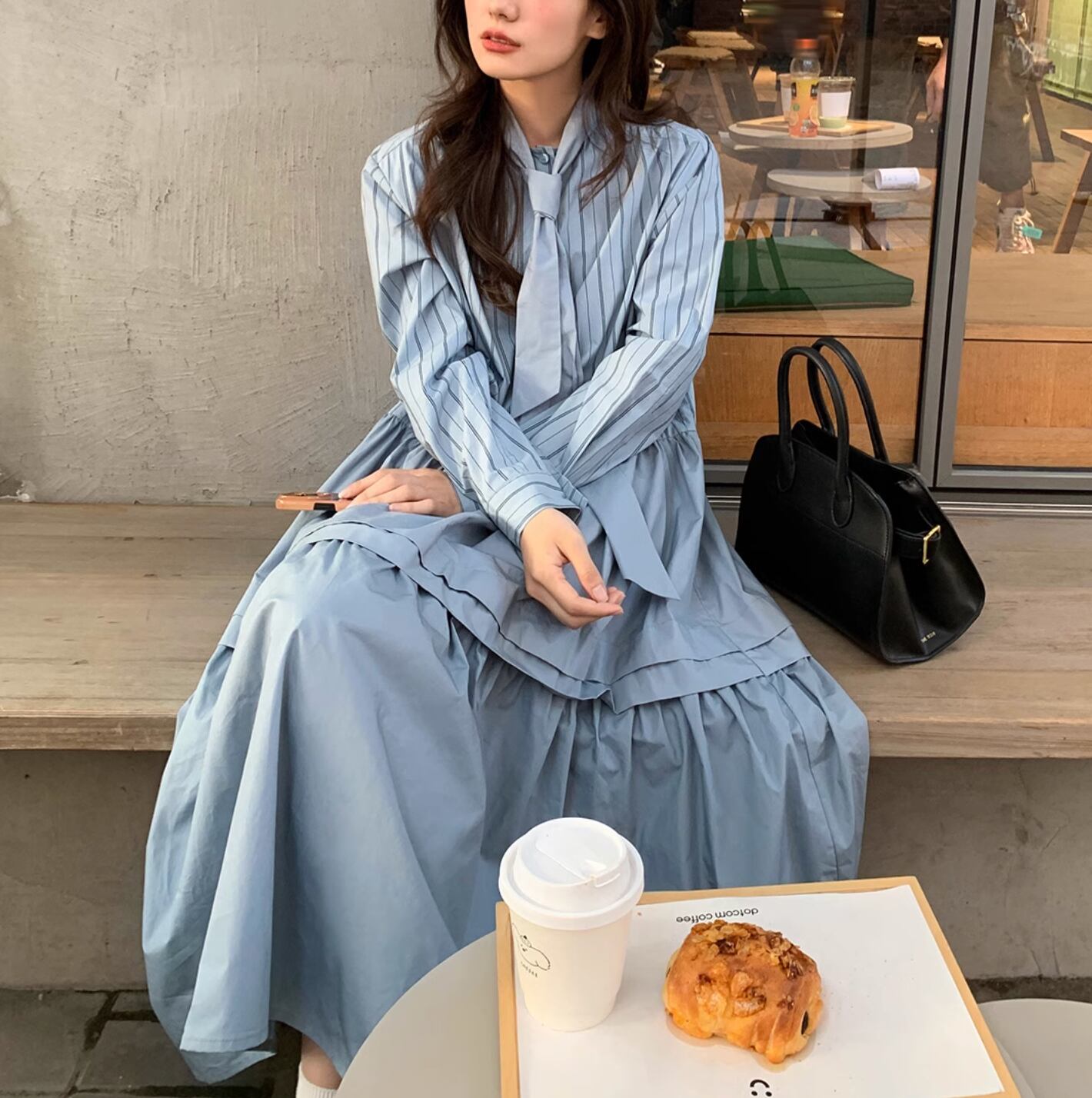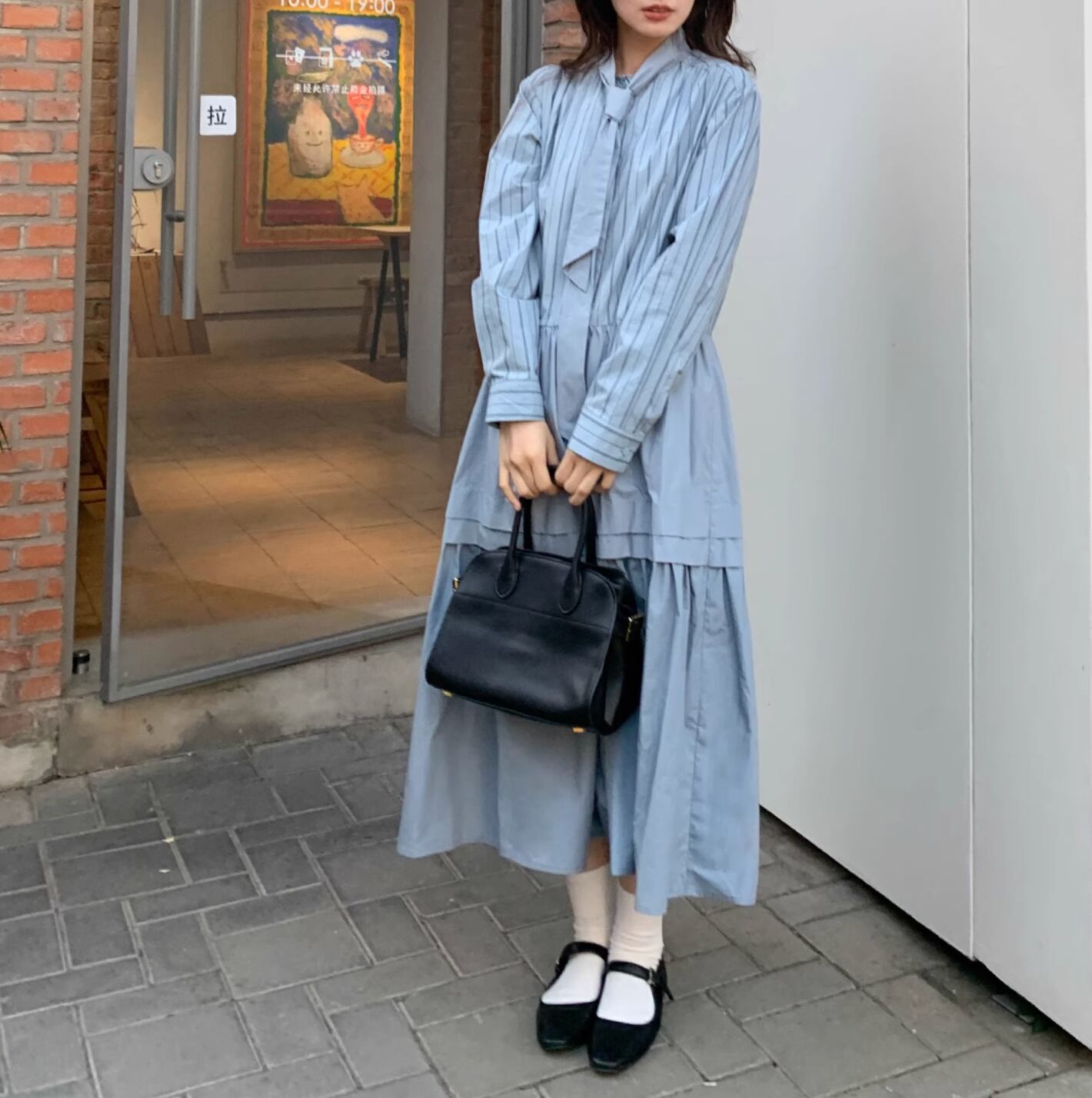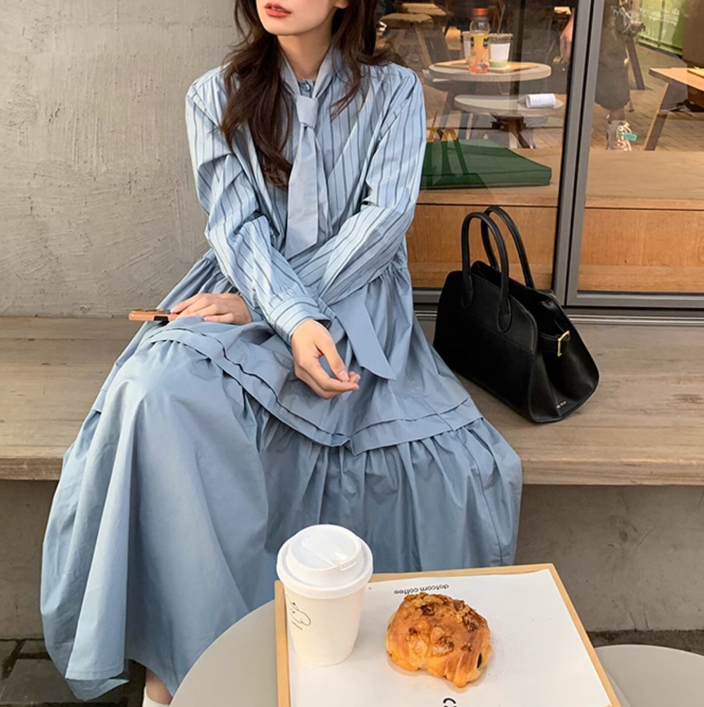 清楚ガーリーな海外デザインのロング丈長袖ワンピース。