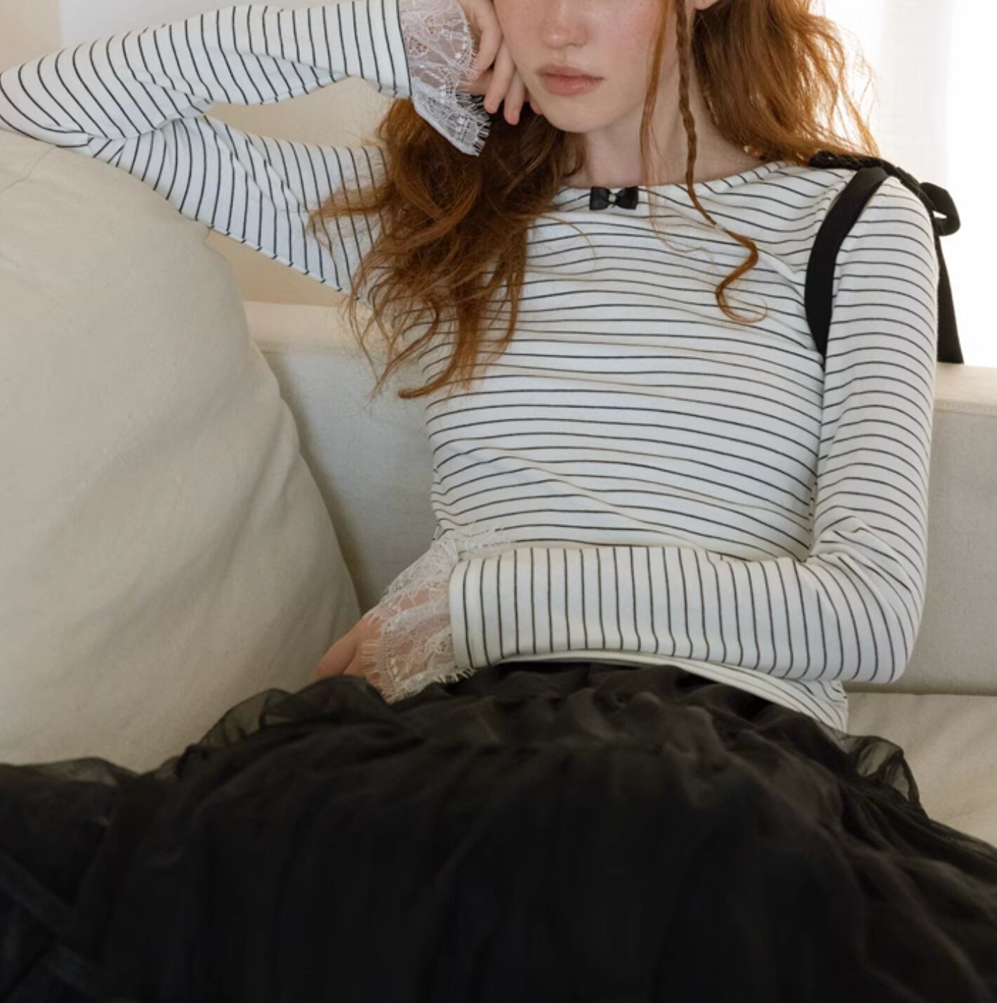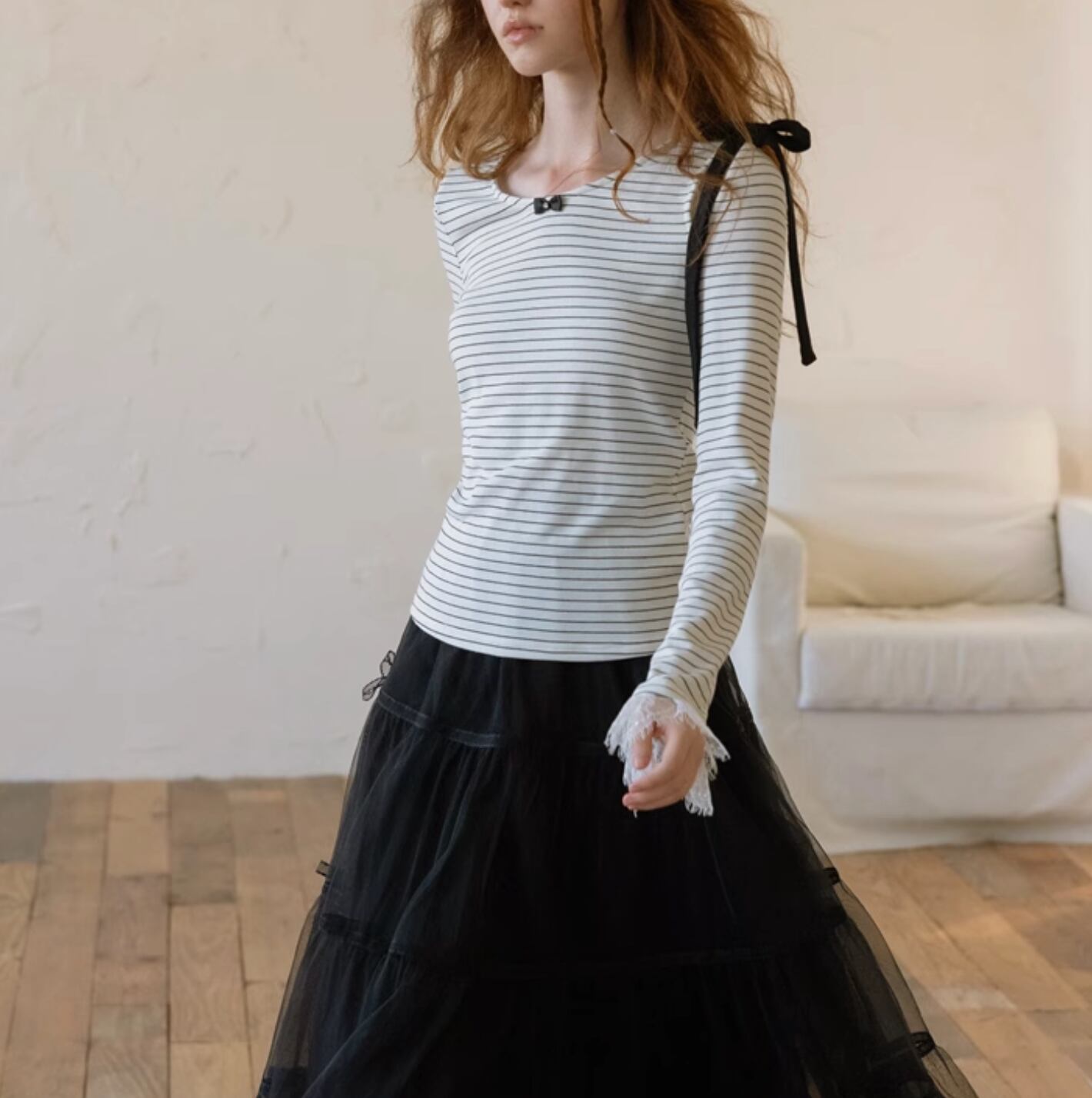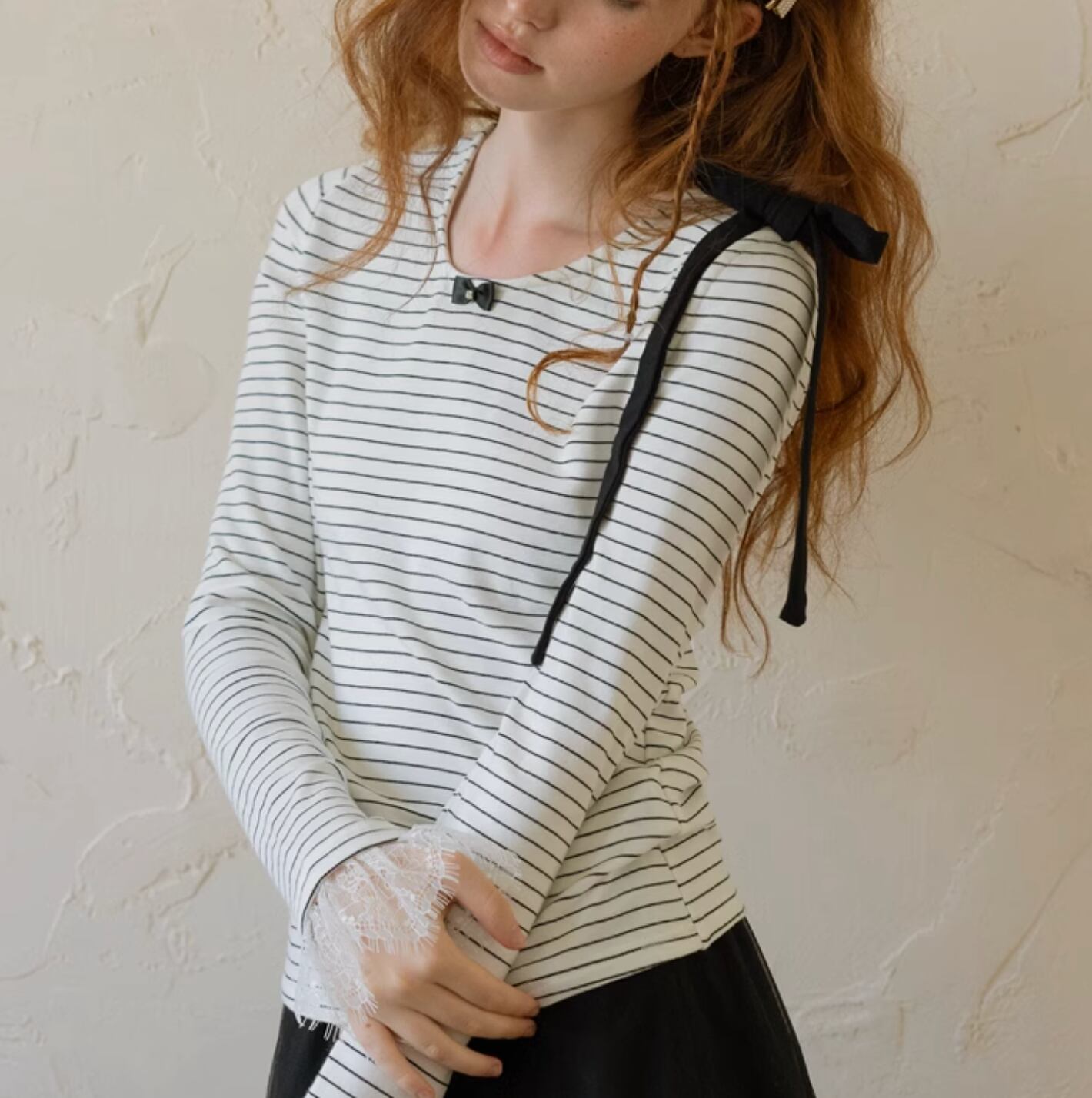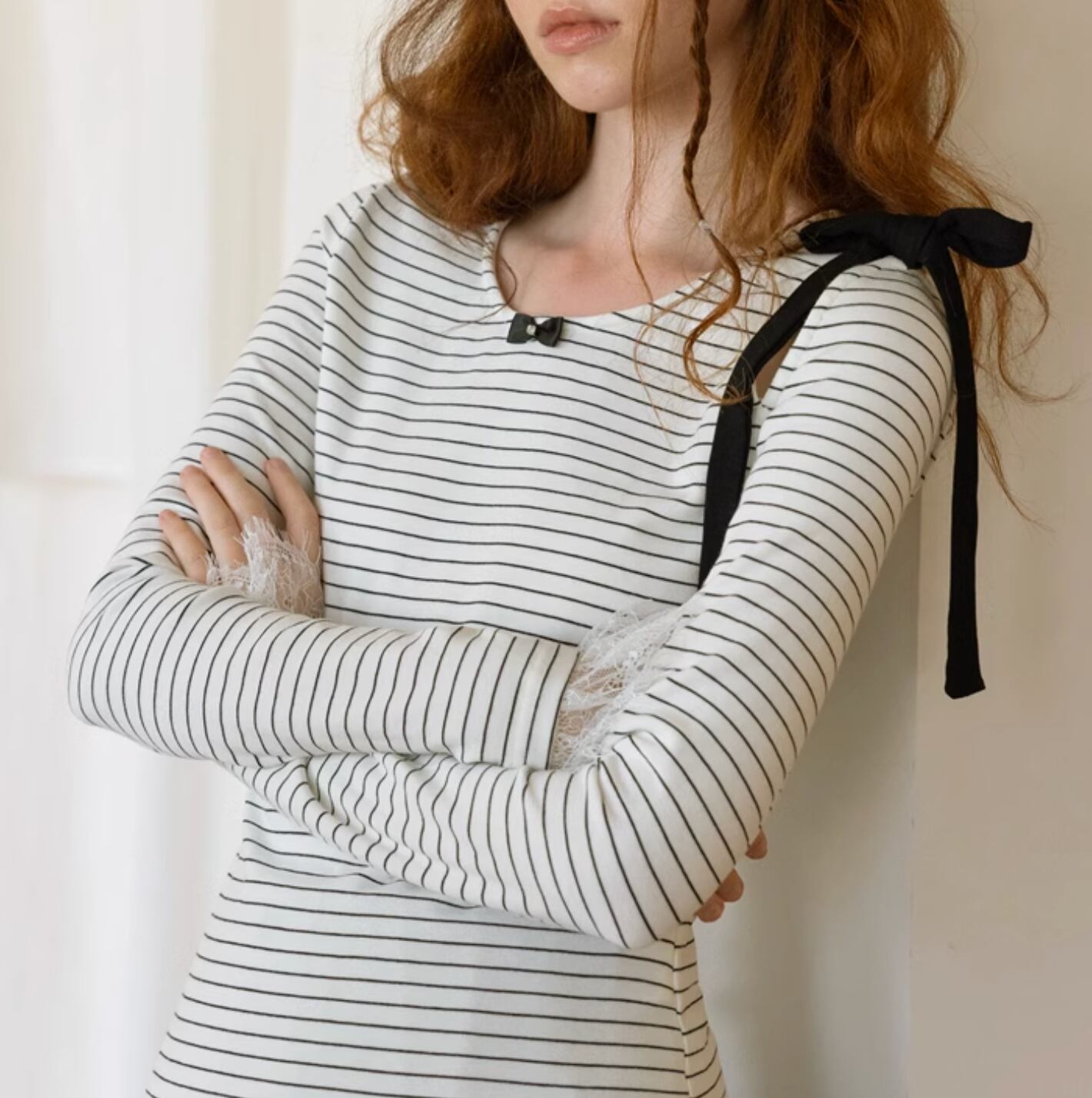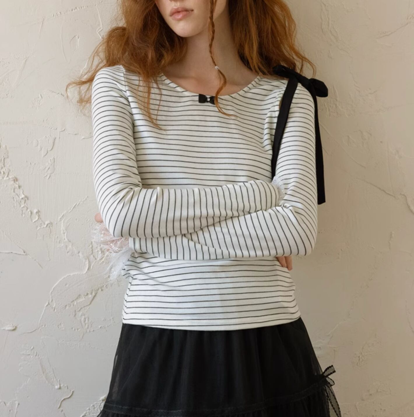 カジュアルなボーダーパターンのトップスにさりげなくリボンがあしらわれた長袖トップス。大人っぽいコーデだけでなく、レディライクなコーデにも合わせやすいため、オールシーズン着回しいただけやすいアイテムです。胸元にある小ぶりのリボンがキュートで女性らしく、華やかさも演出してくれます。