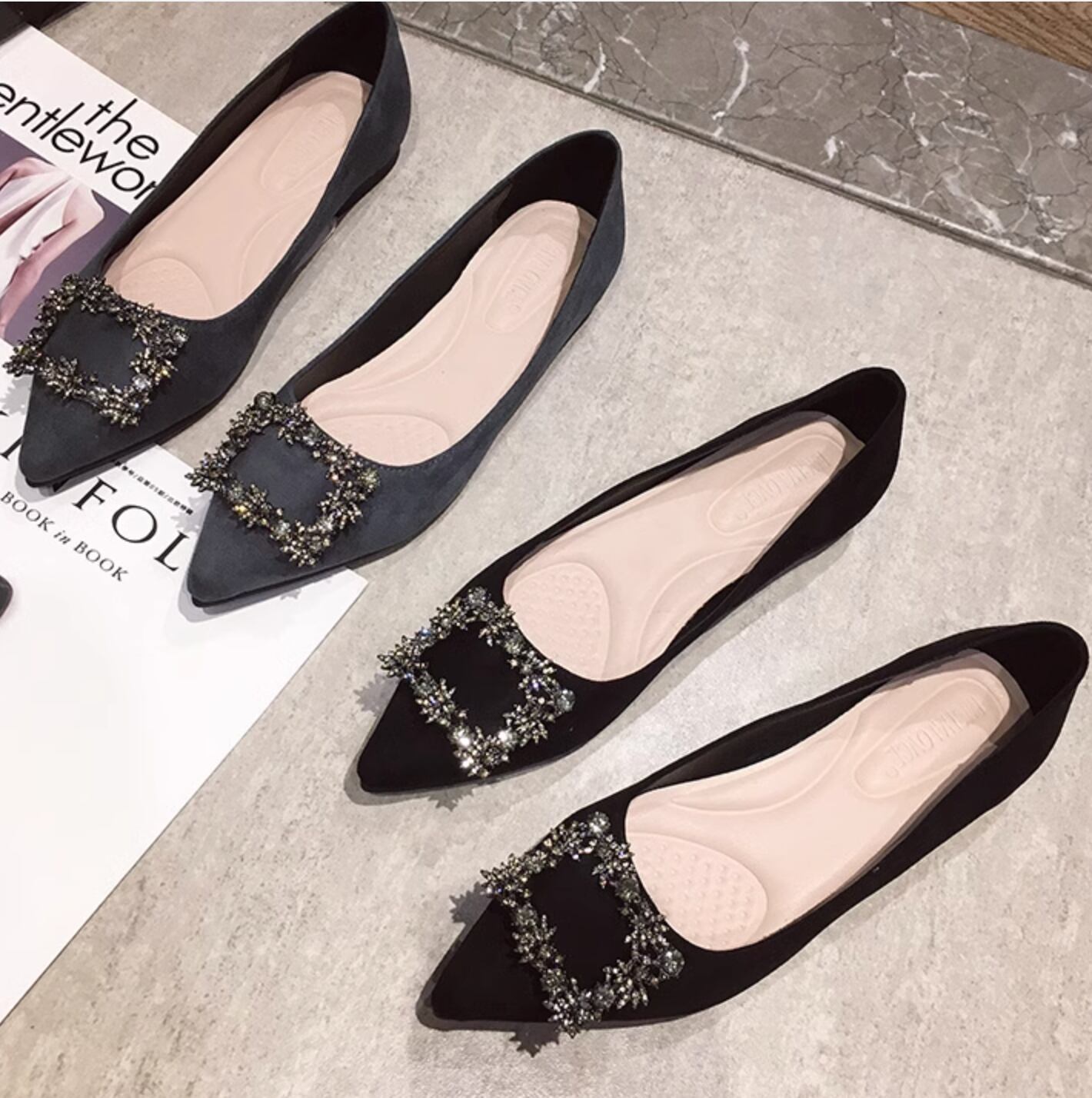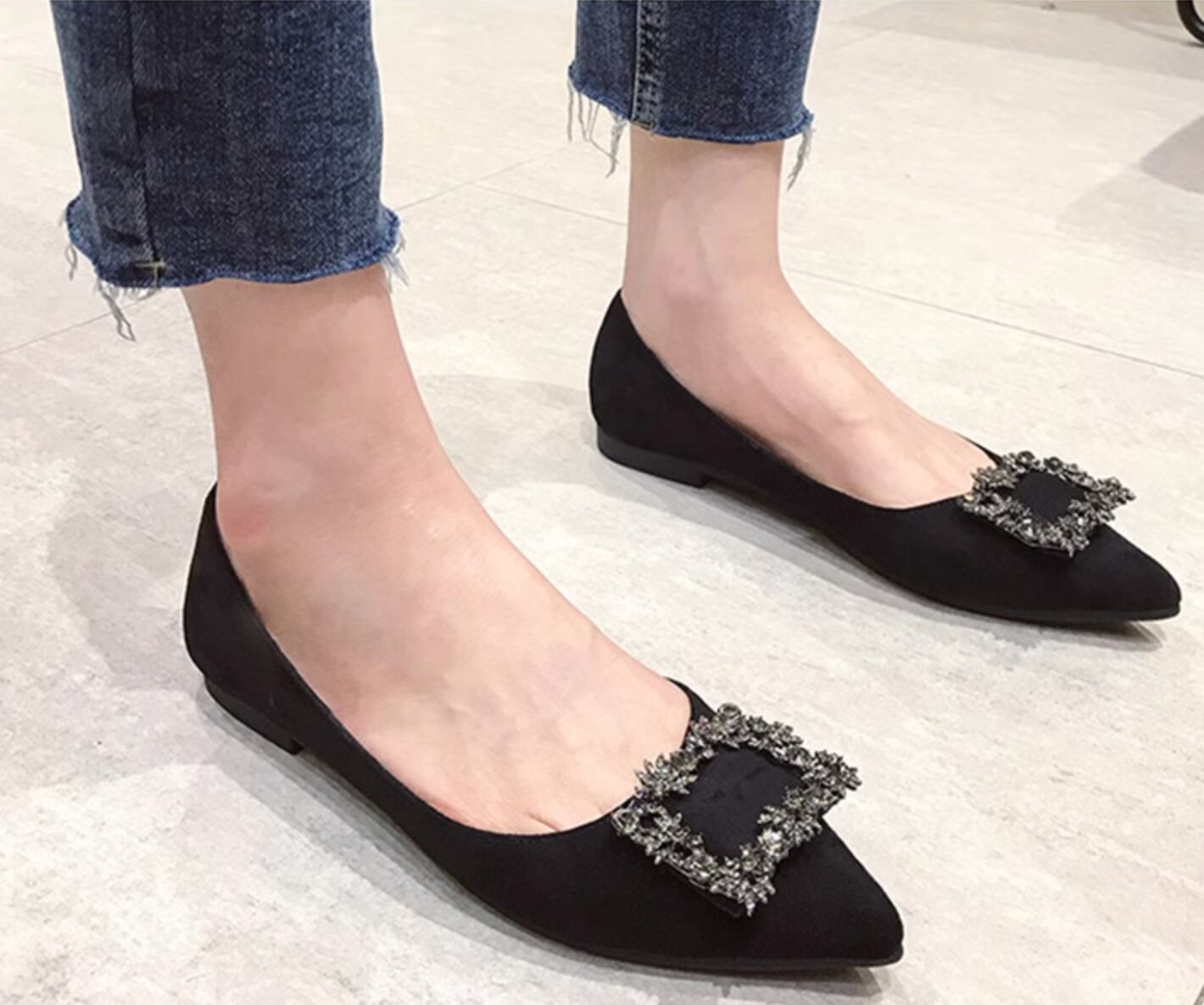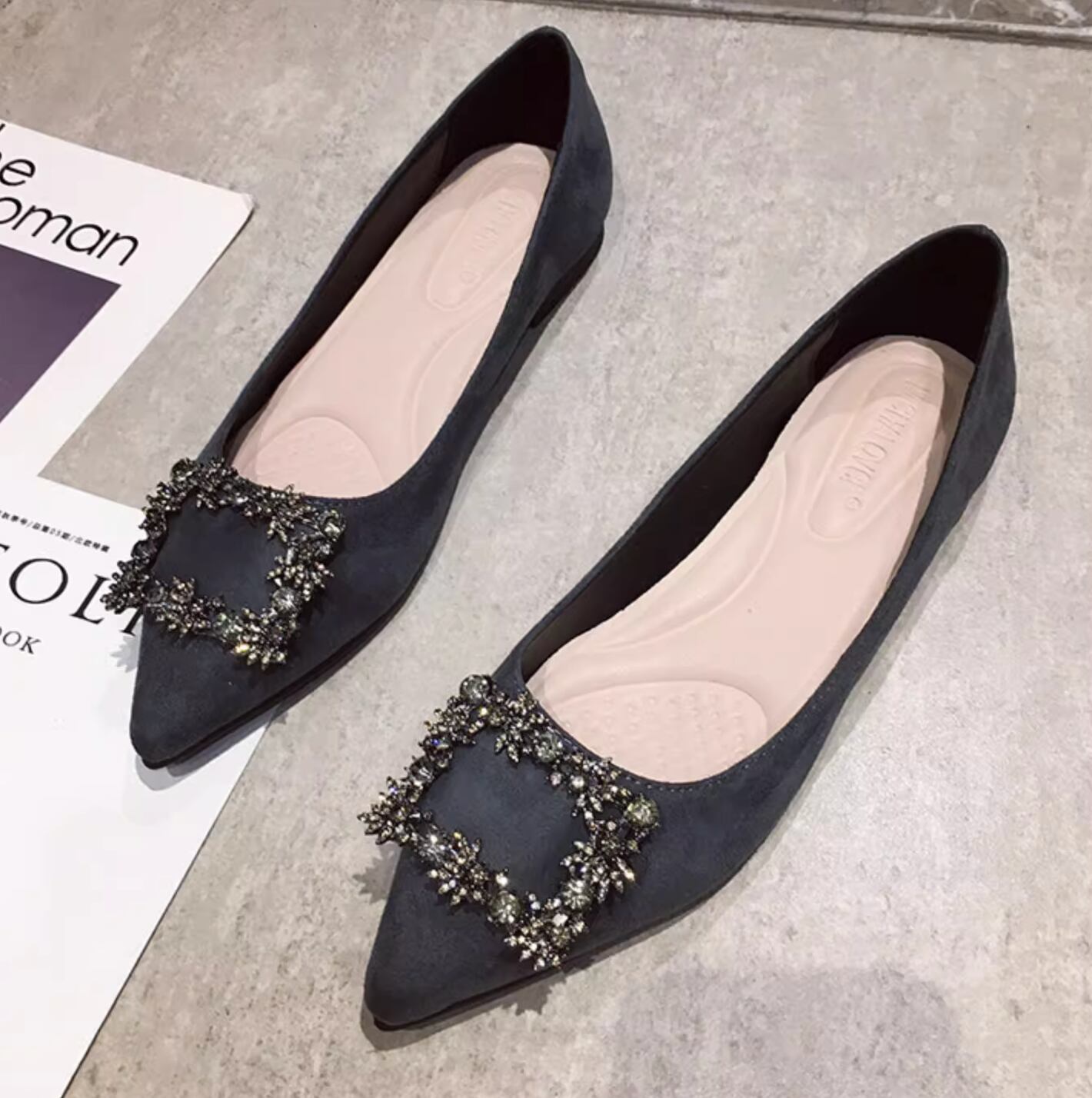 高級感のあるスエードに華やかなビジューを合わせたフラットパンプスです。