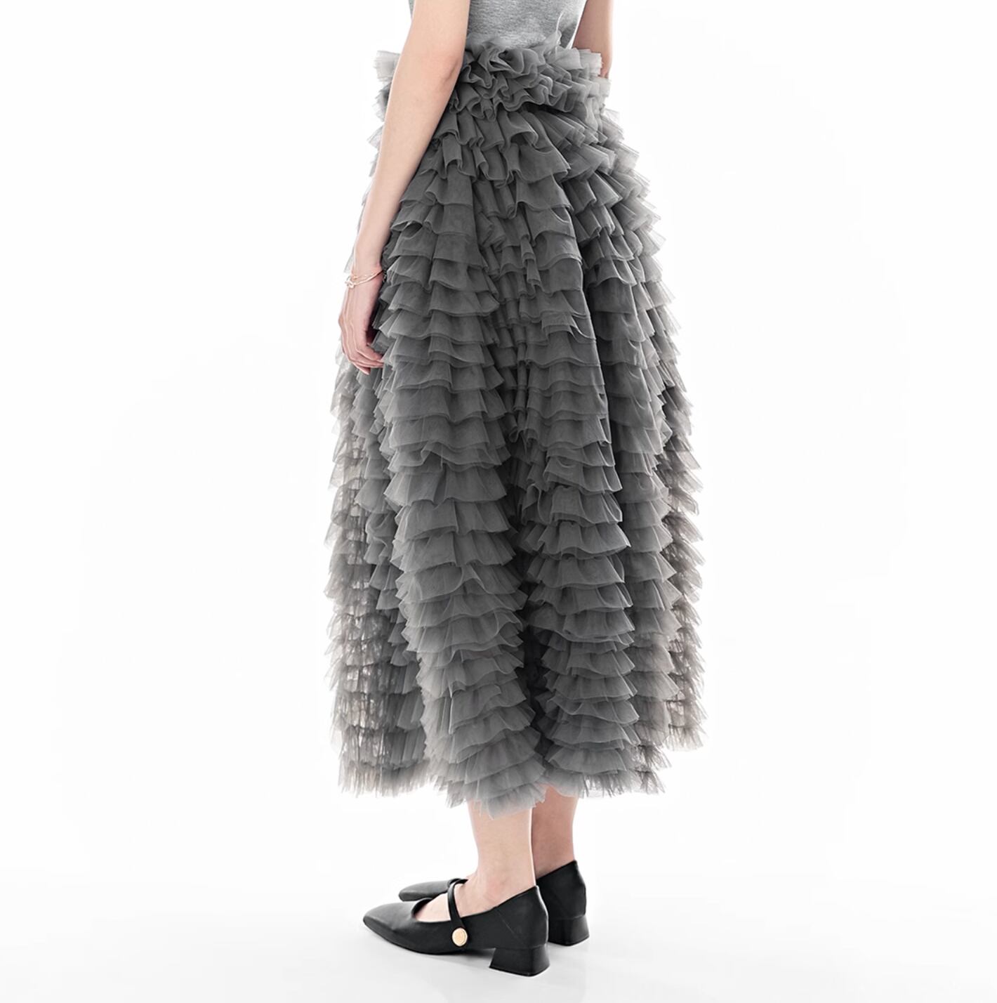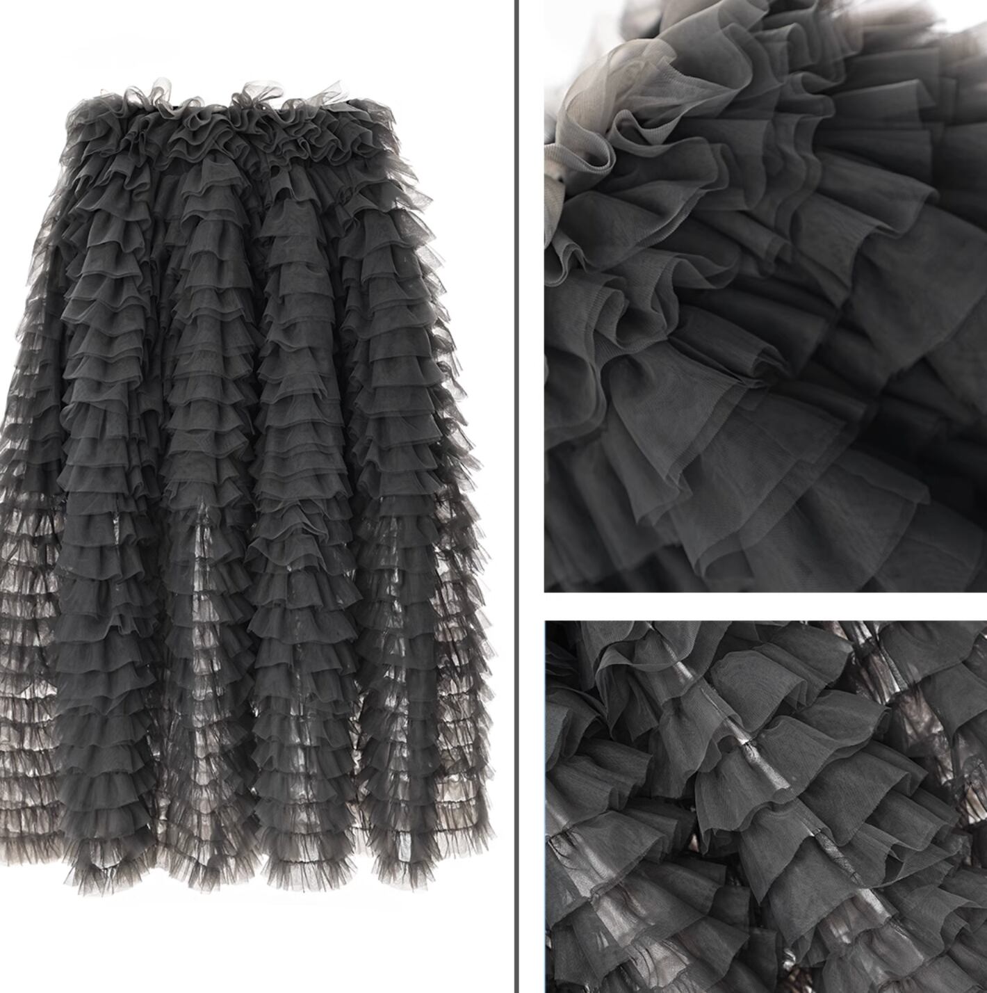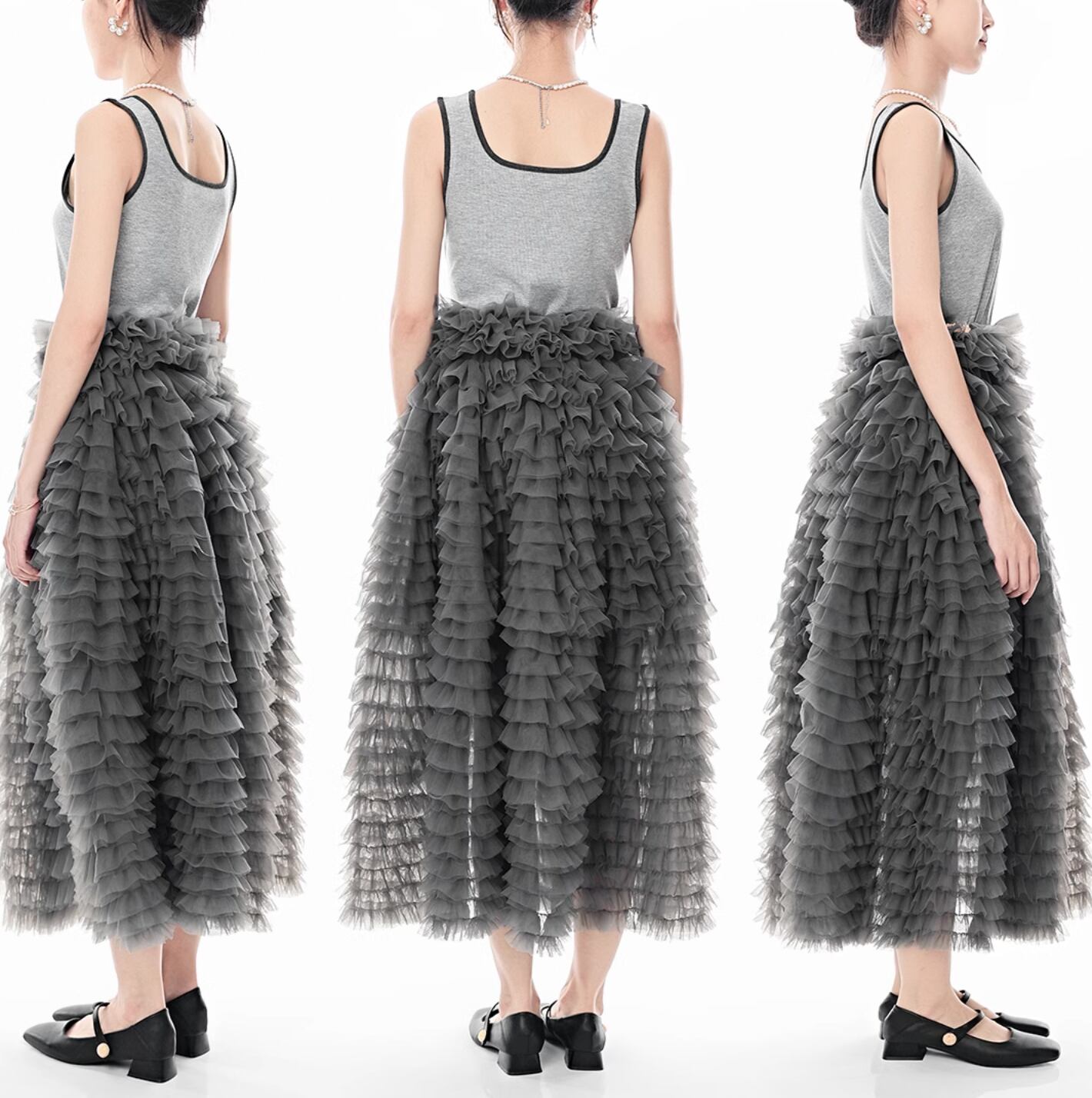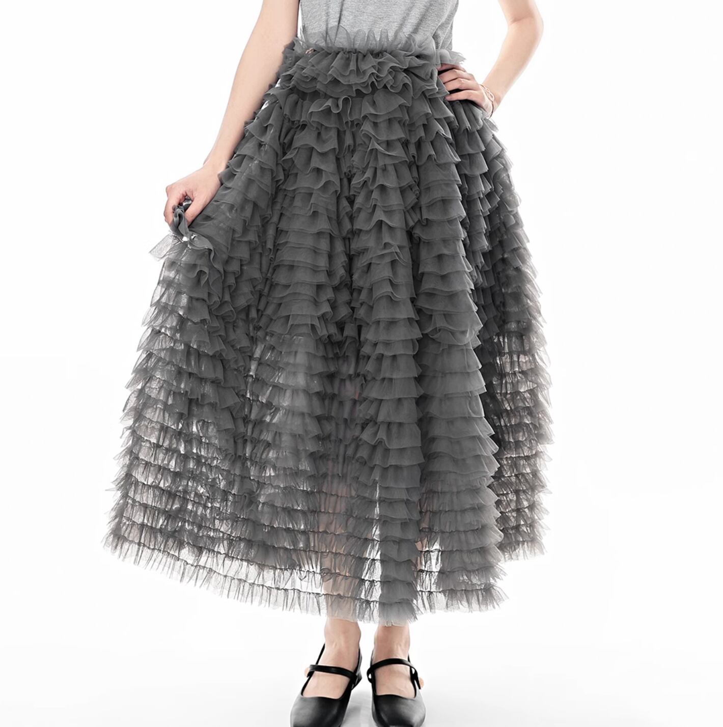 チュールで横を数段に飾った素敵なティアードスカート。ゴム入りのウエスト部分が着脱やすく使い便利に仕上げています。ややボリュームのあるドレープシルエットがエレガンスな女性印象にあります。合わせるアイテムにより、ディリーラインにもフォーマルなシーンにも活躍できる万能アイテムです♡