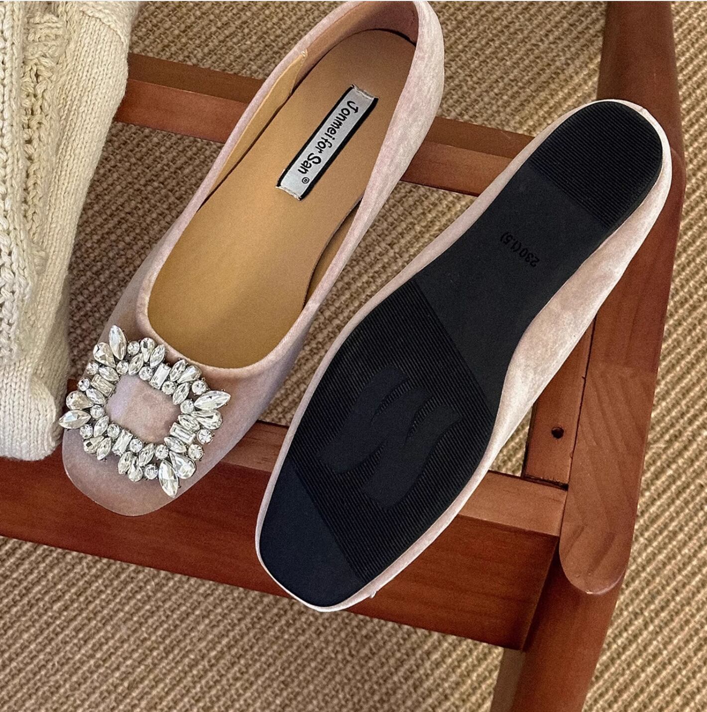 【Velvet Square Buckle Rhinestone Shallow Shoes】