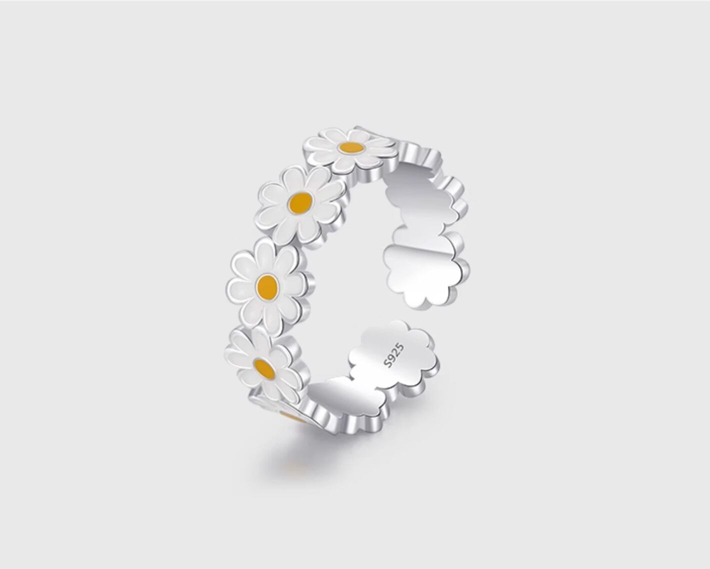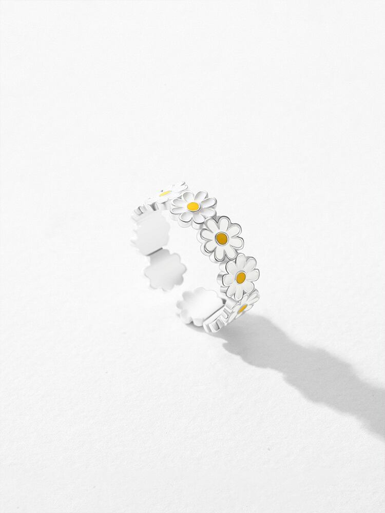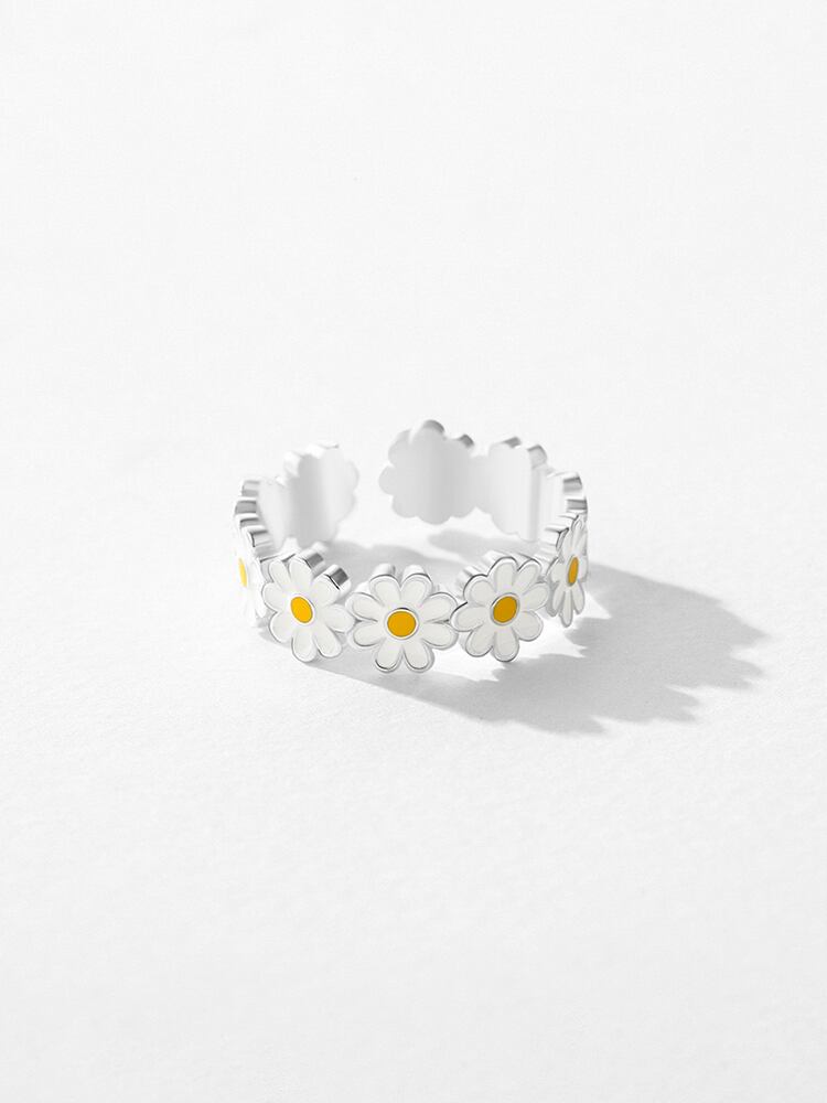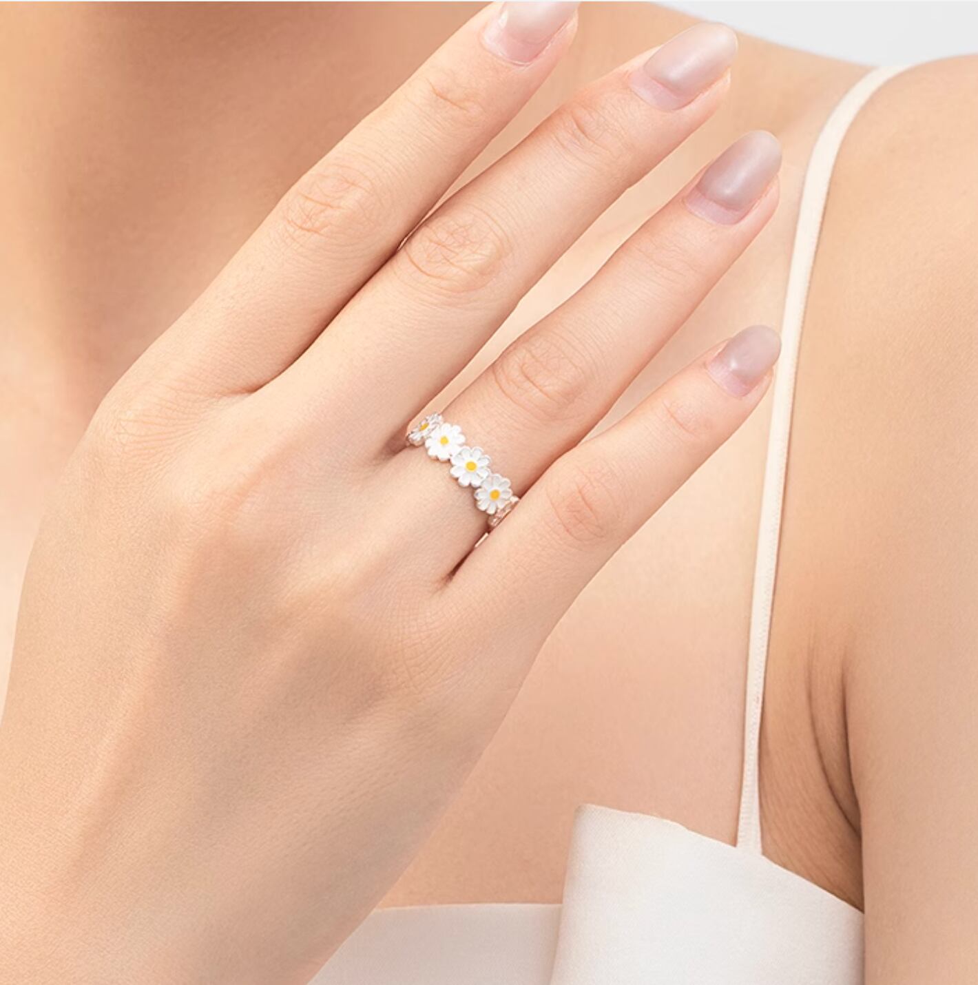 シンプルな花びらの中心の花床を立体的に盛り上がらせた手元を可愛らしく魅せてくれる作品です♡リングが繋がっていないオープン形状なので、指に合わせて微調整できるのも便利なのでおススメです。