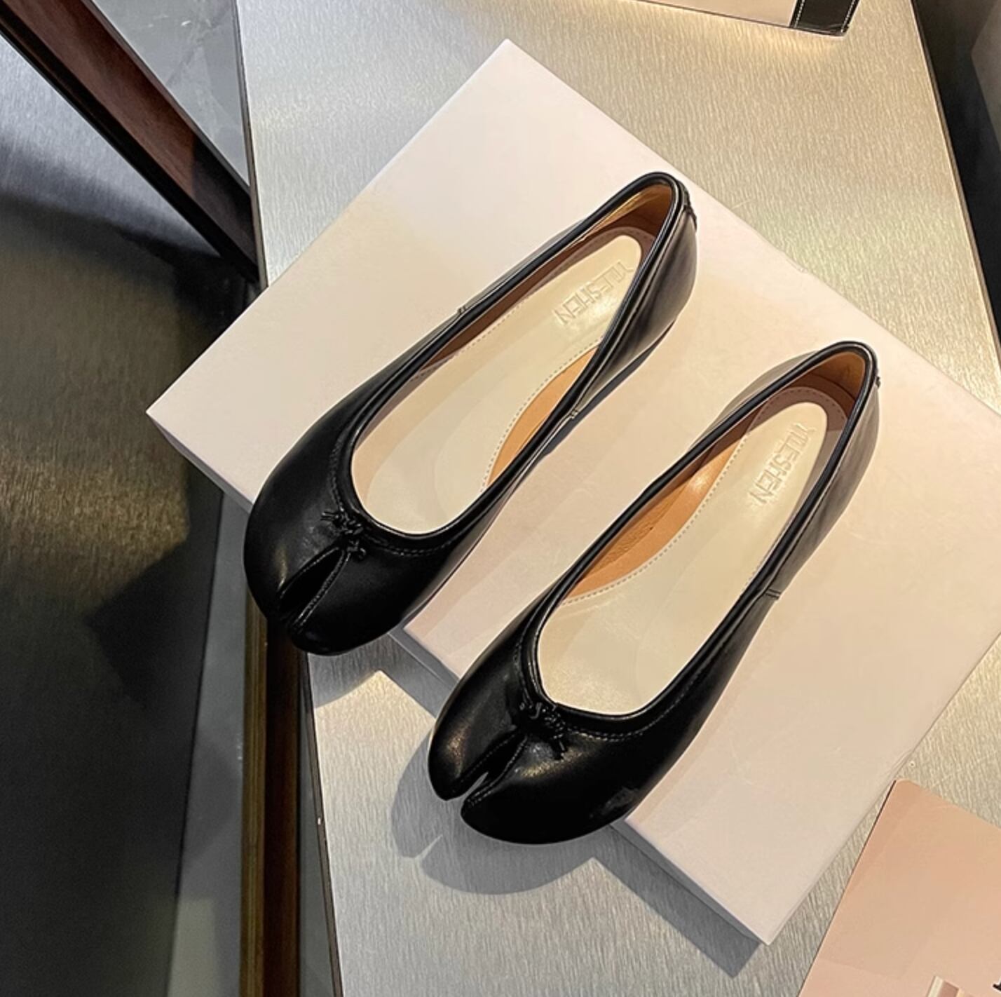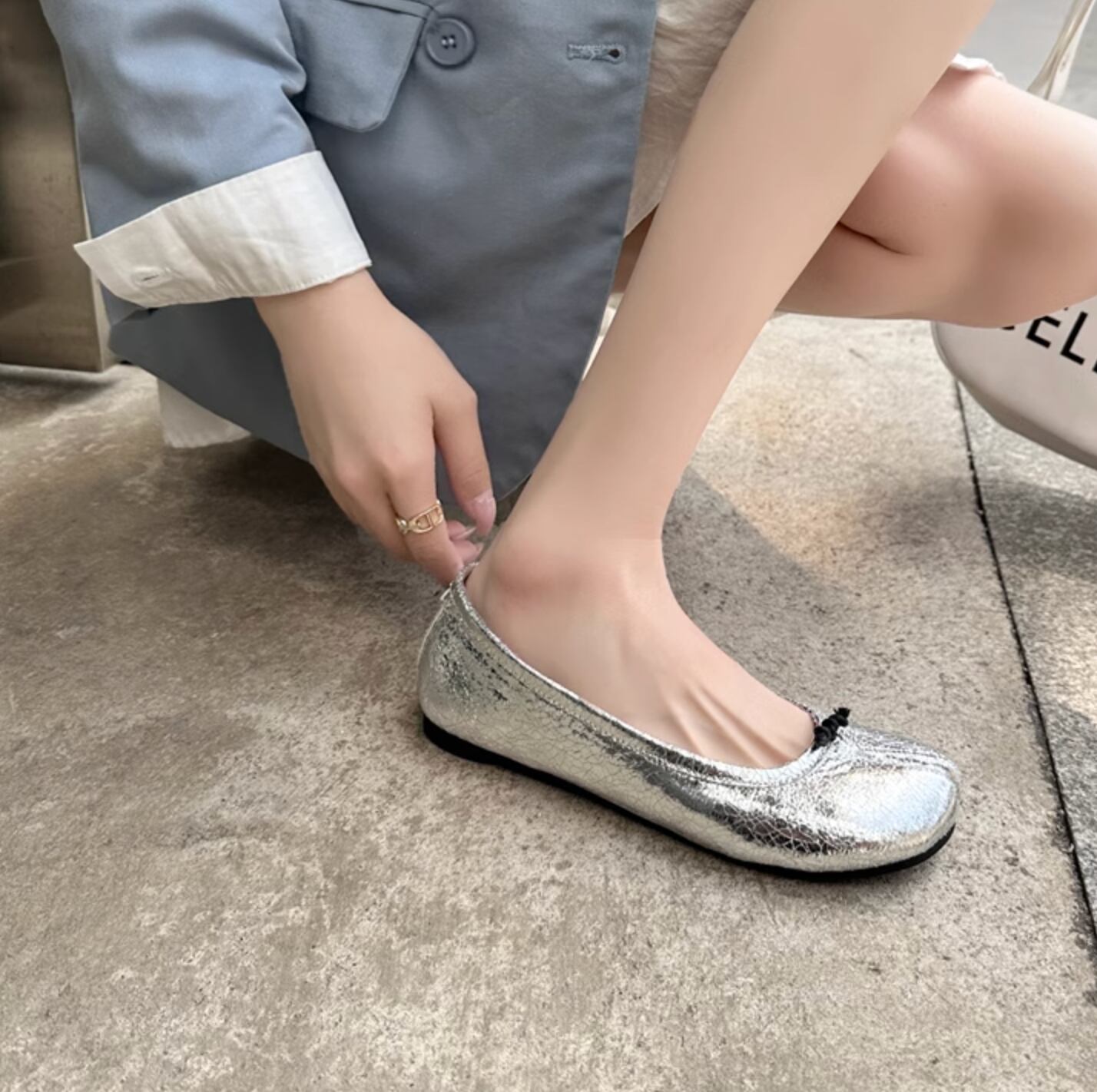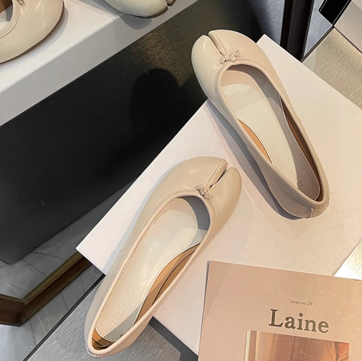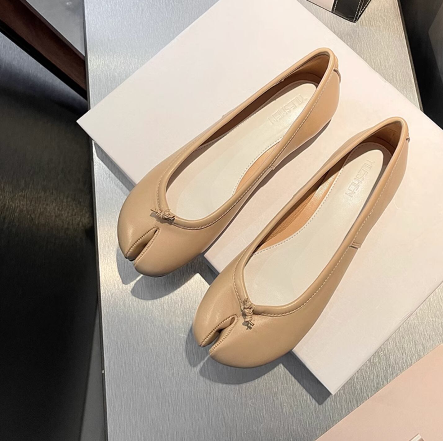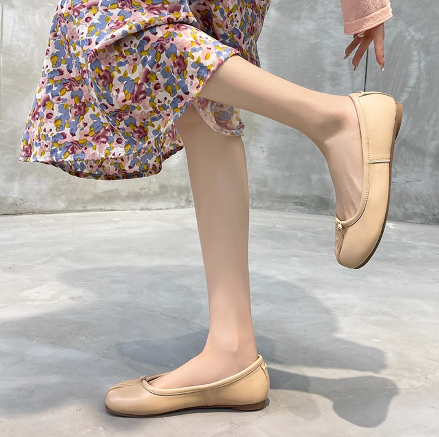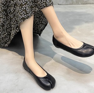 足袋をモチーフにした、ユニークなシルエットが魅力のバレエパンプス。デニムに合わせてカジュアルなスタイリングにも、スラックスなどのきれいめなアイテムにも合わせやすいアイテム。今季トレンドのトラックパンツなどスポーティー要素のあるアイテムとも相性抜群◎。シルバー、ベージュ、ブラウン、ブラック、アプリコットの5色展開。