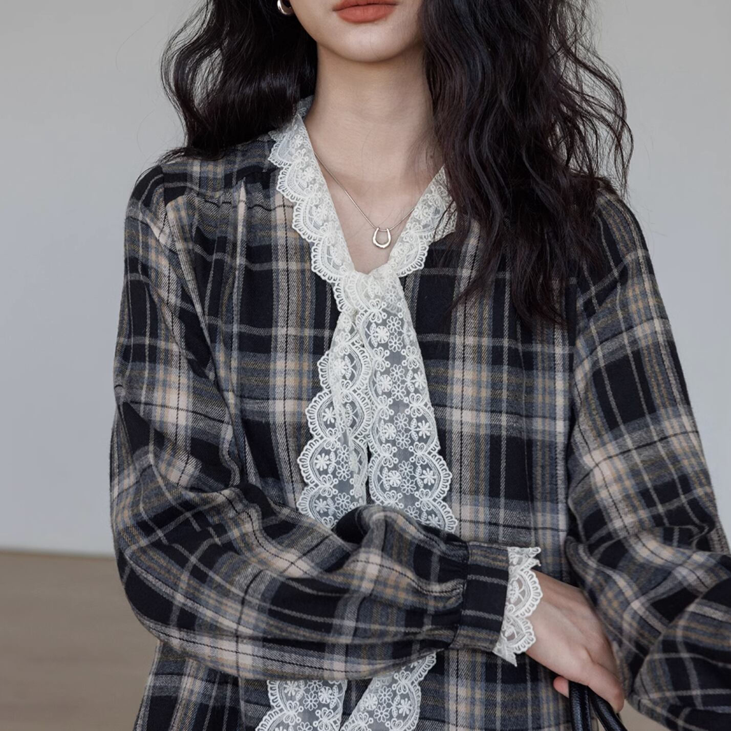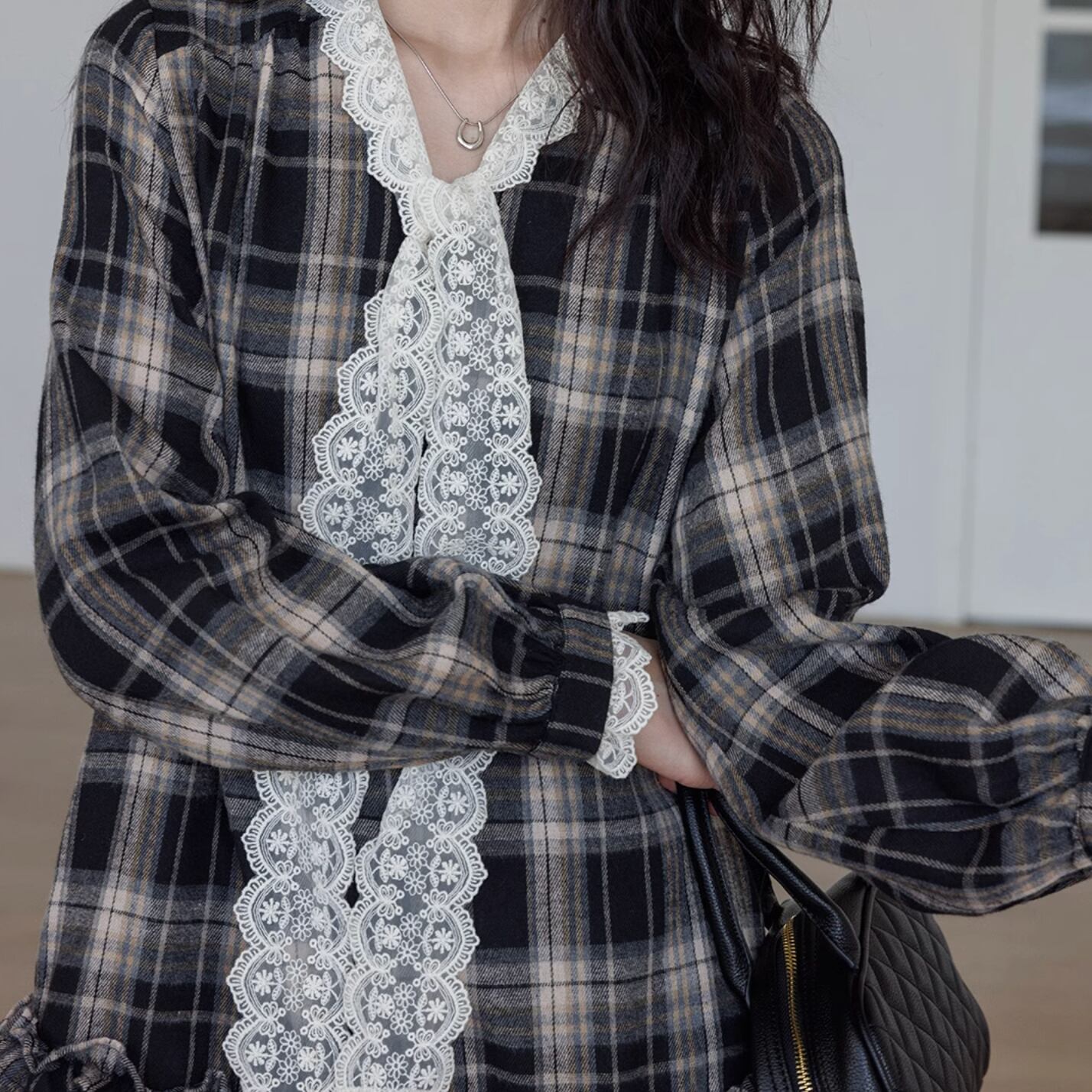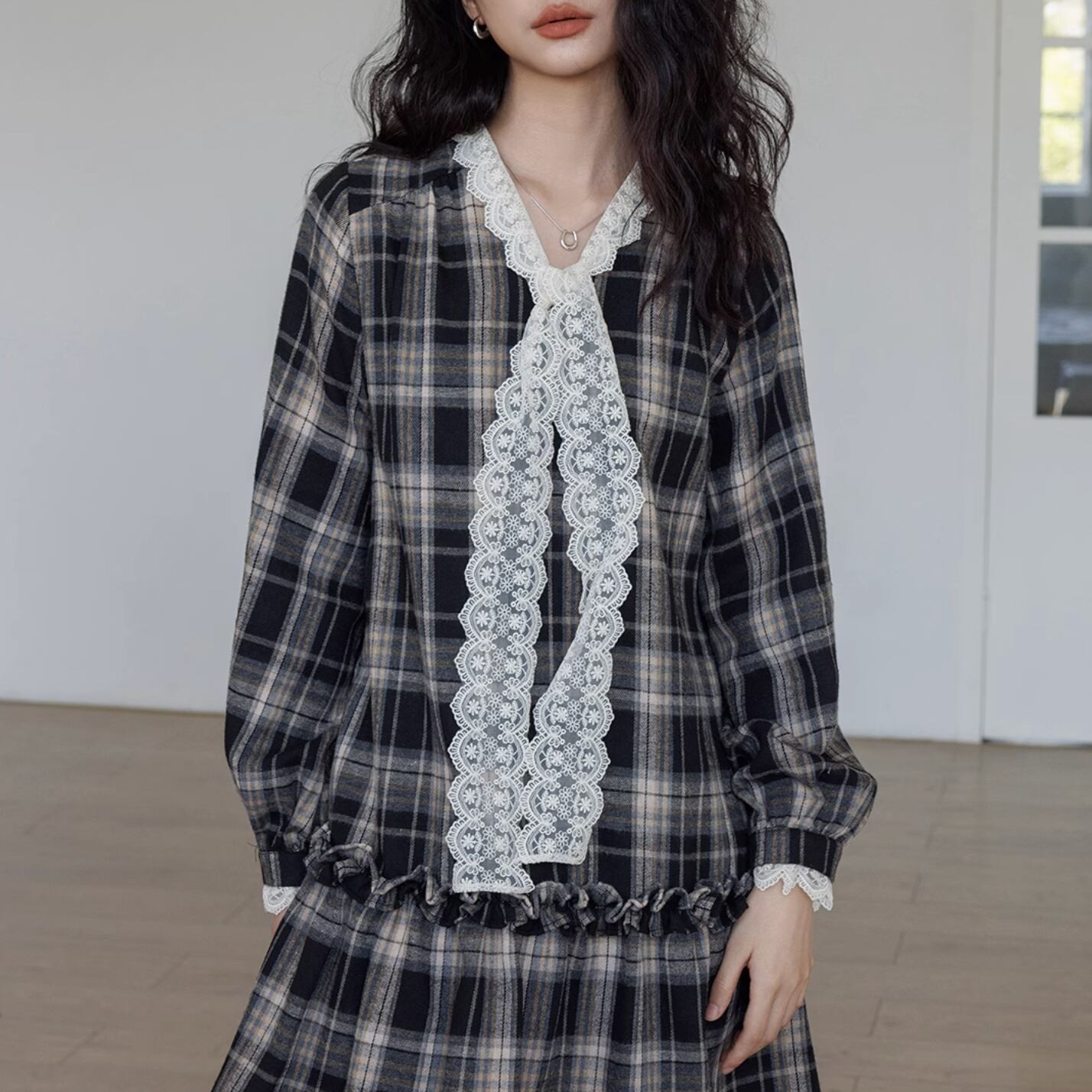 French check long sleeve lace bow tie dress