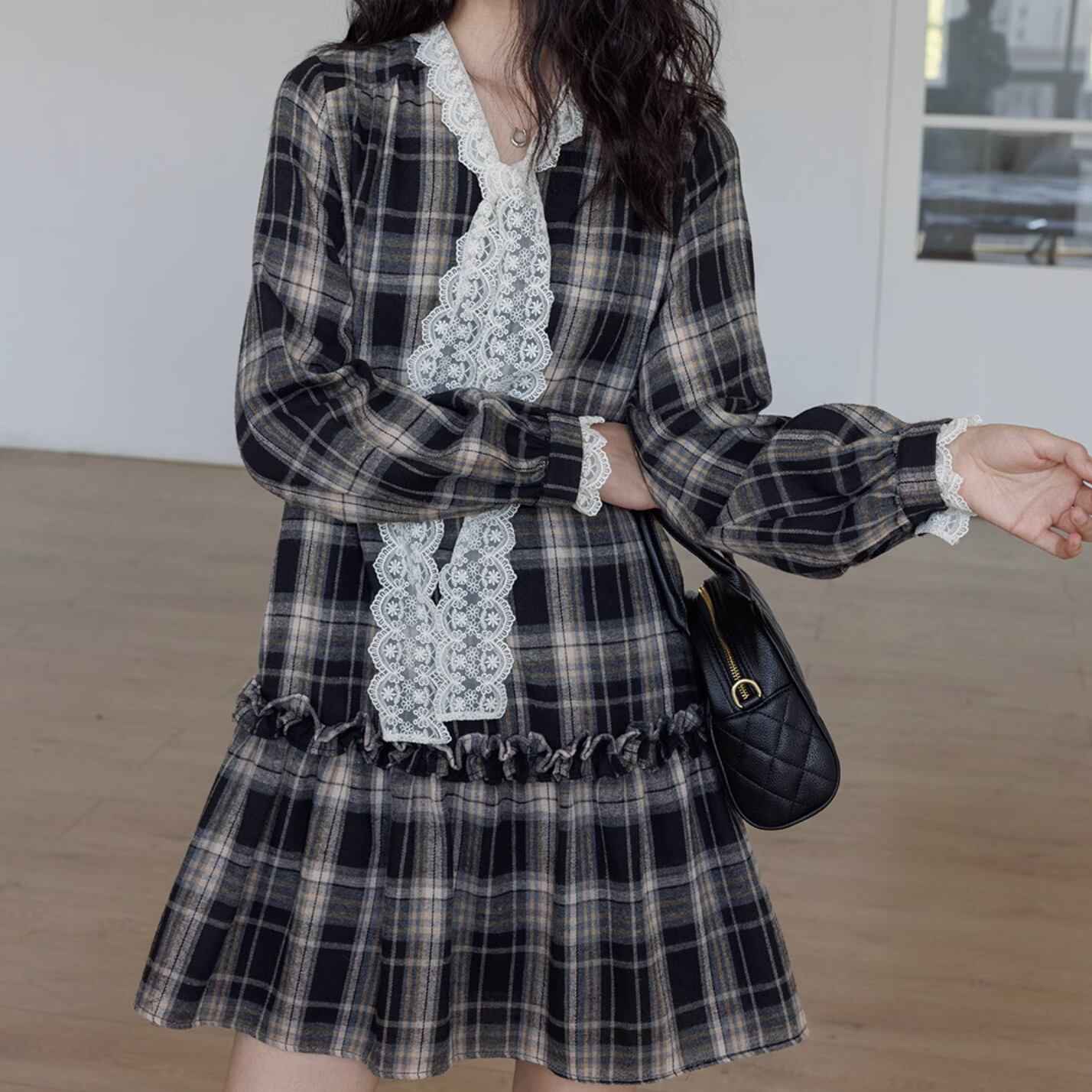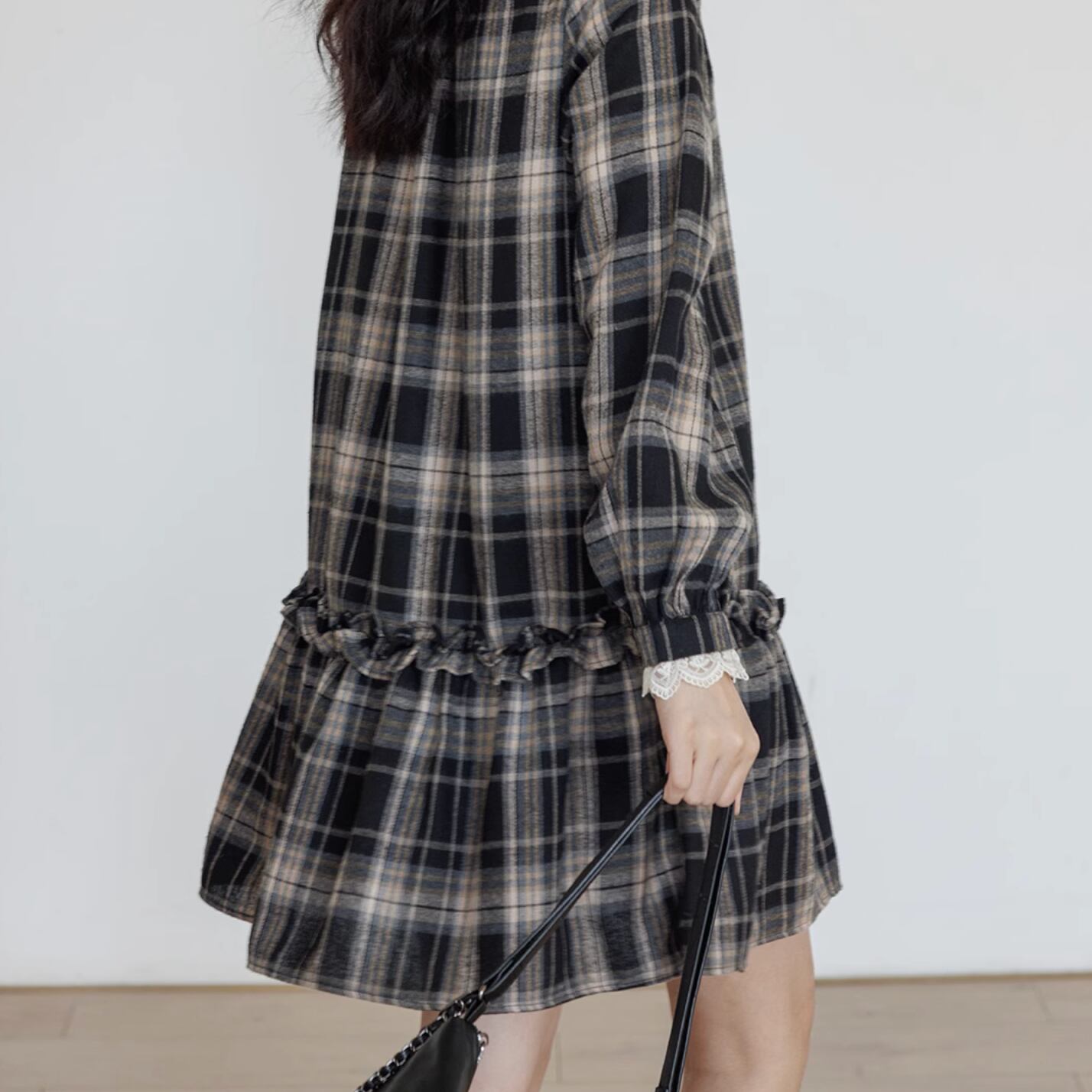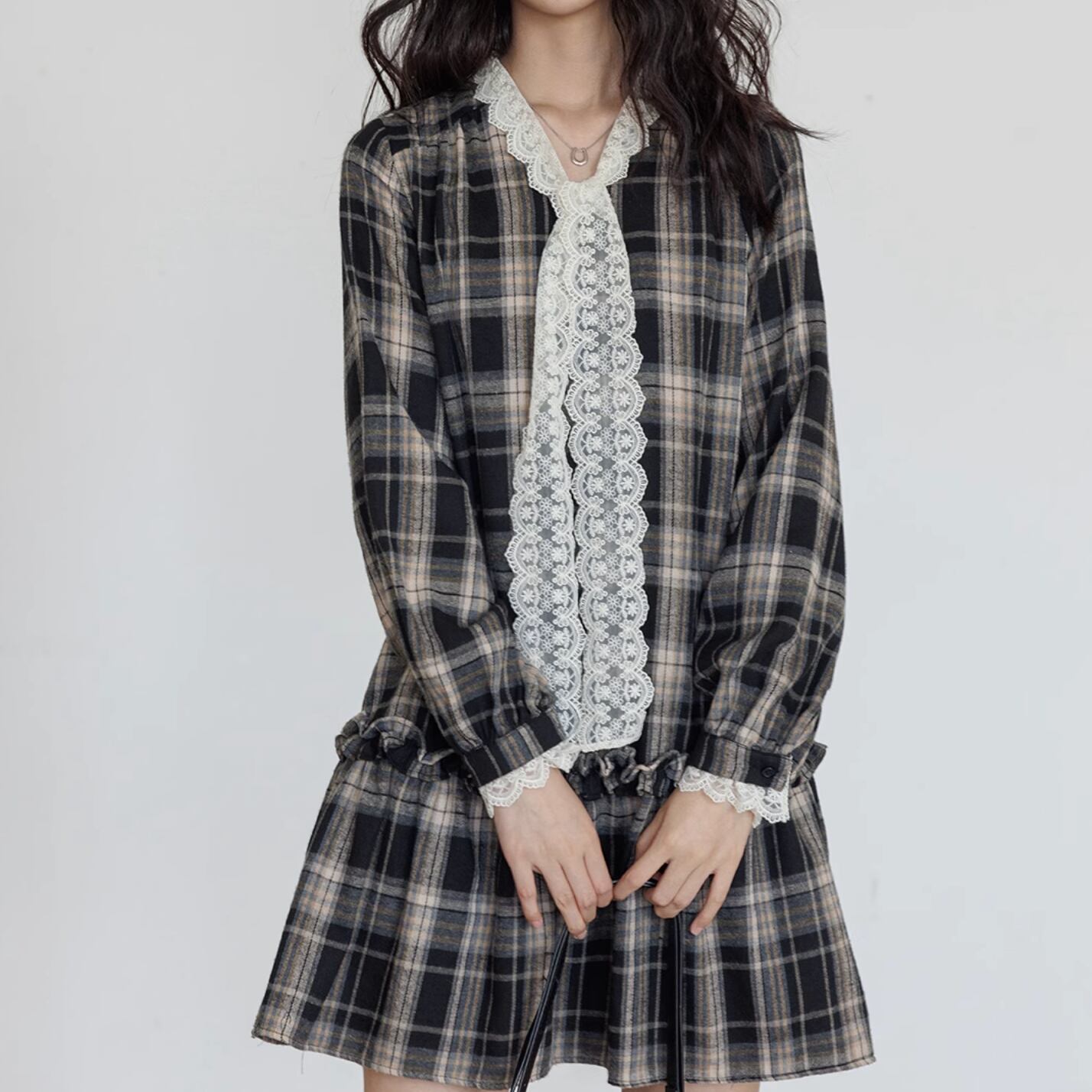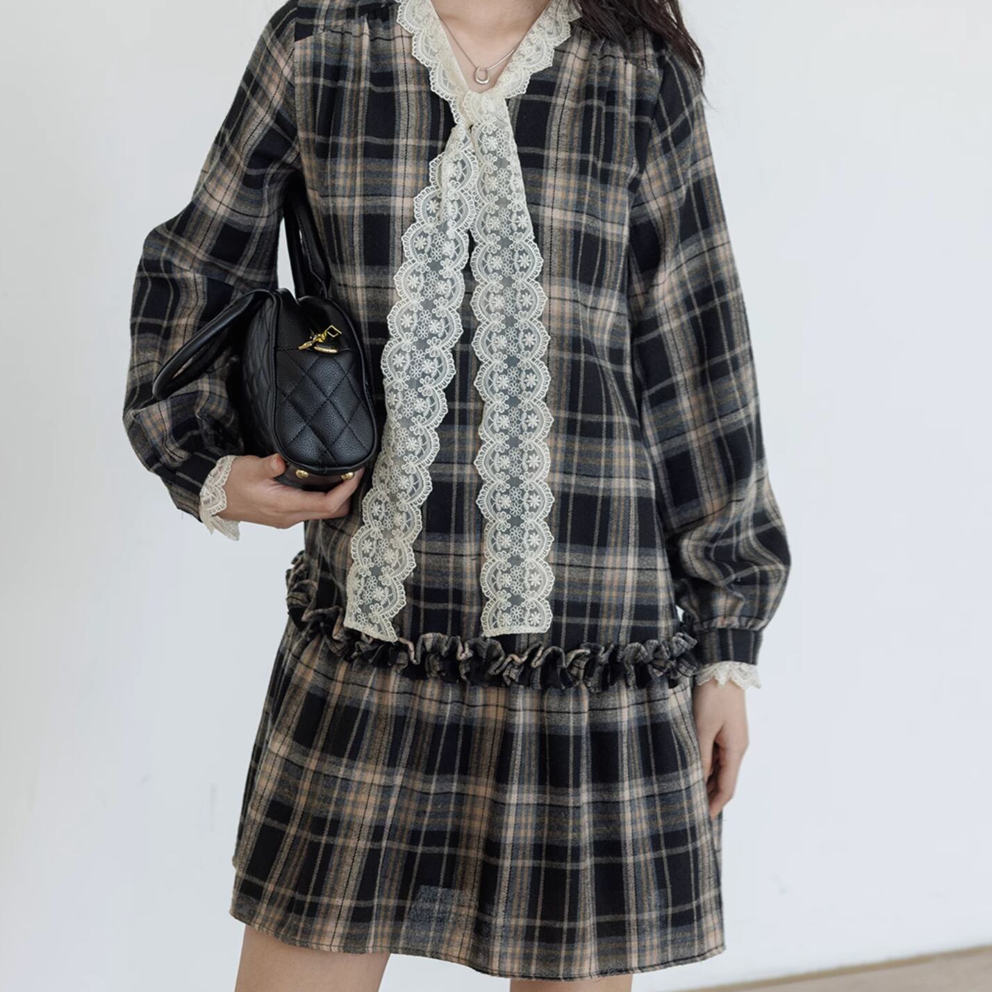 タータンチェックとレースの棒帯が織り交ざったミディアムワンピース。