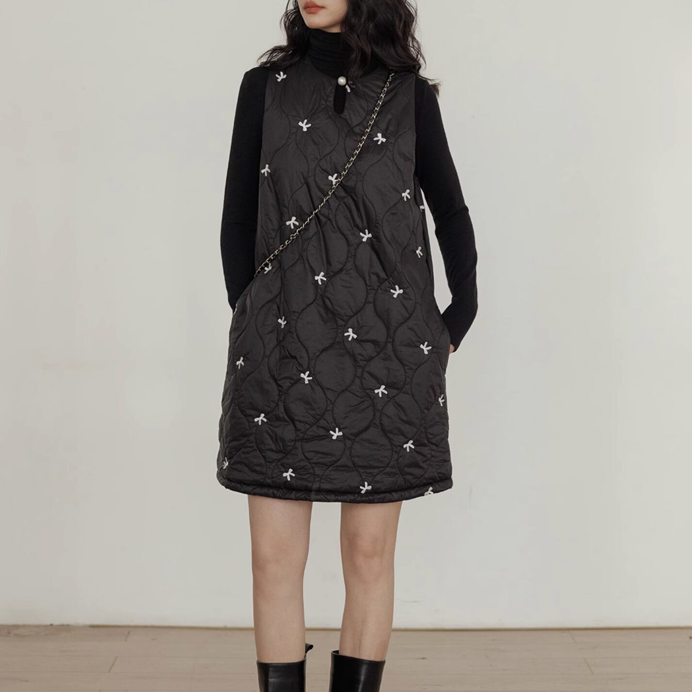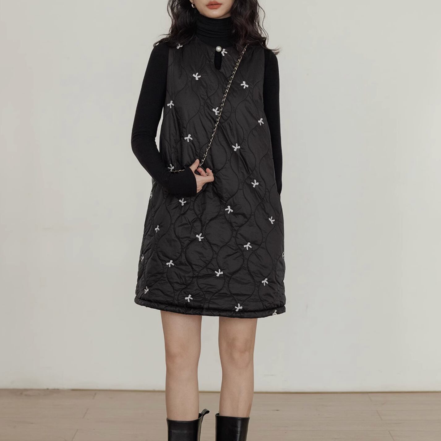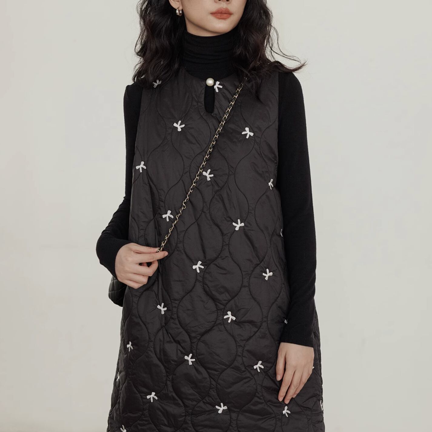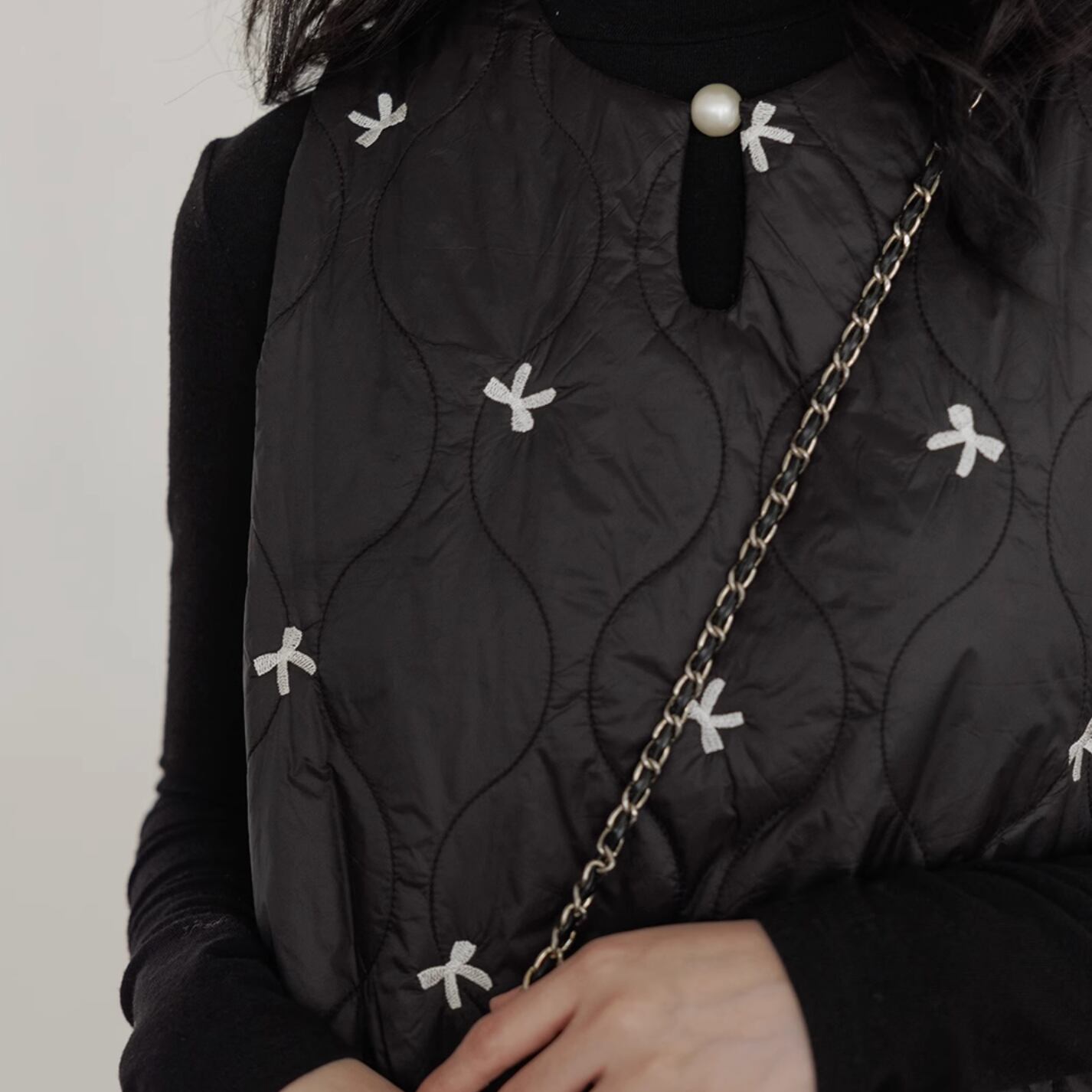 ボリューム感のあるデザインの中で首元のパールがアクセントになっています。