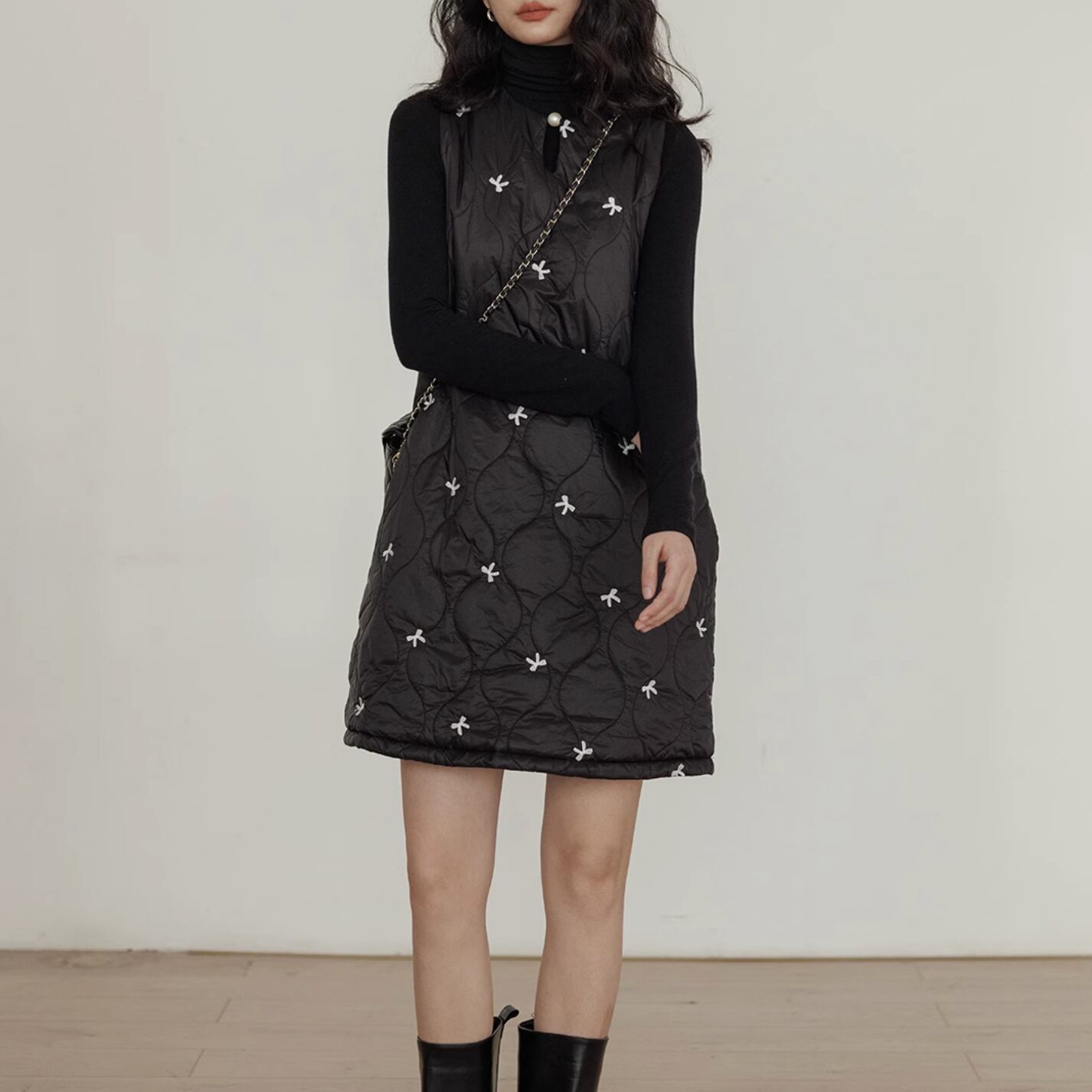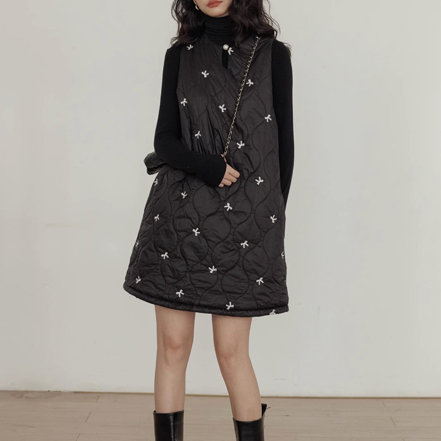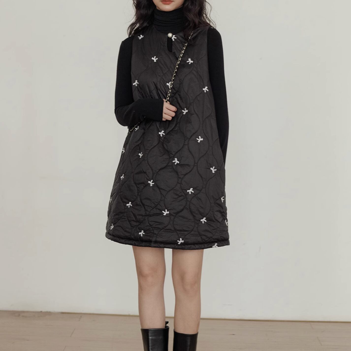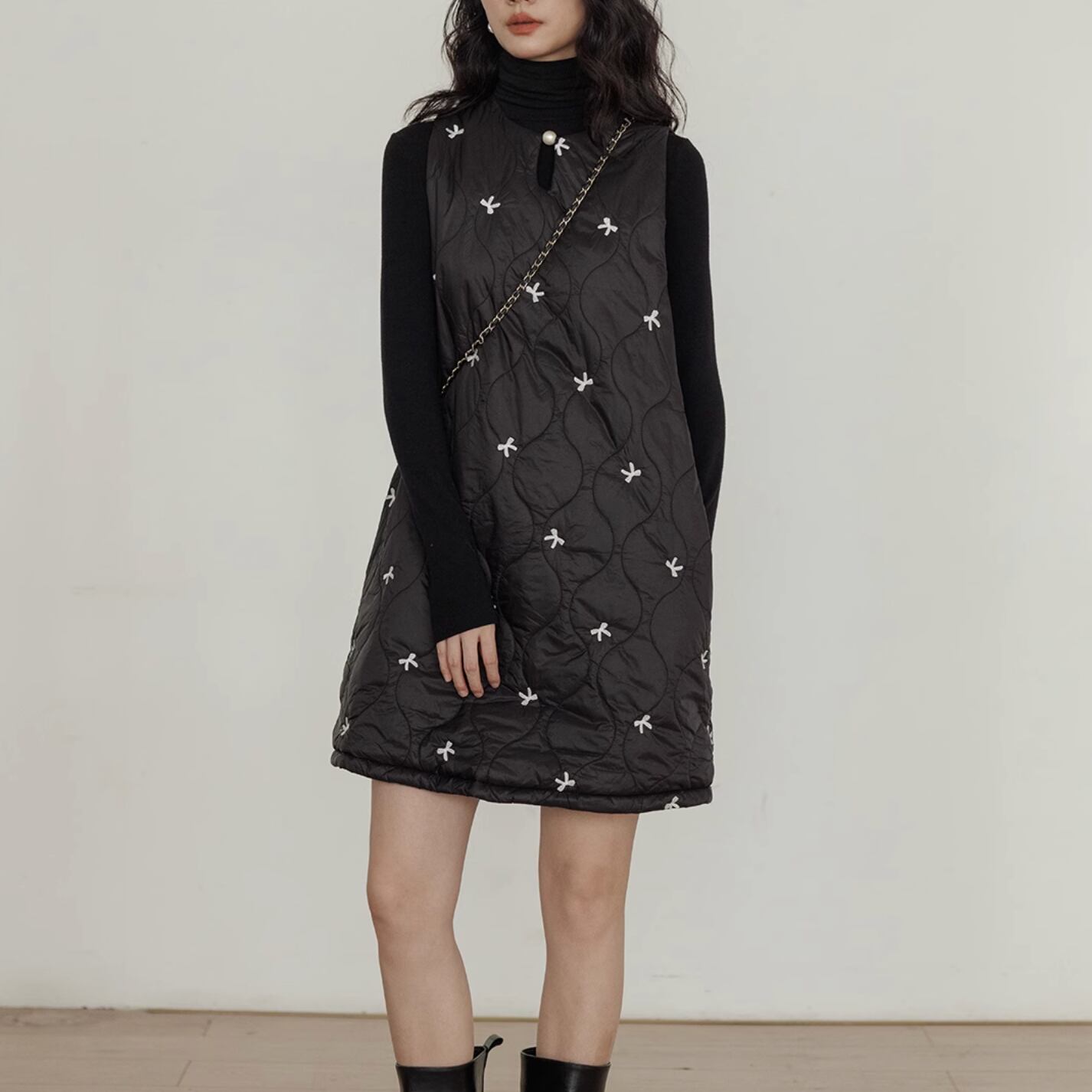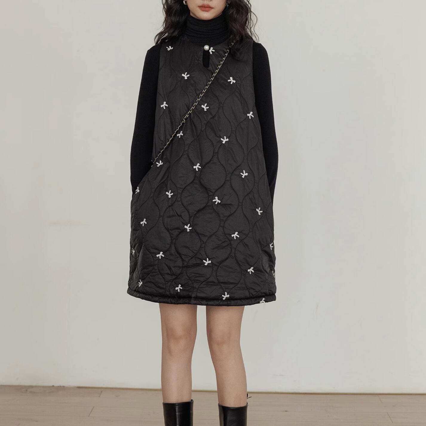 ボリューム感のあるデザインの中で首元のパールがアクセントになっています。