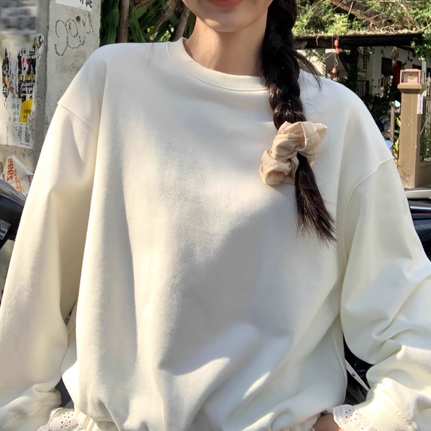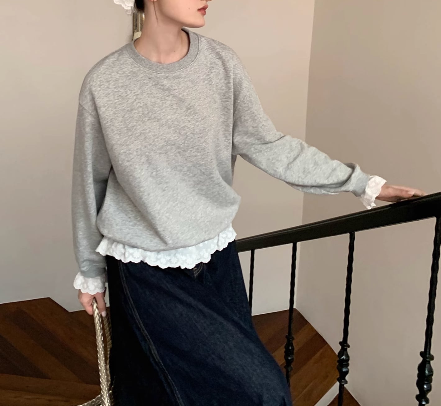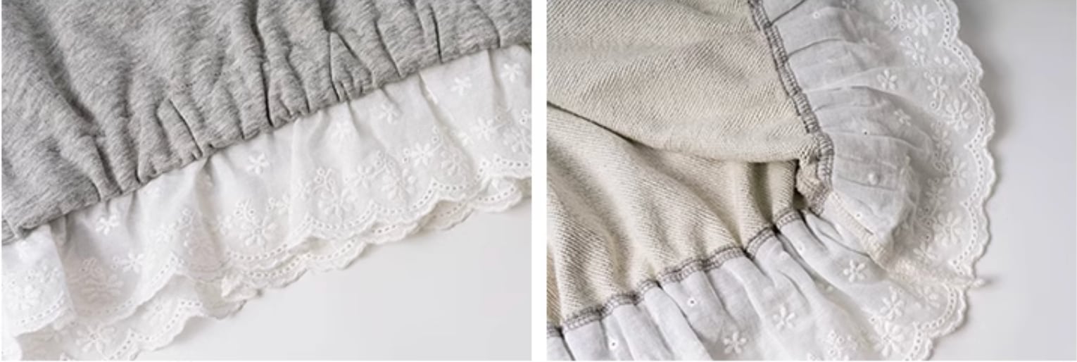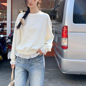 ネックラインは同色のリブでスタイリッシュに仕上げ、肩と背中のラインをすっきりと見せてくレます。ゆったりとした袖と袖口。 裾部分のレースが華やかさを演出してくれます。