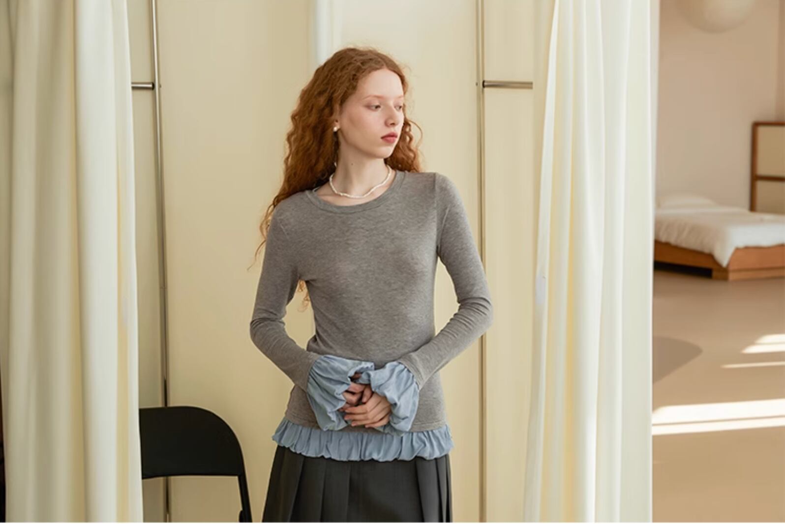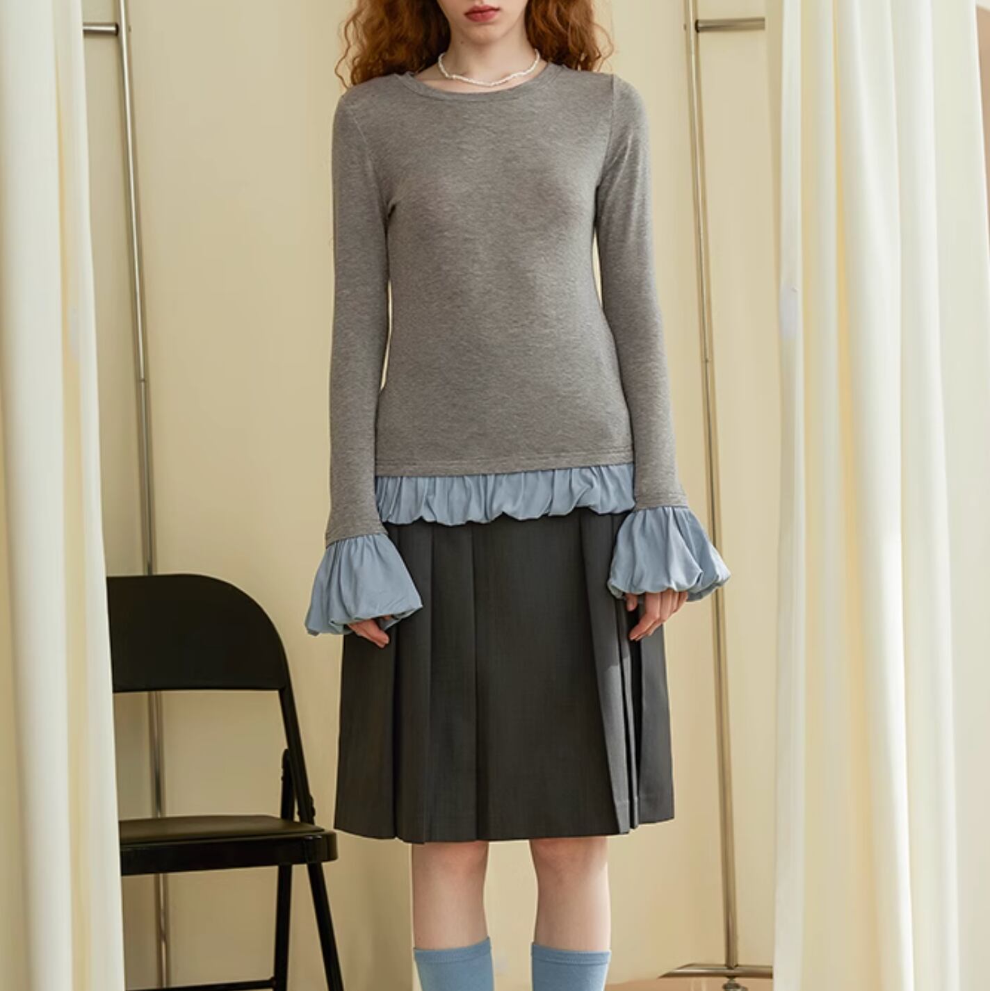 袖口にはフラワーバルーン使用、裾にフリルをあしらったニットトップス。