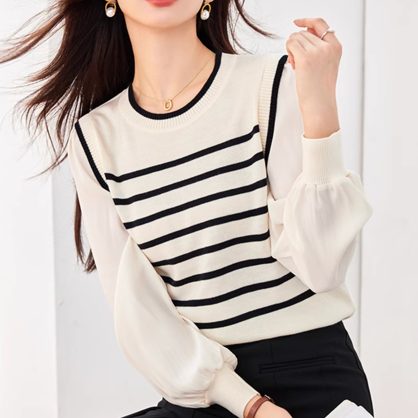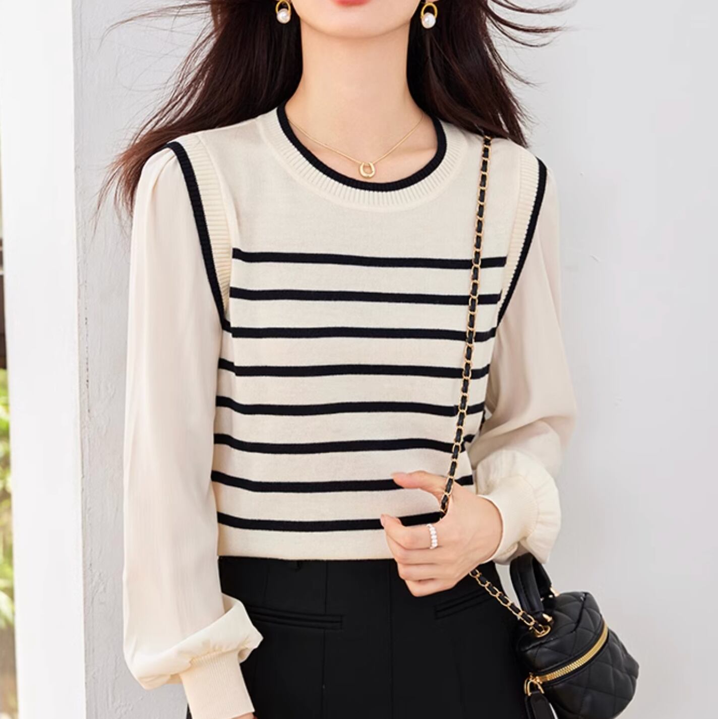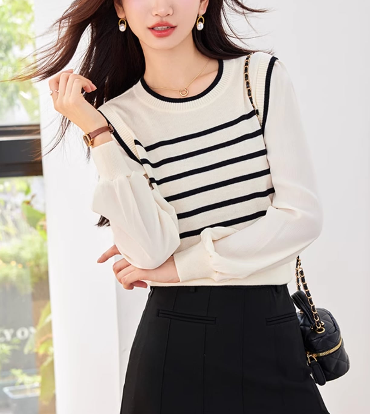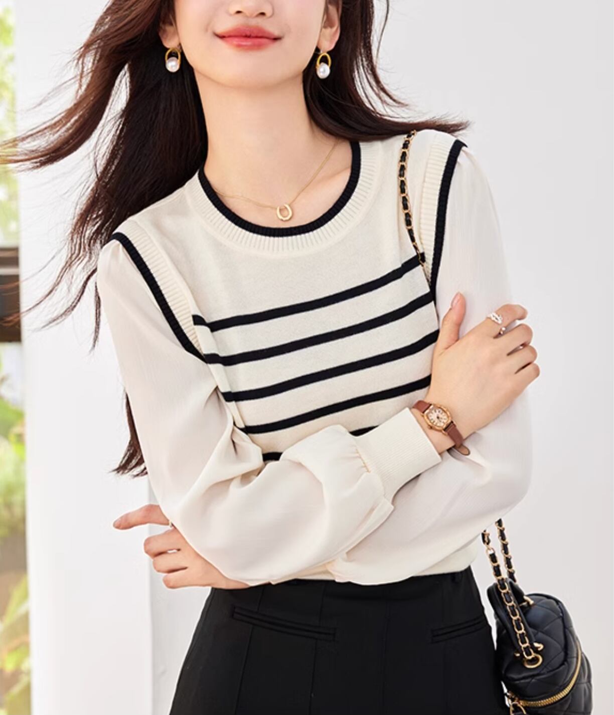 肌触り良いニットブラウス:柔らかな風合いと気持ちの良い肌触りが特徴です。素材は柔らかく伸縮性がよい生地感でチクチク感じません。軽くて着心地よく疲れません。重ね着風のフェイクレイヤードデザイン、簡単に秋冬の洒落感を手に入れます