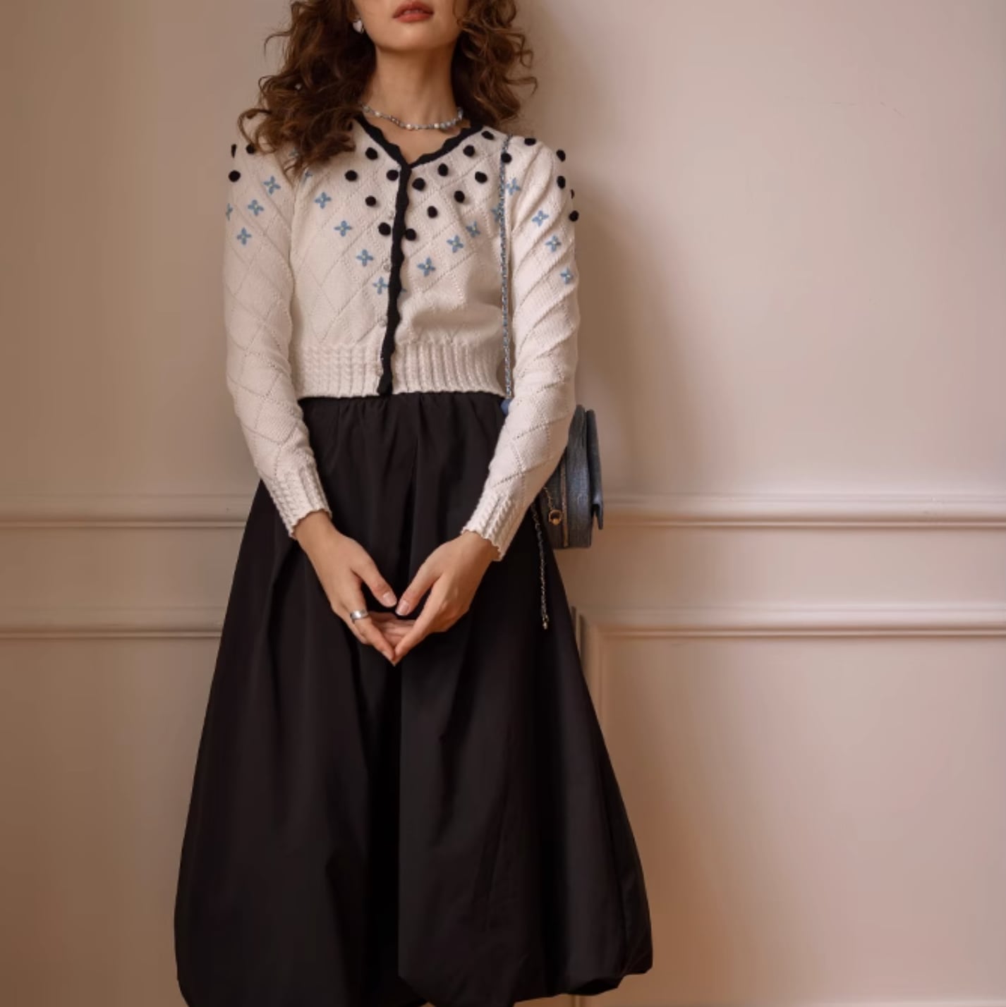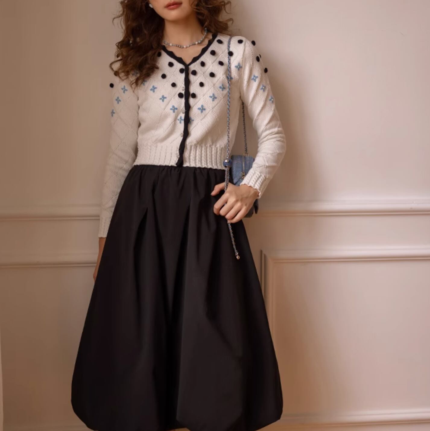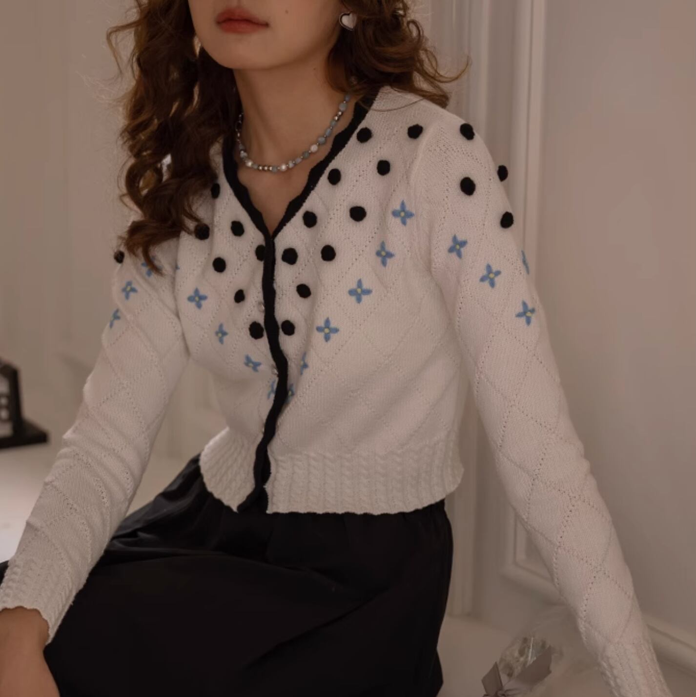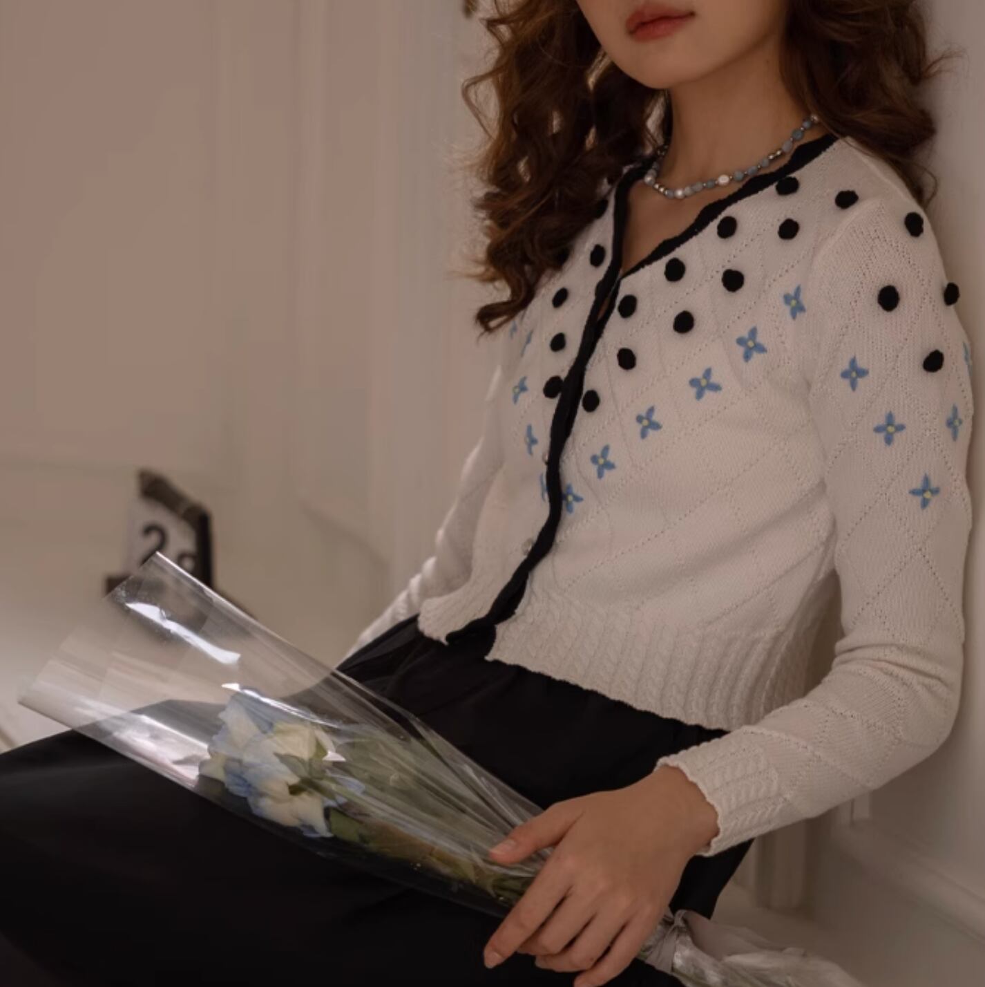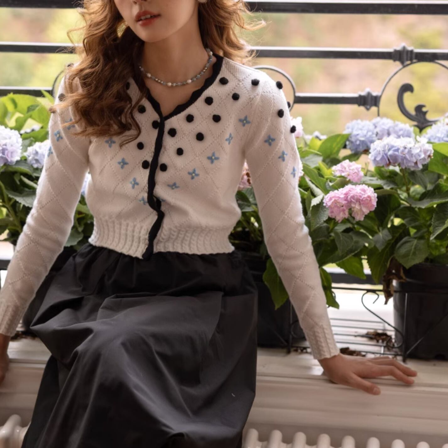 ぽこぽことした黒いポンポンにブルーのフラワー刺繍