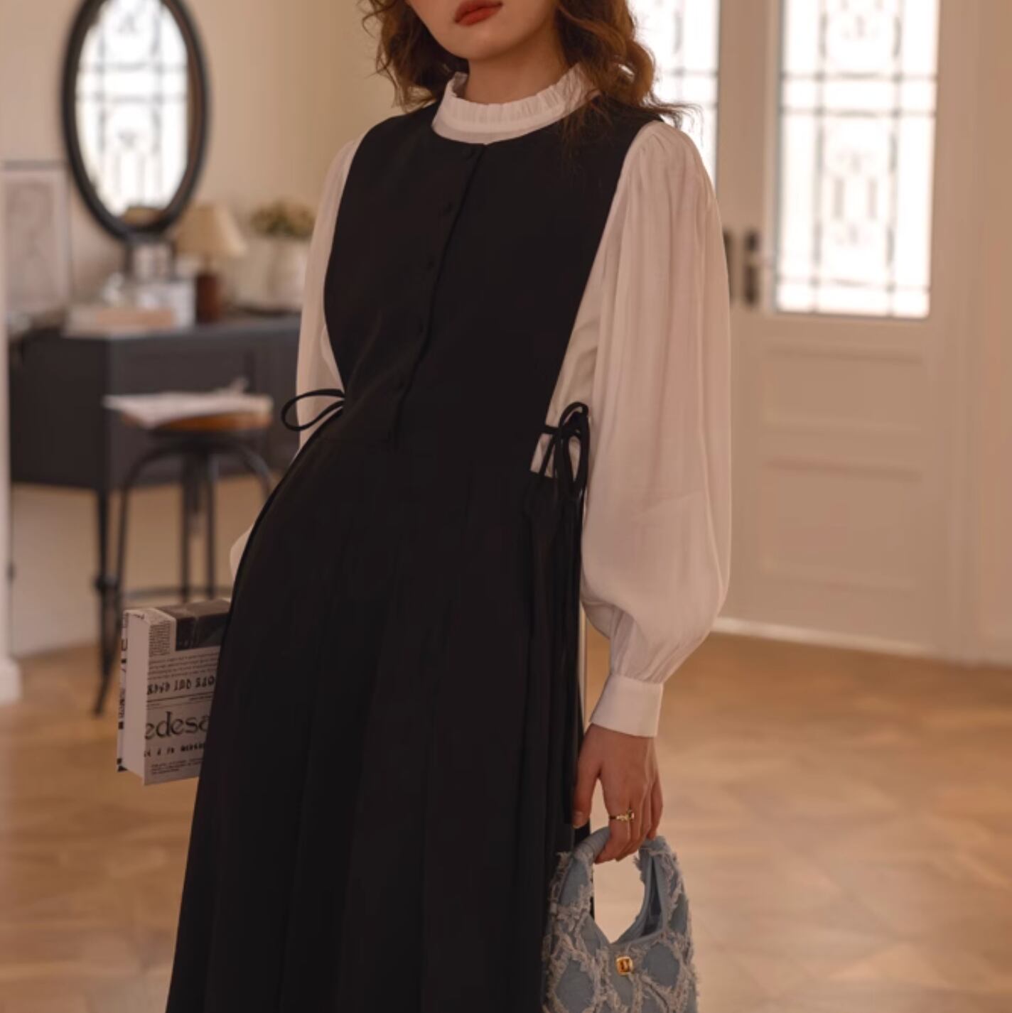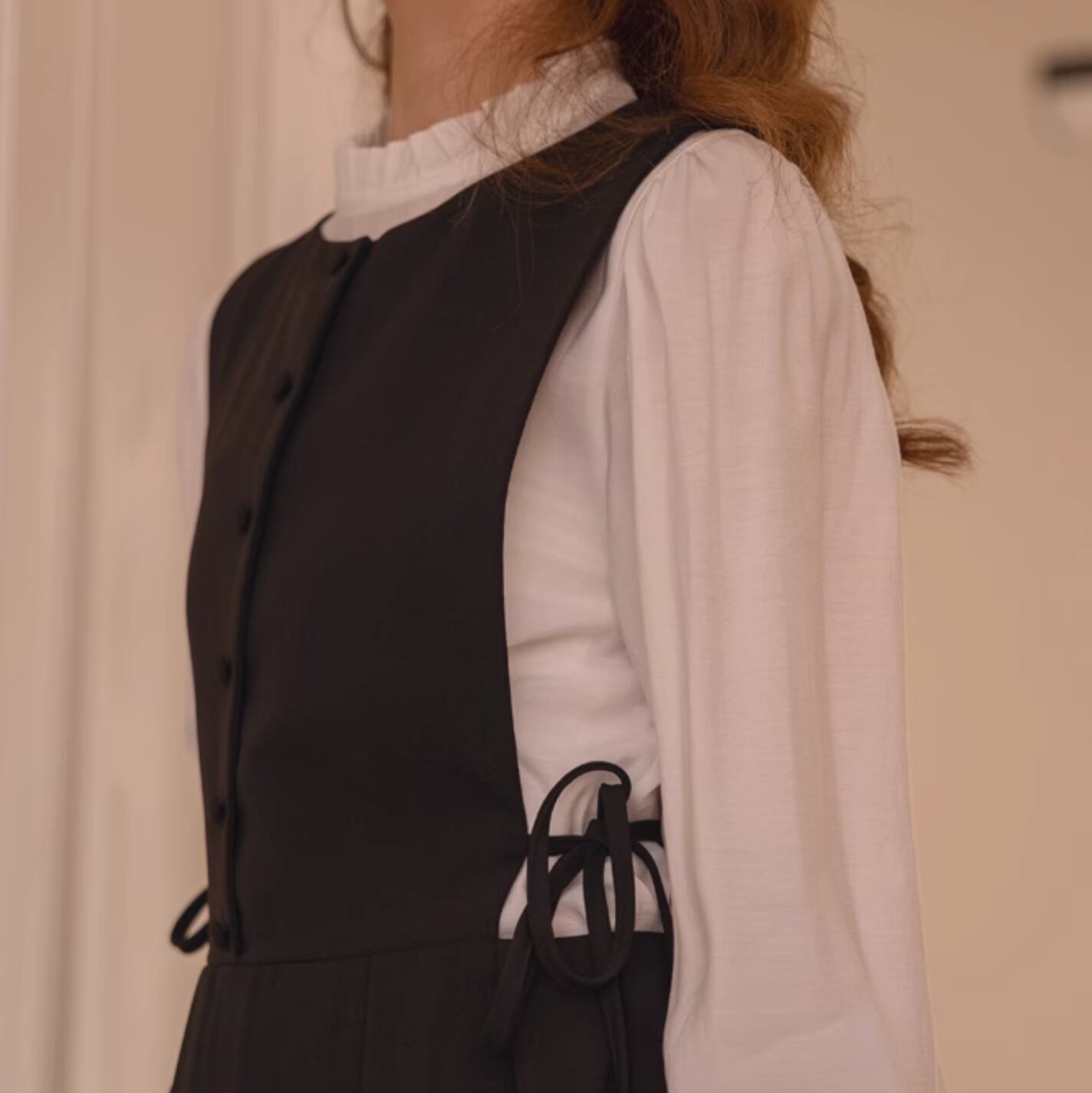 ブラウスはネック部分に上品なフリルとボディ両サイドにステッチ装飾がされており