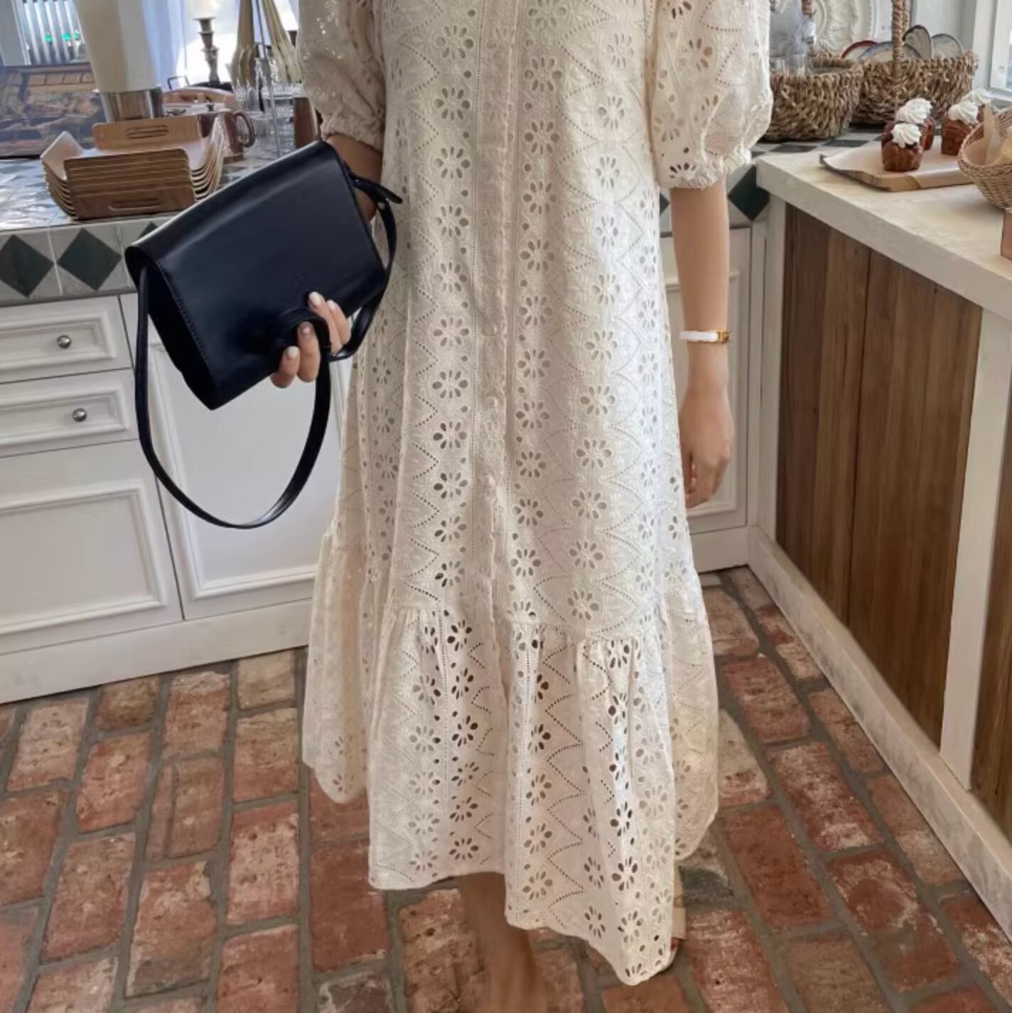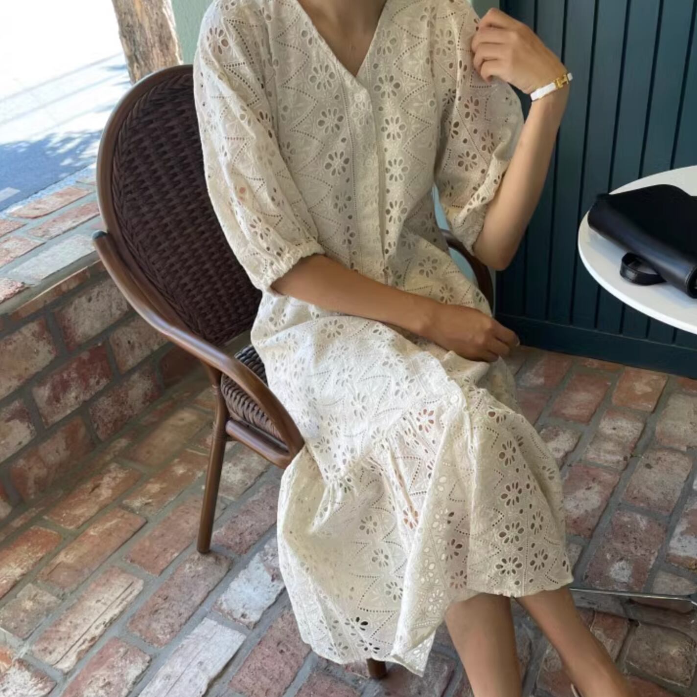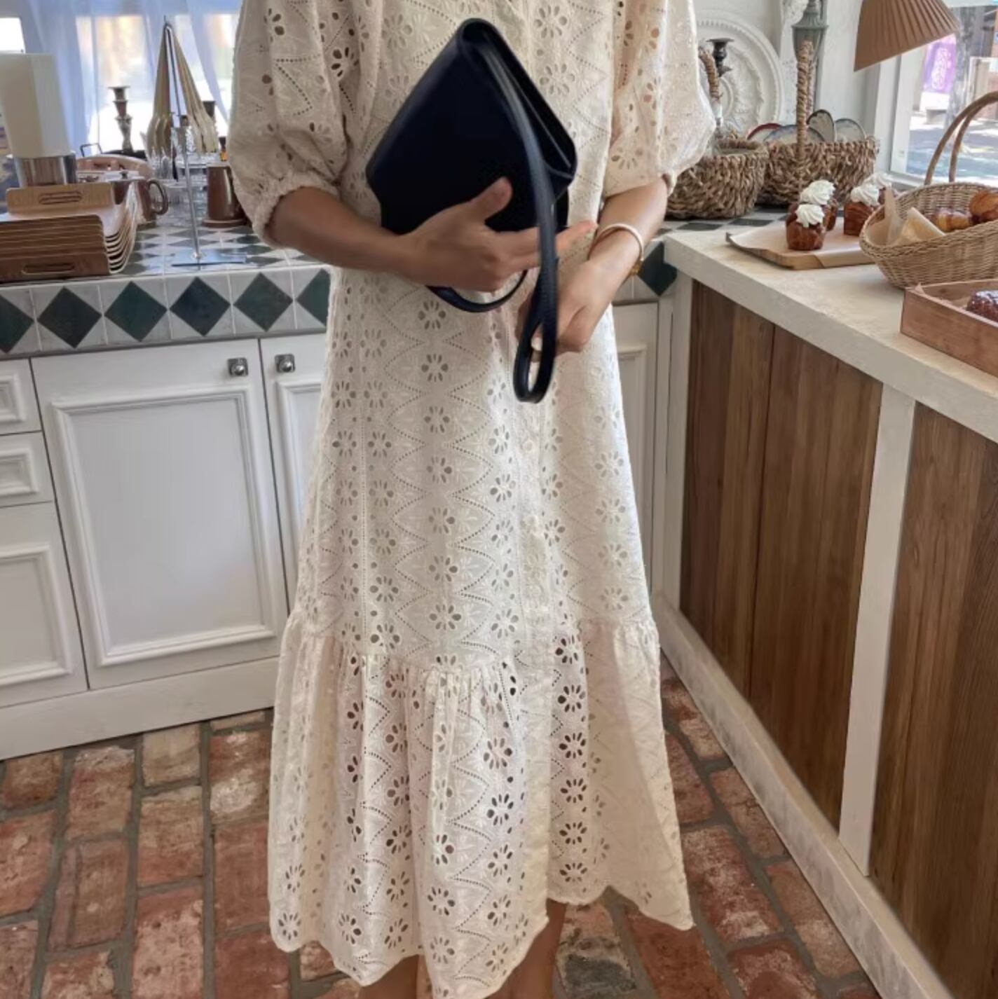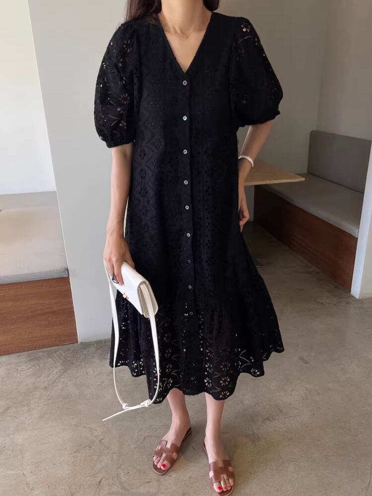 レトロスタイルな幾何学模様のパンチングレースが可愛いドレスです。