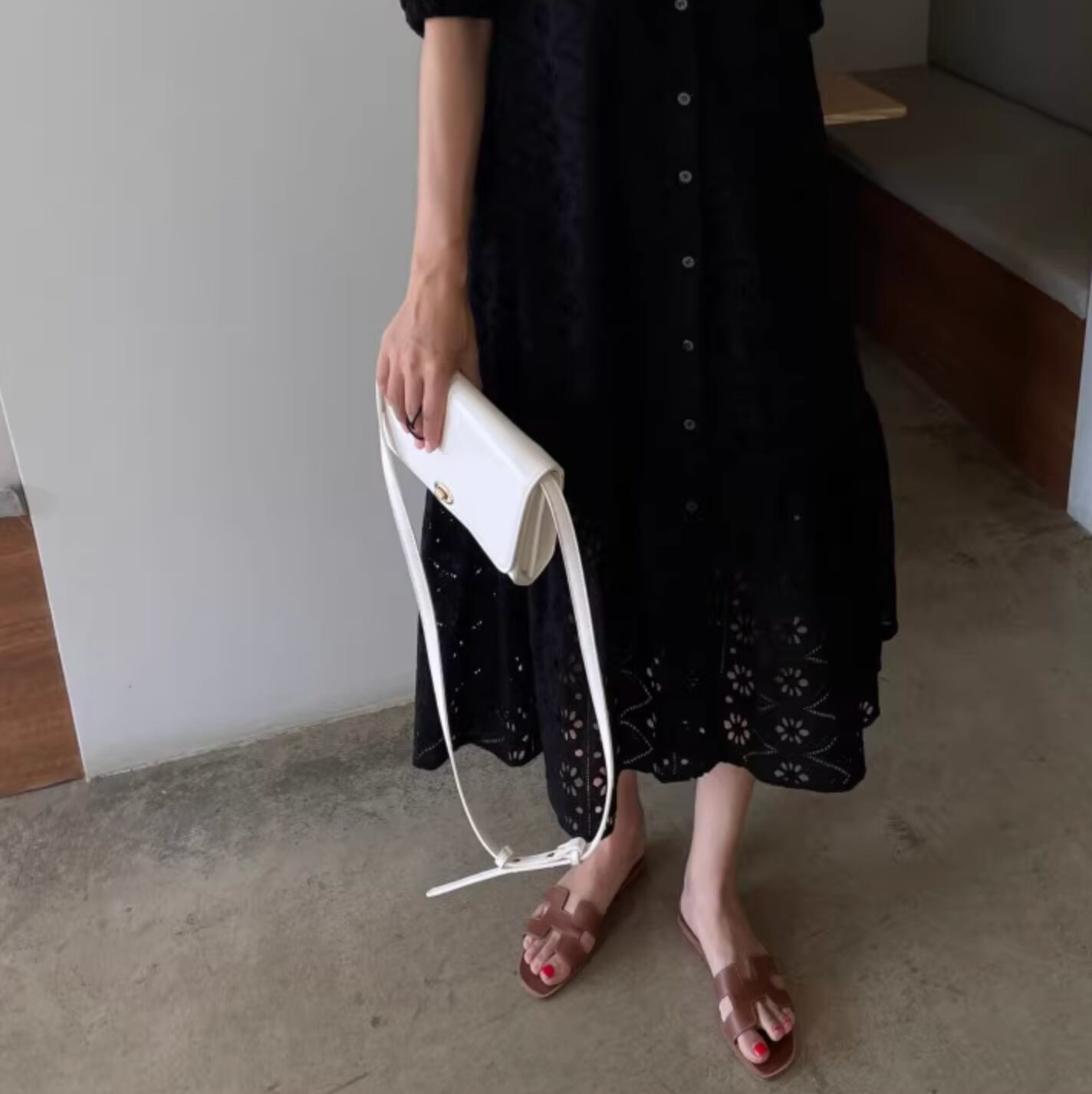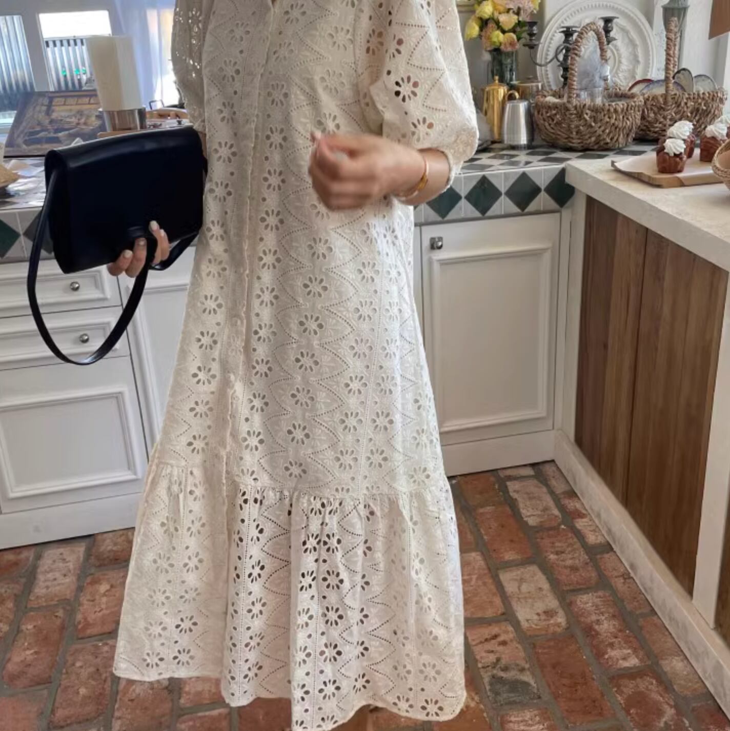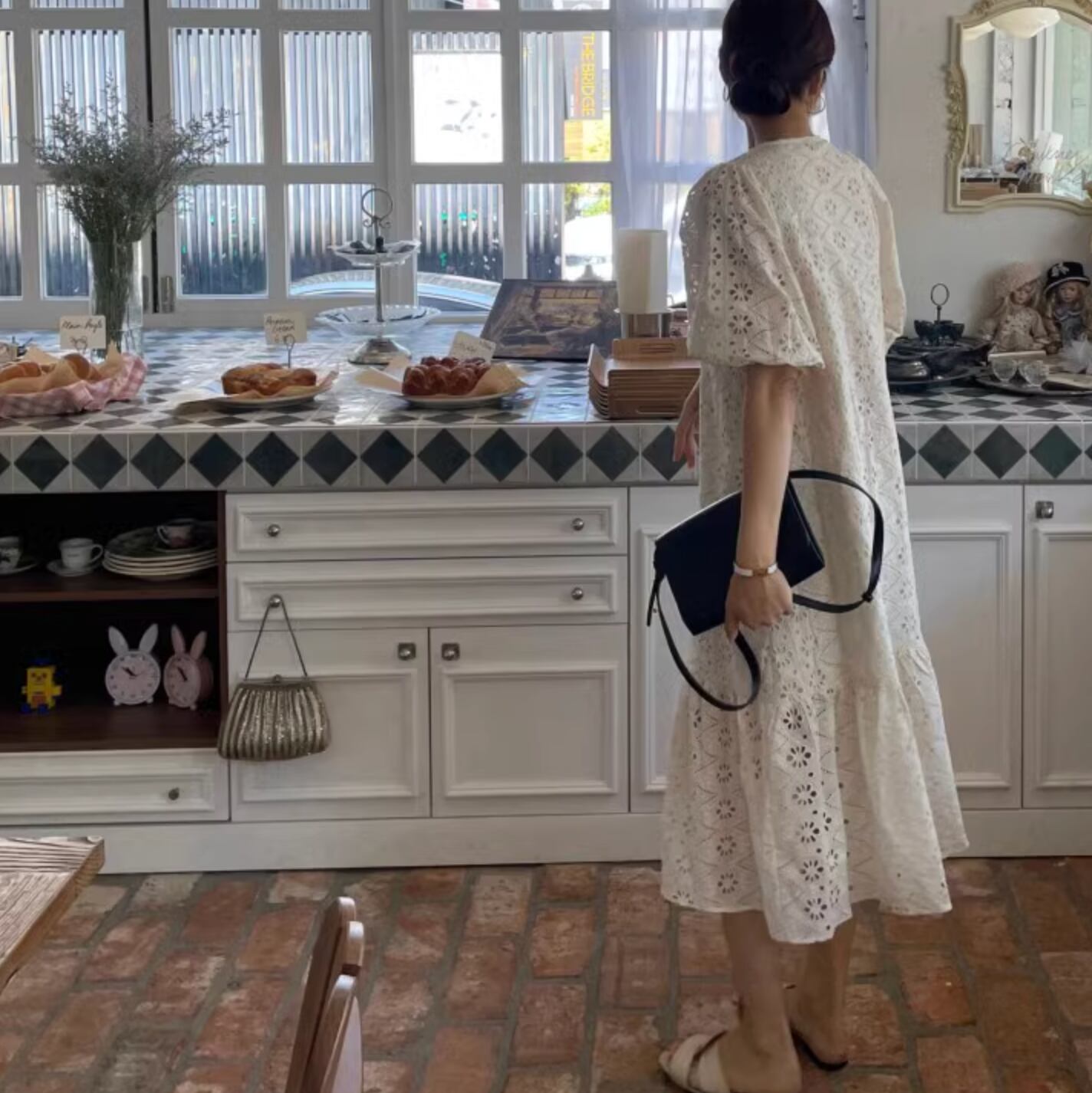 レトロスタイルな幾何学模様のパンチングレースが可愛いドレスです。