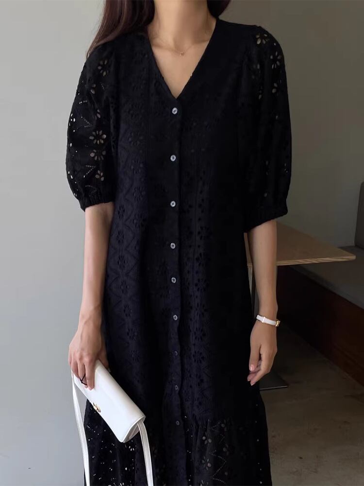 Lace jacquard loose frill short sleeve dress