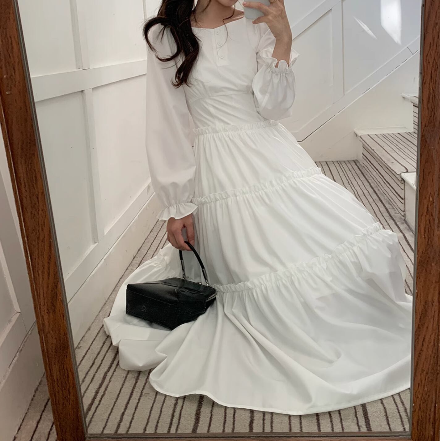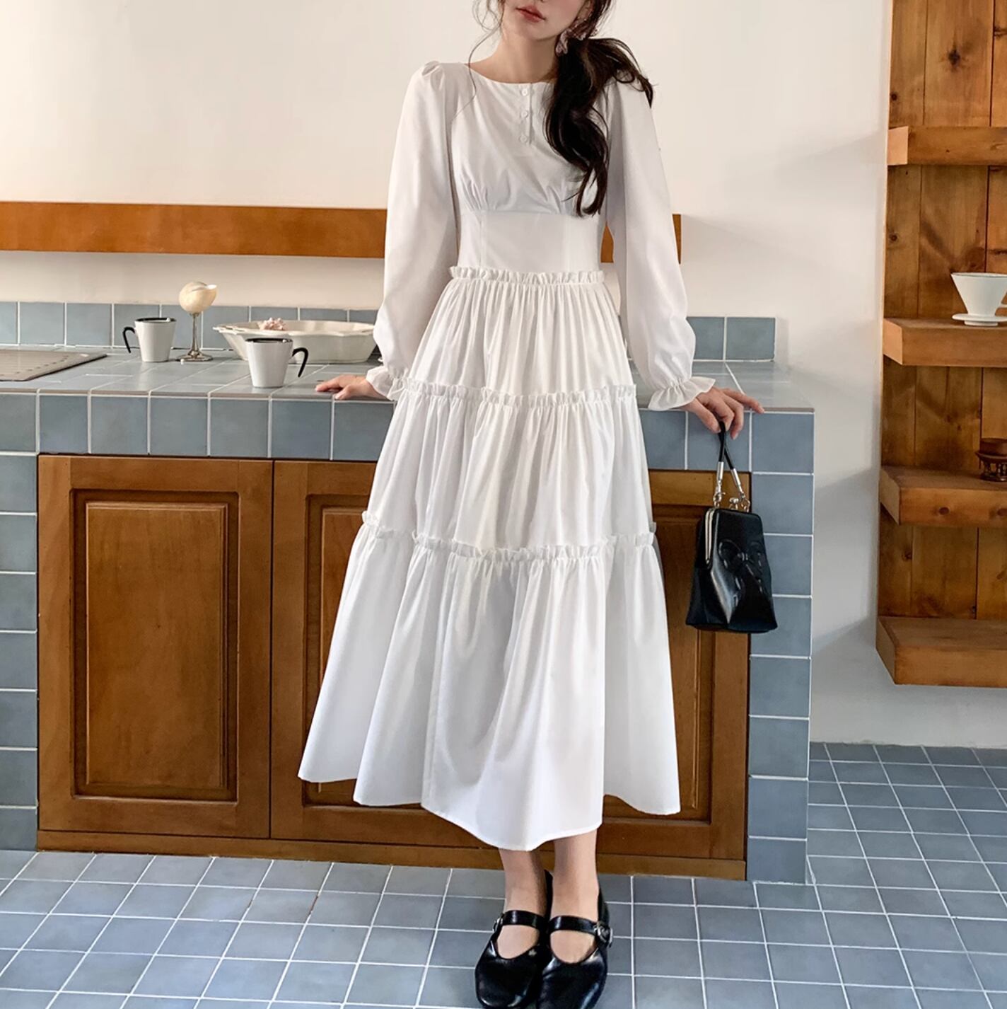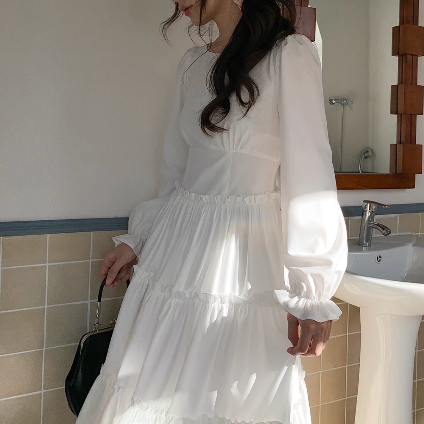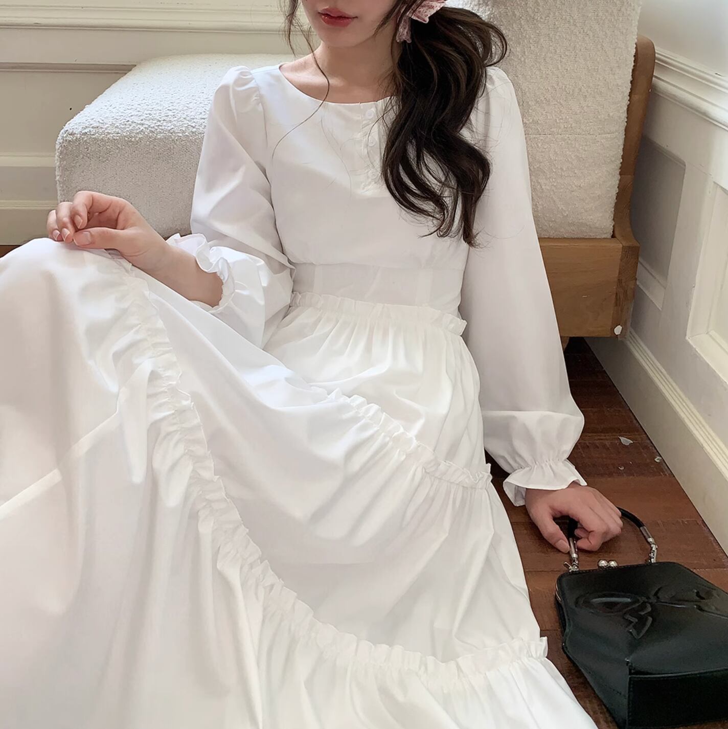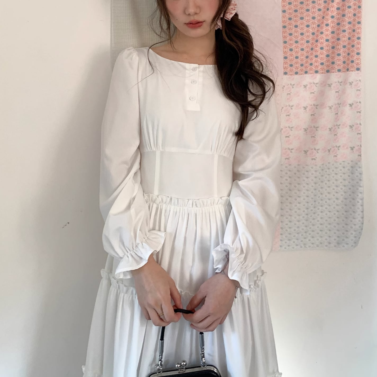 さらりと着こなせます。作りも繊細でプリーツショルダー、パフスリーブ、ストレートショルダーシェイプがより上品に素敵な印象を与えます。ハイウエスト位置のセグメンテーションデザインがウエストを細く見せてくれます。歩くたびにフワフワ広がるスカートが気分を上げてくれます。