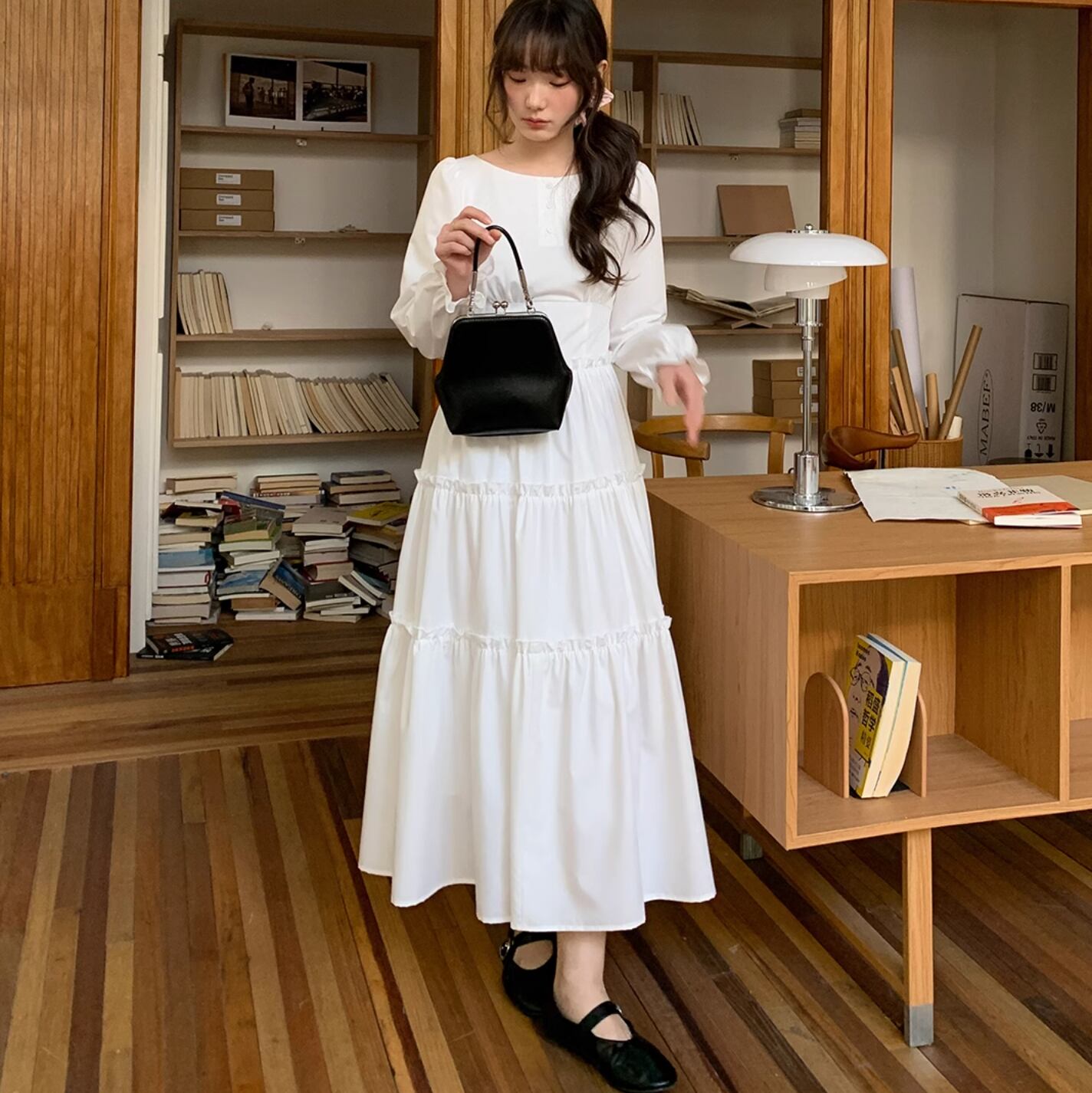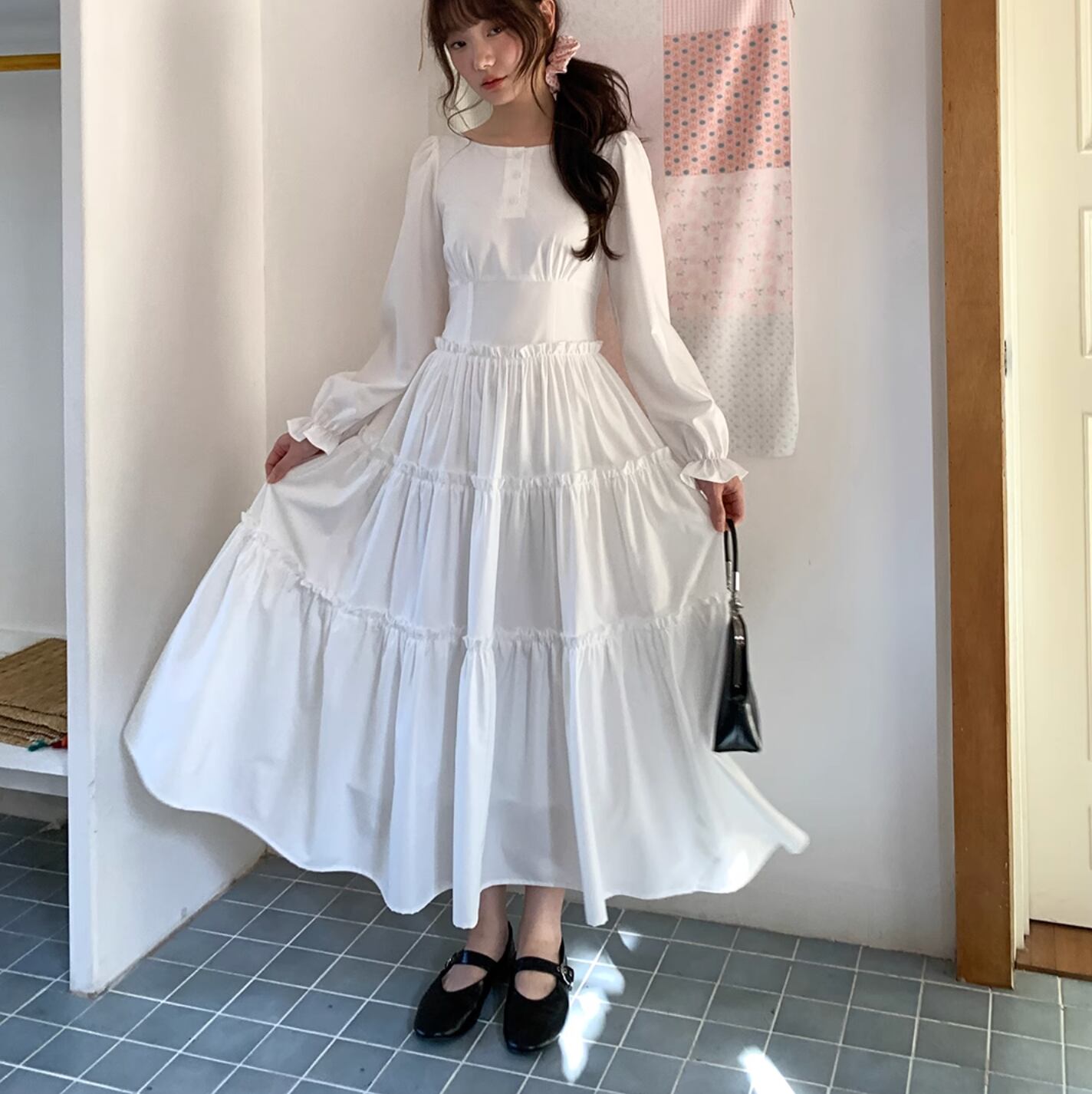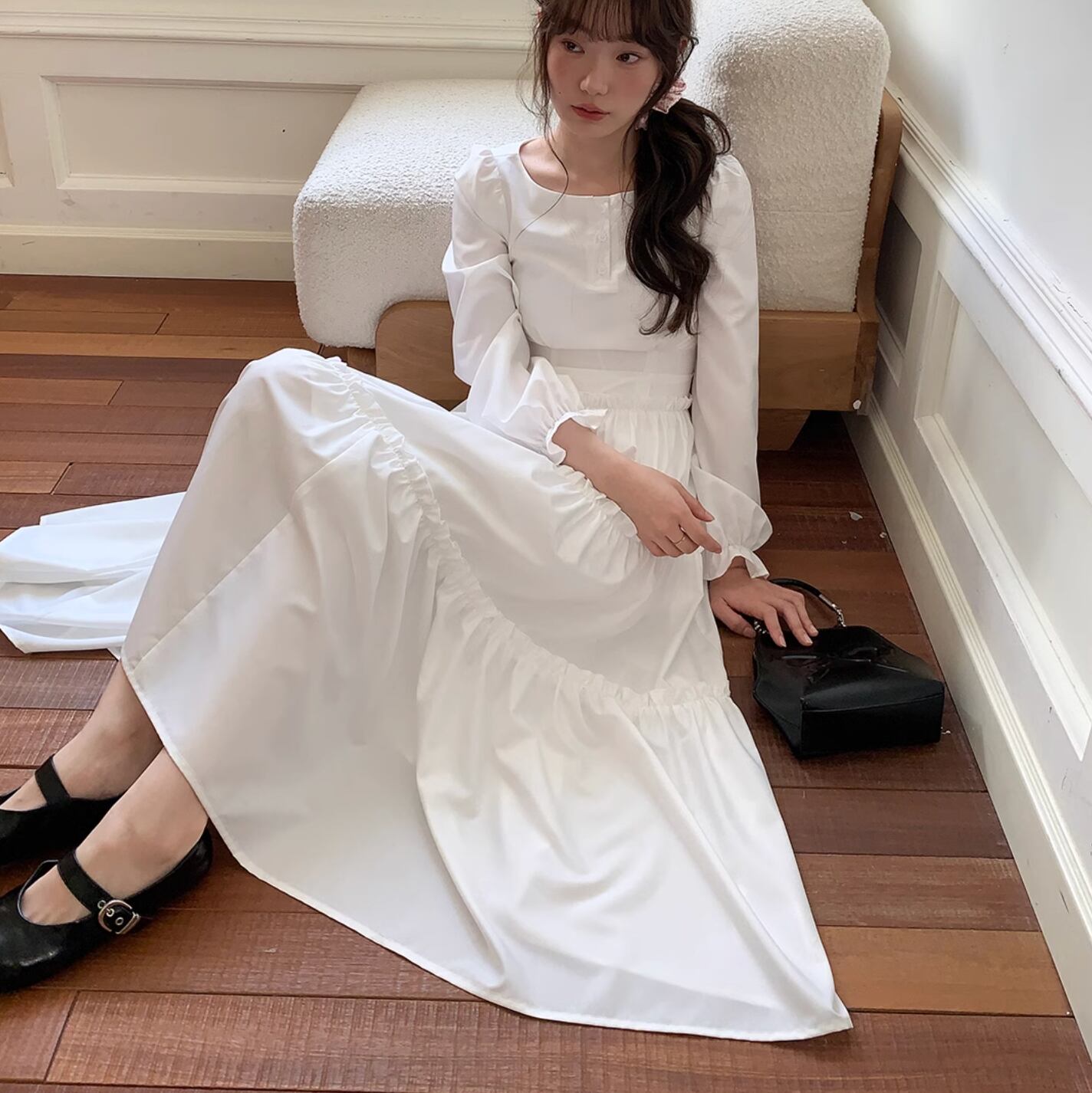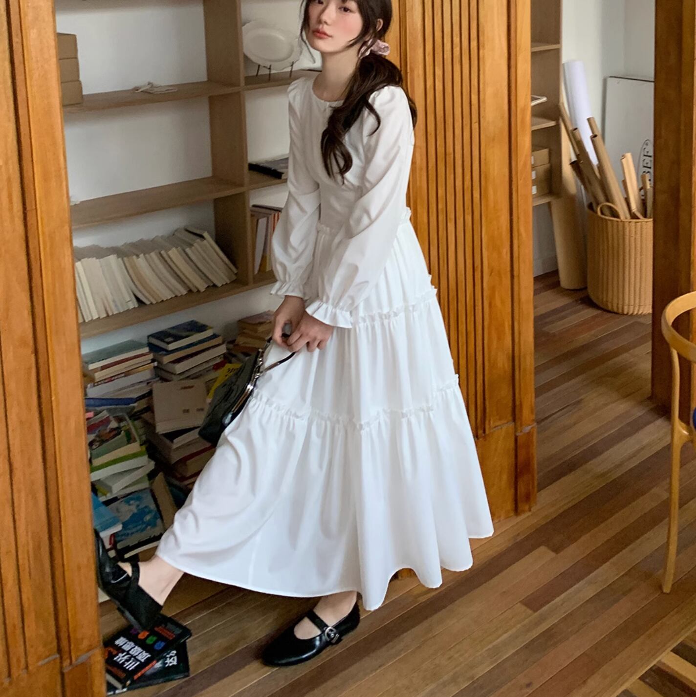 さらりと着こなせます。作りも繊細でプリーツショルダー、パフスリーブ、ストレートショルダーシェイプがより上品に素敵な印象を与えます。ハイウエスト位置のセグメンテーションデザインがウエストを細く見せてくれます。歩くたびにフワフワ広がるスカートが気分を上げてくれます。