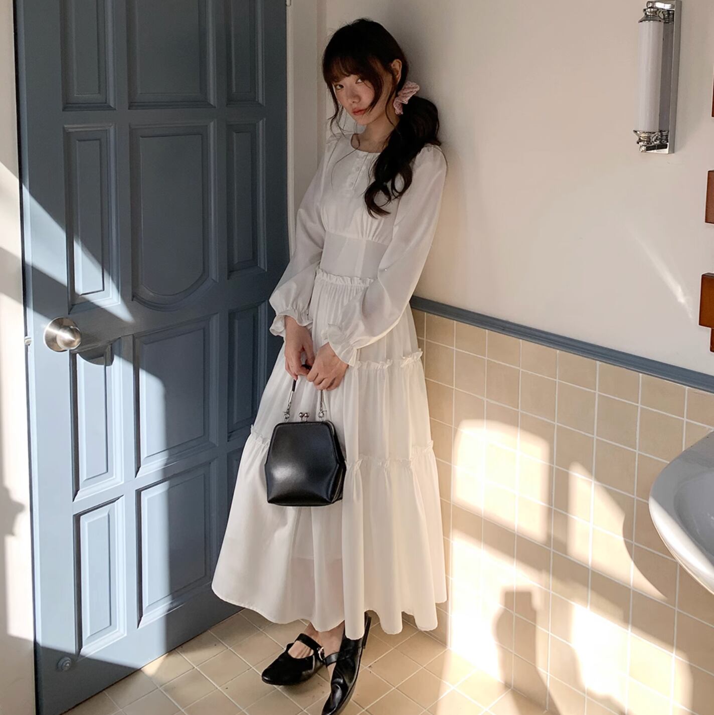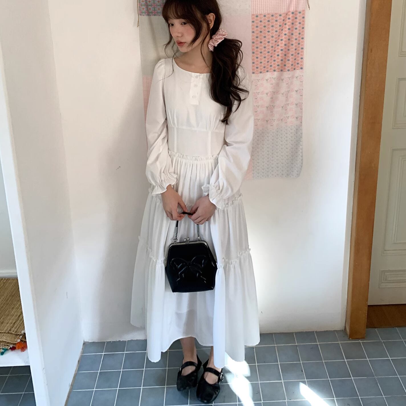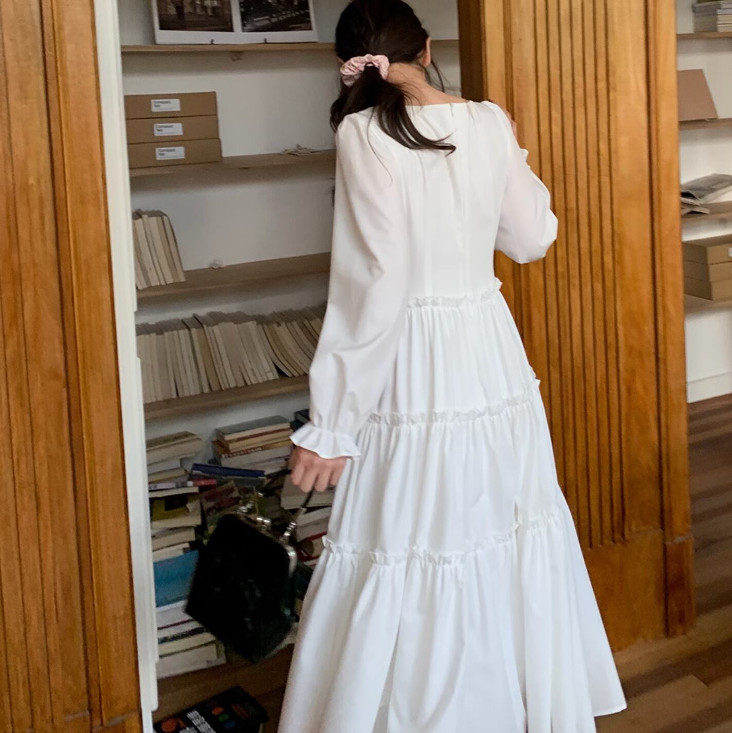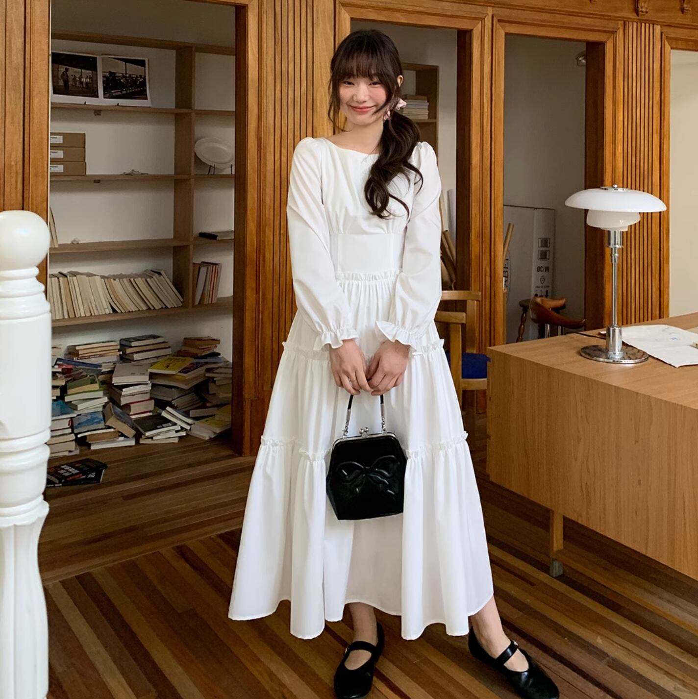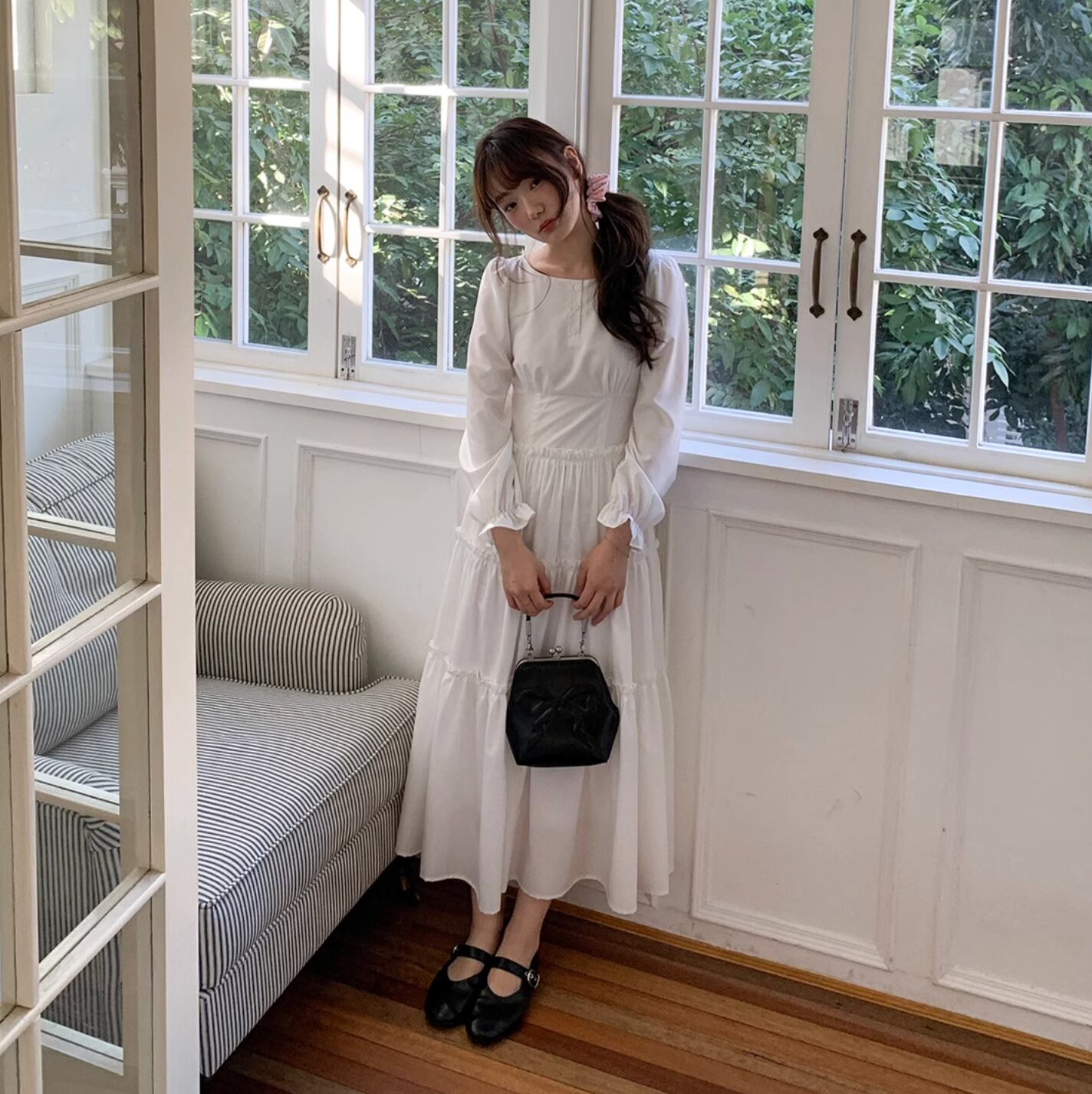 さらりと着こなせます。作りも繊細でプリーツショルダー、パフスリーブ、ストレートショルダーシェイプがより上品に素敵な印象を与えます。ハイウエスト位置のセグメンテーションデザインがウエストを細く見せてくれます。歩くたびにフワフワ広がるスカートが気分を上げてくれます。